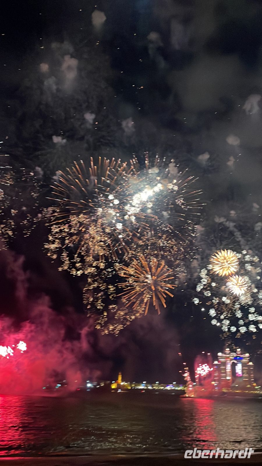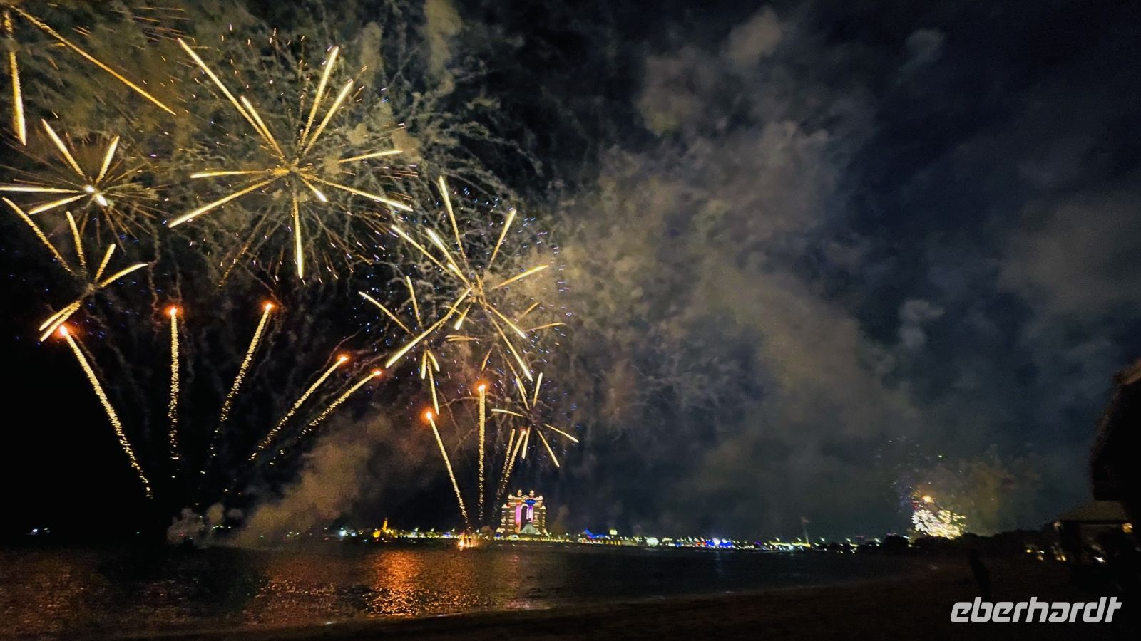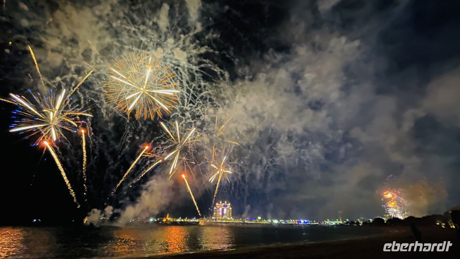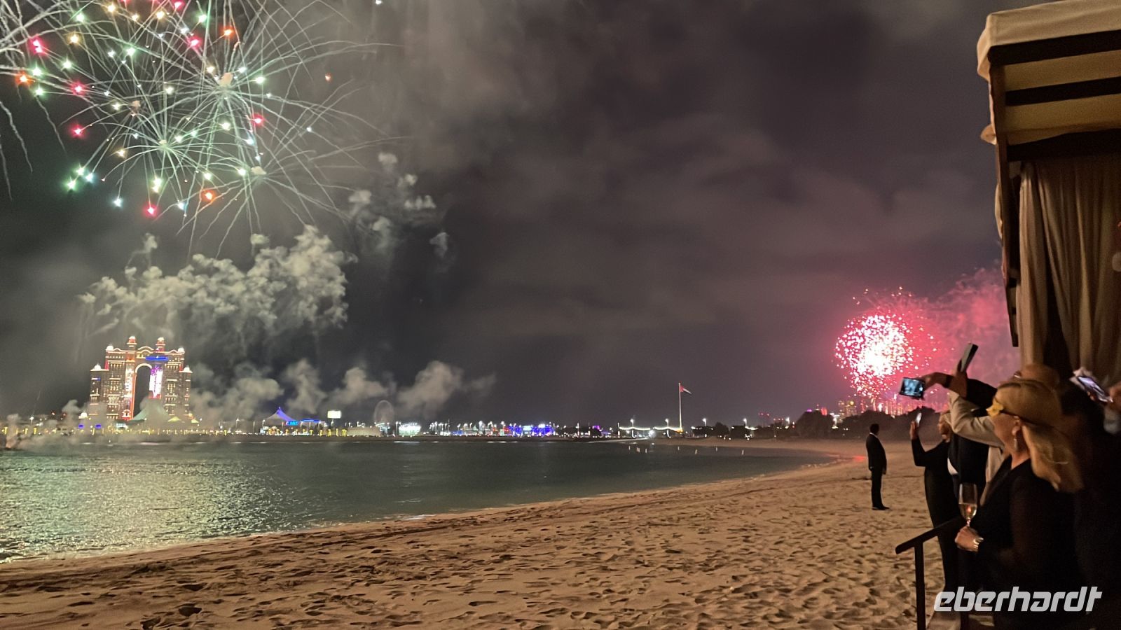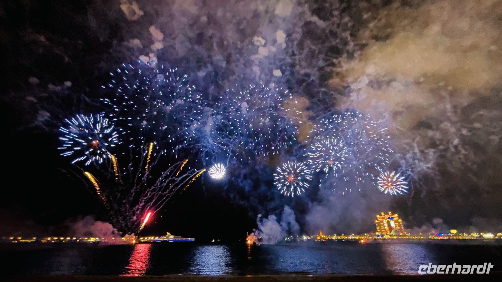 An unserem heutigen freien Tag können alle in Ruhe ausschlafen und wer möchte, der kann mit mir auf eine weitere Bootstour kommen. Diese führt uns noch einmal entlang der Corniche, diesmal bei Tageslicht. Bis zum Treffpunkt am frühen Abend für die Silvesterfeier steht eine individuelle Ausgestaltung des Nachmittags auf dem Plan. Um 18:30Uhr treffen wir uns wieder in der Lobby. Der Dresscode für unsere Silvesternacht lautet – SCHICK-. Wir machen uns auf dem Weg zum Emirates Palace Hotel, wo wir bereits mit Champagner empfangen werden. Danach begeben wir uns zu unseren Tischen im Außenbereich, wo uns nicht nur ein imposantes Buffet mit Lobster, Kaviar, Wagyu-Beef uvm. sondern auch ein einmaliges Show Programm geboten wird. Wir sitzen an zwei Tischen und genießen Speiß- & Trank. Um das Feuerwerk um 00:00 Neujahres-Beginn bestaunen zu können, gehen wir an den Strand. Und dann heißt es… 3,2,1 – frohes neues Jahr! Das Feuerwerk ist einfach gigantisch! Alle sind begeistert! Nun geht die Party richtig los, mit einer großartigen Musikband und vielen Möglichkeiten zu tanzen. Gegen 1:30Uhr werden wir wieder mit dem Bus abgeholt und zurück in das Traders Hotel gebracht. Ein toller Start in das neue Jahr. :-)