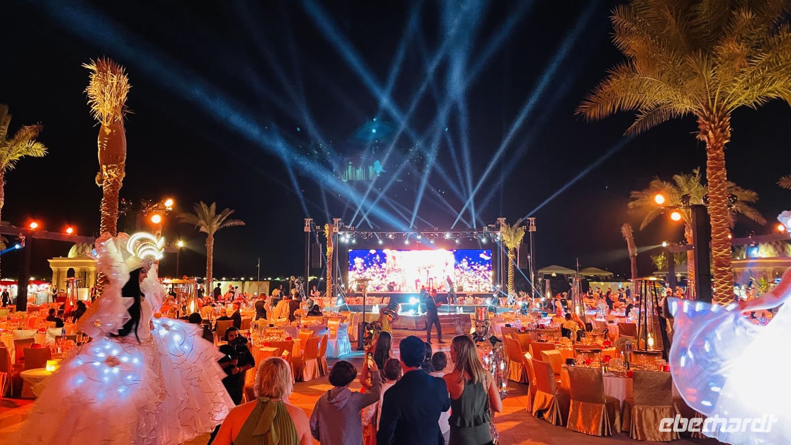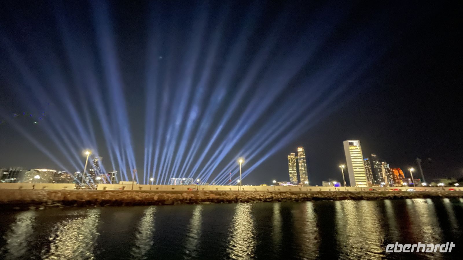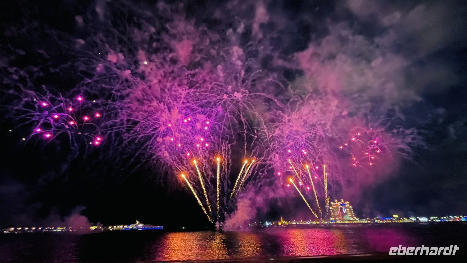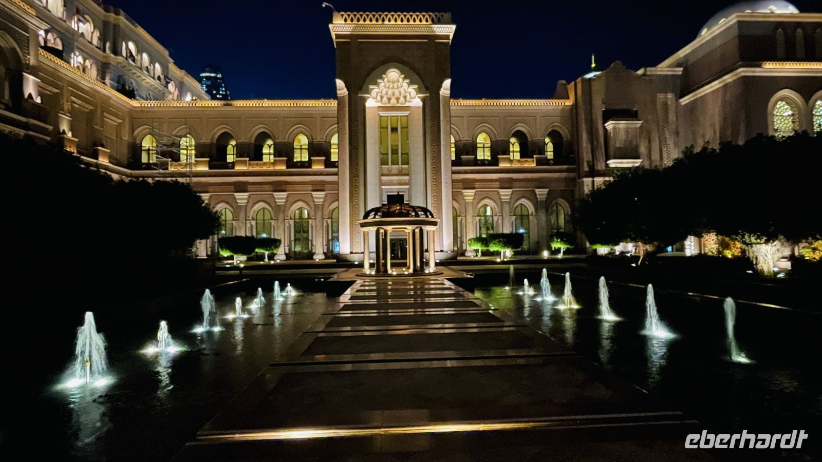 An unserem heutigen freien Tag können alle in Ruhe ausschlafen und wer möchte, der kann mit mir auf eine weitere Bootstour kommen. Diese führt uns noch einmal entlang der Corniche, diesmal bei Tageslicht. Bis zum Treffpunkt am frühen Abend für die Silvesterfeier steht eine individuelle Ausgestaltung des Nachmittags auf dem Plan. Um 18:30Uhr treffen wir uns wieder in der Lobby. Der Dresscode für unsere Silvesternacht lautet – SCHICK-. Wir machen uns auf dem Weg zum Emirates Palace Hotel, wo wir bereits mit Champagner empfangen werden. Danach begeben wir uns zu unseren Tischen im Außenbereich, wo uns nicht nur ein imposantes Buffet mit Lobster, Kaviar, Wagyu-Beef uvm. sondern auch ein einmaliges Show Programm geboten wird. Wir sitzen an zwei Tischen und genießen Speiß- & Trank. Um das Feuerwerk um 00:00 Neujahres-Beginn bestaunen zu können, gehen wir an den Strand. Und dann heißt es… 3,2,1 – frohes neues Jahr! Das Feuerwerk ist einfach gigantisch! Alle sind begeistert! Nun geht die Party richtig los, mit einer großartigen Musikband und vielen Möglichkeiten zu tanzen. Gegen 1:30Uhr werden wir wieder mit dem Bus abgeholt und zurück in das Traders Hotel gebracht. Ein toller Start in das neue Jahr. :-)