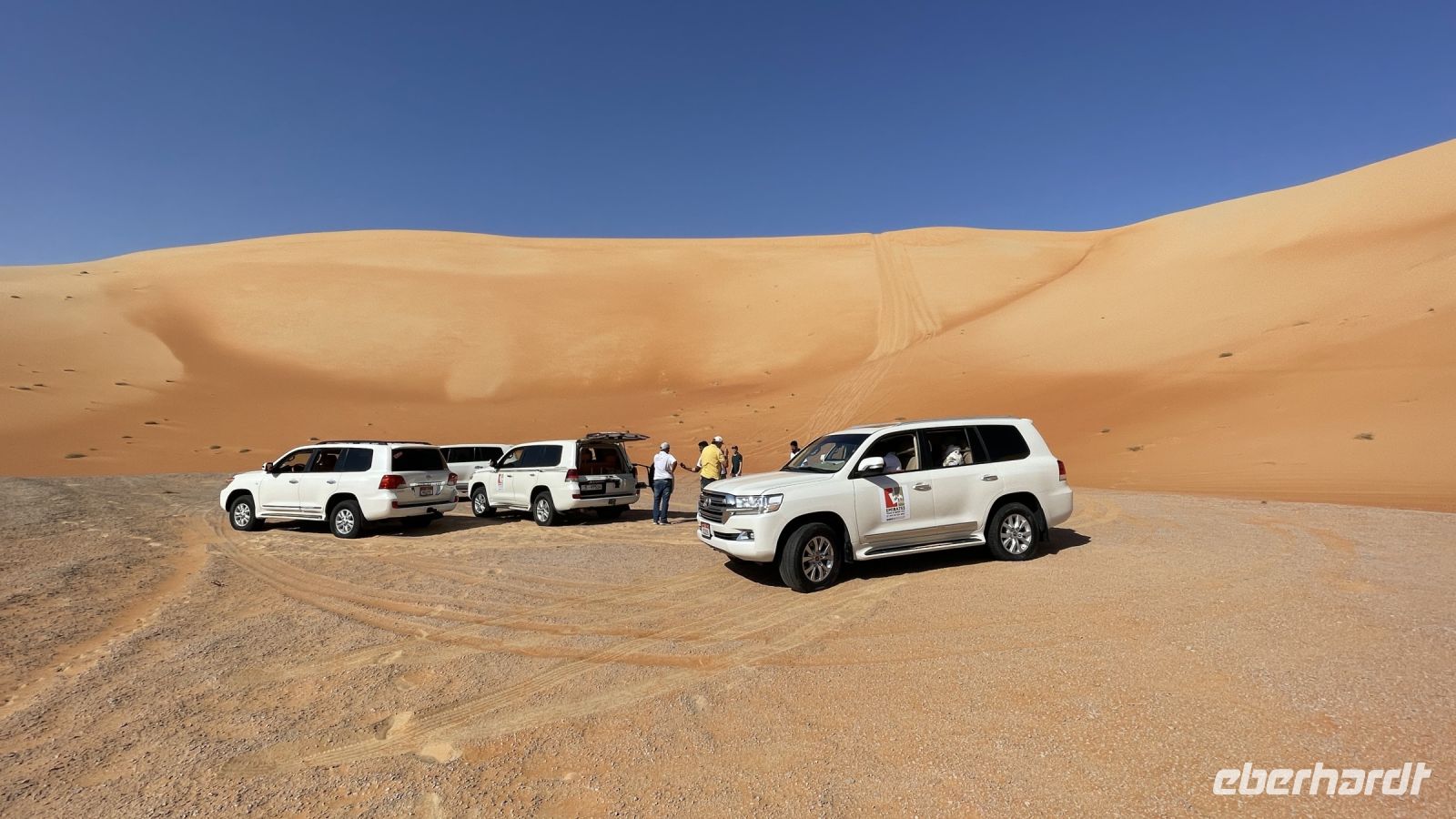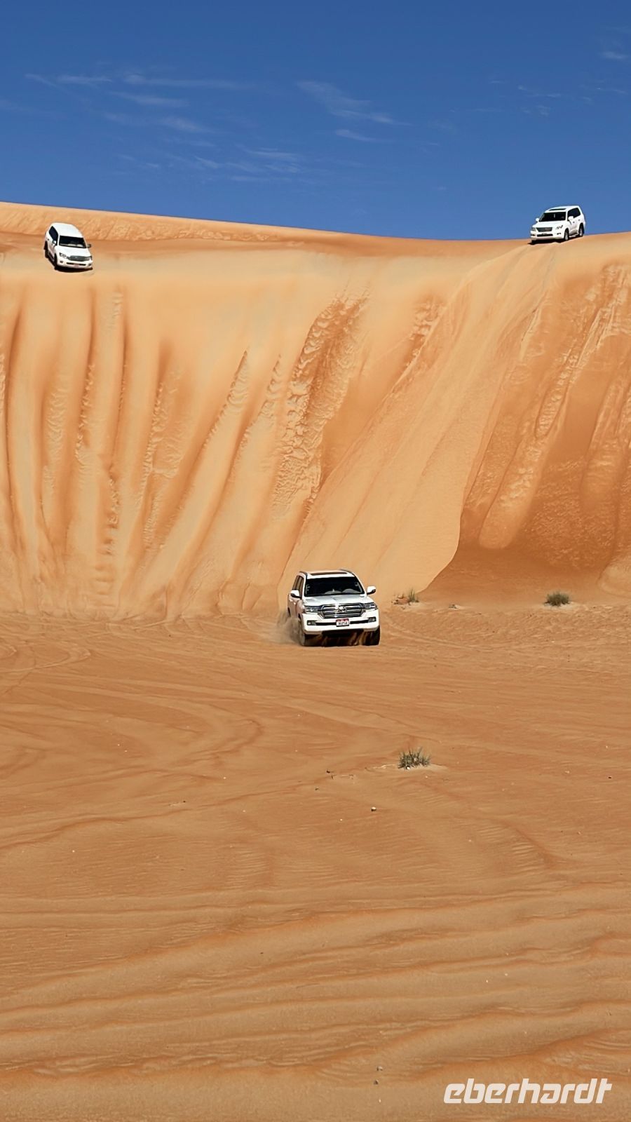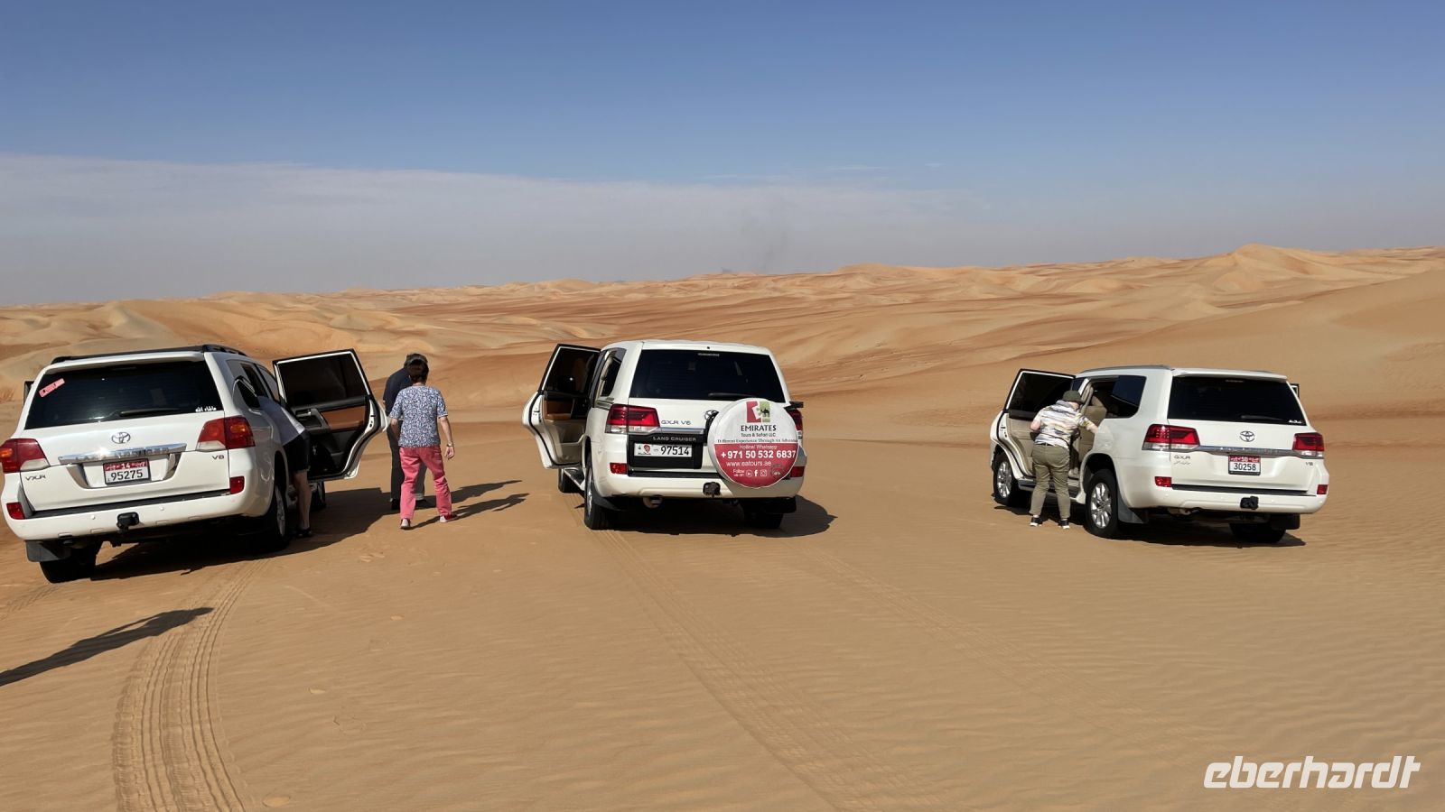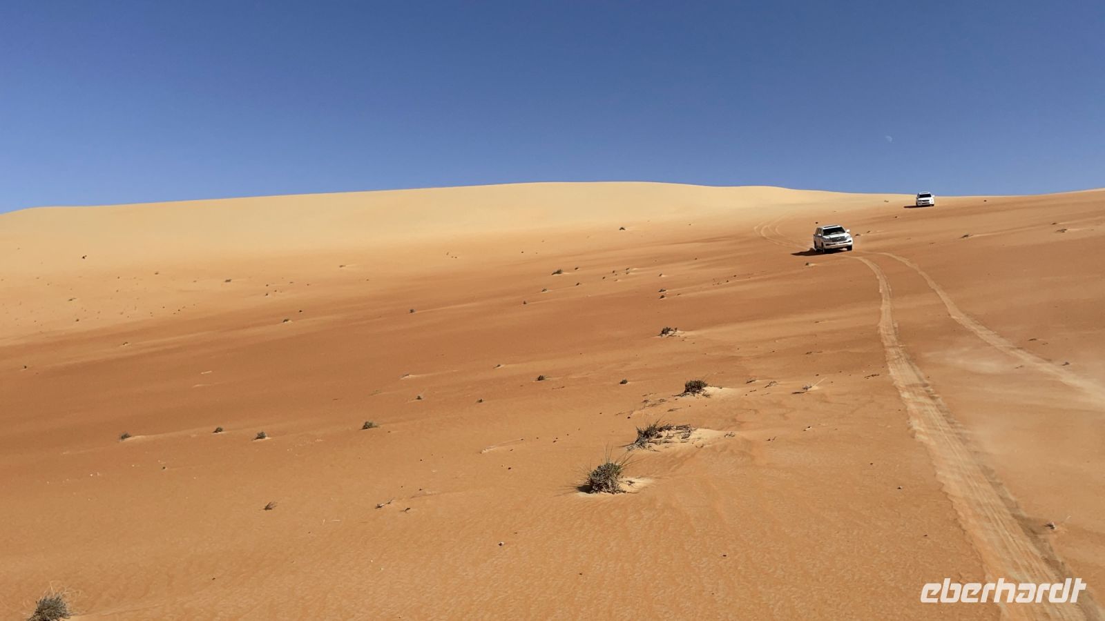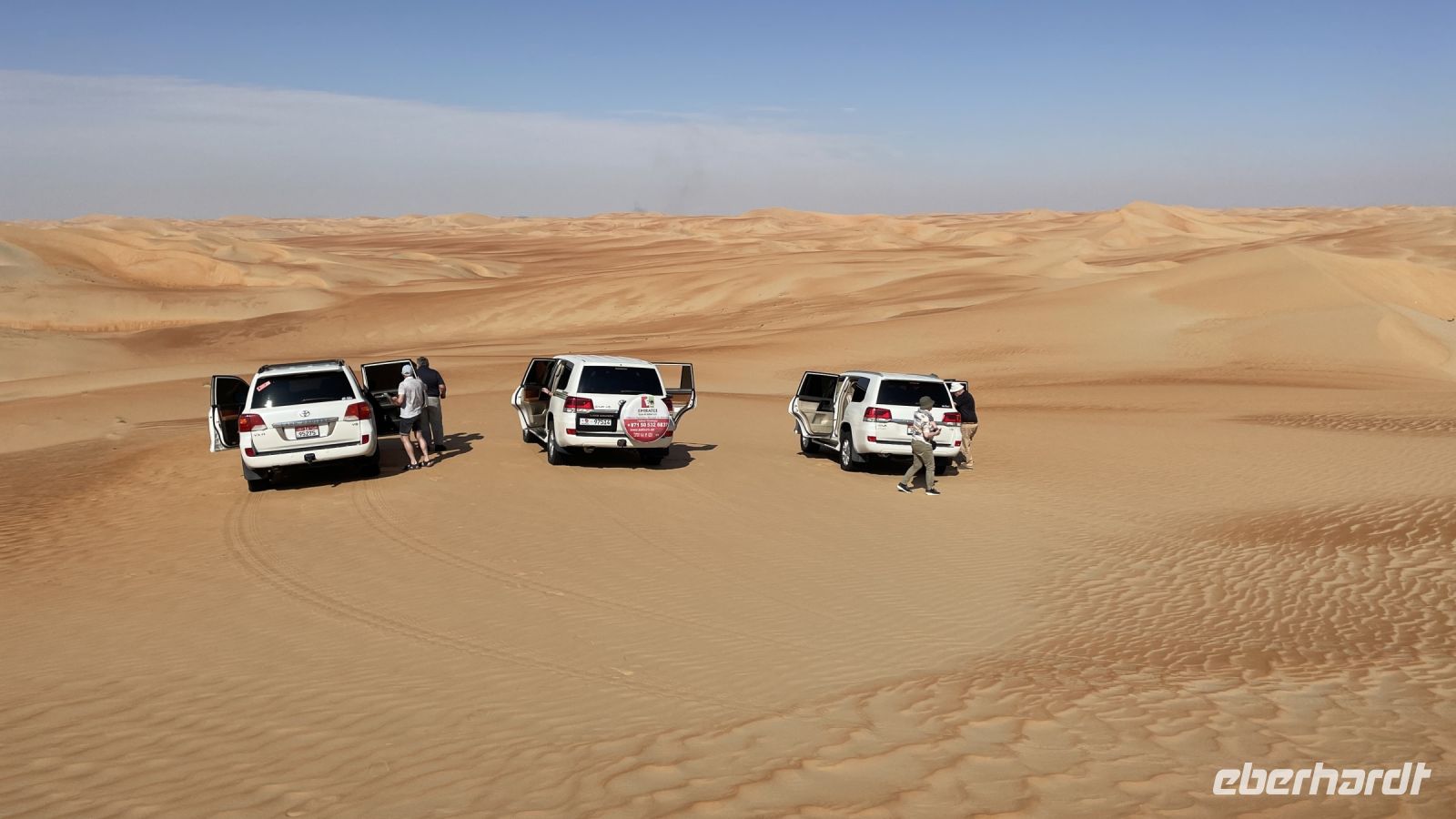 Nach dem Frühstück starten wir mit 3 Jeeps zur Wüstensafari. Wir fahren ca. 1,5 Stunden und legen auf der Hälfte der Strecke einen Besuch im Oldtimer-Museum ein. Dort bestaunen wir von Cadillac bis Trabi die schönsten Autos der letzten 100 Jahre. Danach geht es weiter für ca. 30min. bis wir die Sanddünen erreichen. Nach einem ersten Fotostopp und dem ablassen der Luft aus den Reifen, starten wir nun mit unserer aufregenden Dünenfahrt. Wir erkunden die sandige Landschaft und haben stets genügend Stopps, um die tollen Momente fotografisch festhalten zu können. Nach zwei Stunden erreichen wir eine kleine Oase, die ein pakistanischer Bewohner bewirtschaftet und bewässert. Dort können wir auch unser Mittagessen genießen. Gestärkt von dem Essen geht es weiter zum nächsten Fotostopp – einer Kamelfarm. Die meisten Kamele bewegen sich tagsüber frei in der Wüste und kommen abends zum Essen und Trinken in die Oase bzw. in die Kamelfarm zurück. Danach geht die Entdeckungs-Tour weiter, bis wir schließlich nach einer halben Stunde wieder „festen Boden“ unter den Füßen haben werden. Zum Schluss besuchen wir noch in der Liwa Oasa eine kleine Festungsanlage, die von der Herrscher Familie vor mehreren hundert Jahren zum Schutz der Oasa errichtet wurde. Nach so vielen tollen Eindrücken, fahren wir ca. 2 Stunden zurück in unser Hotel.