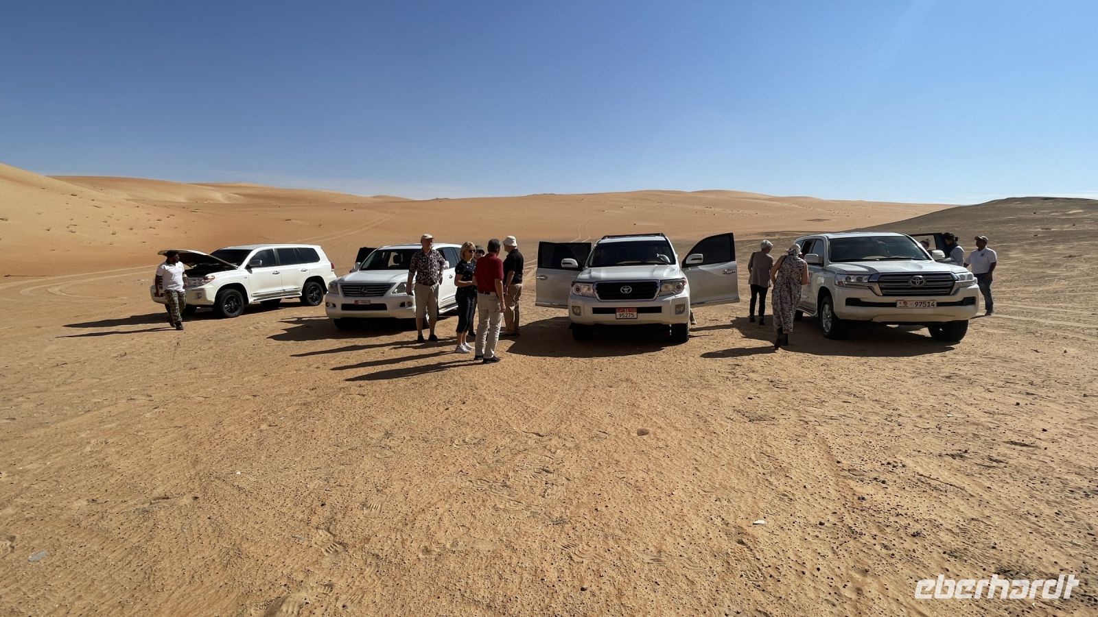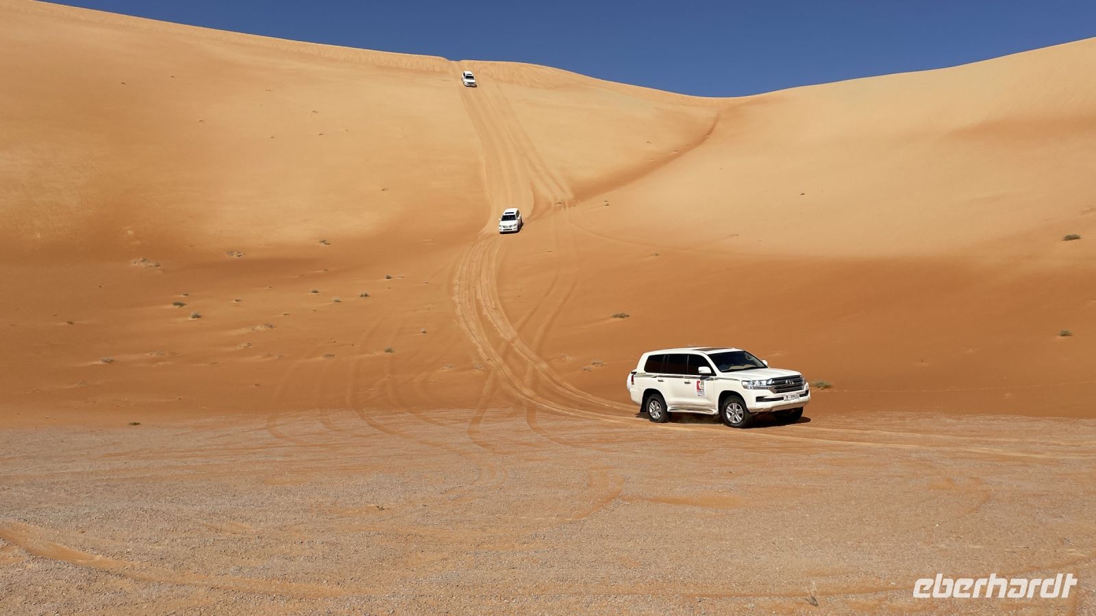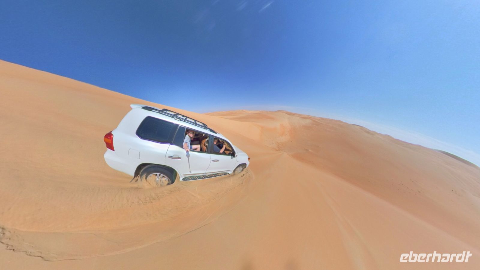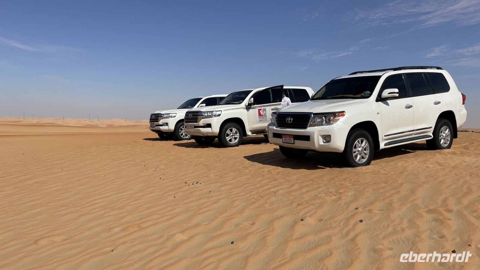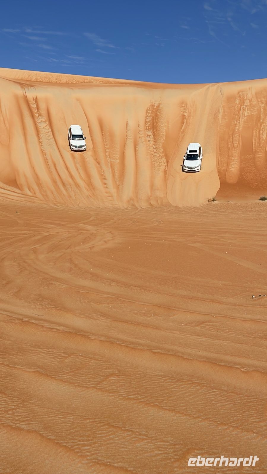 Nach dem Frühstück starten wir mit 3 Jeeps zur Wüstensafari. Wir fahren ca. 1,5 Stunden und legen auf der Hälfte der Strecke einen Besuch im Oldtimer-Museum ein. Dort bestaunen wir von Cadillac bis Trabi die schönsten Autos der letzten 100 Jahre. Danach geht es weiter für ca. 30min. bis wir die Sanddünen erreichen. Nach einem ersten Fotostopp und dem ablassen der Luft aus den Reifen, starten wir nun mit unserer aufregenden Dünenfahrt. Wir erkunden die sandige Landschaft und haben stets genügend Stopps, um die tollen Momente fotografisch festhalten zu können. Nach zwei Stunden erreichen wir eine kleine Oase, die ein pakistanischer Bewohner bewirtschaftet und bewässert. Dort können wir auch unser Mittagessen genießen. Gestärkt von dem Essen geht es weiter zum nächsten Fotostopp – einer Kamelfarm. Die meisten Kamele bewegen sich tagsüber frei in der Wüste und kommen abends zum Essen und Trinken in die Oase bzw. in die Kamelfarm zurück. Danach geht die Entdeckungs-Tour weiter, bis wir schließlich nach einer halben Stunde wieder „festen Boden“ unter den Füßen haben werden. Zum Schluss besuchen wir noch in der Liwa Oasa eine kleine Festungsanlage, die von der Herrscher Familie vor mehreren hundert Jahren zum Schutz der Oasa errichtet wurde. Nach so vielen tollen Eindrücken, fahren wir ca. 2 Stunden zurück in unser Hotel.