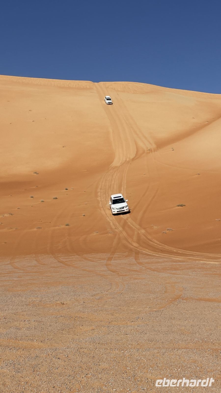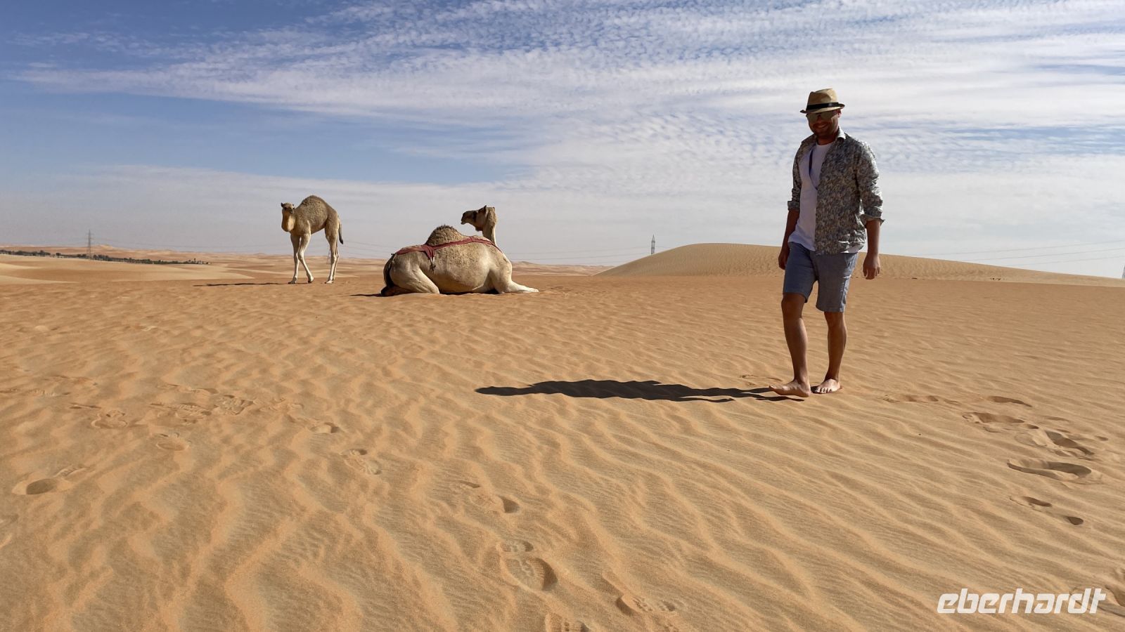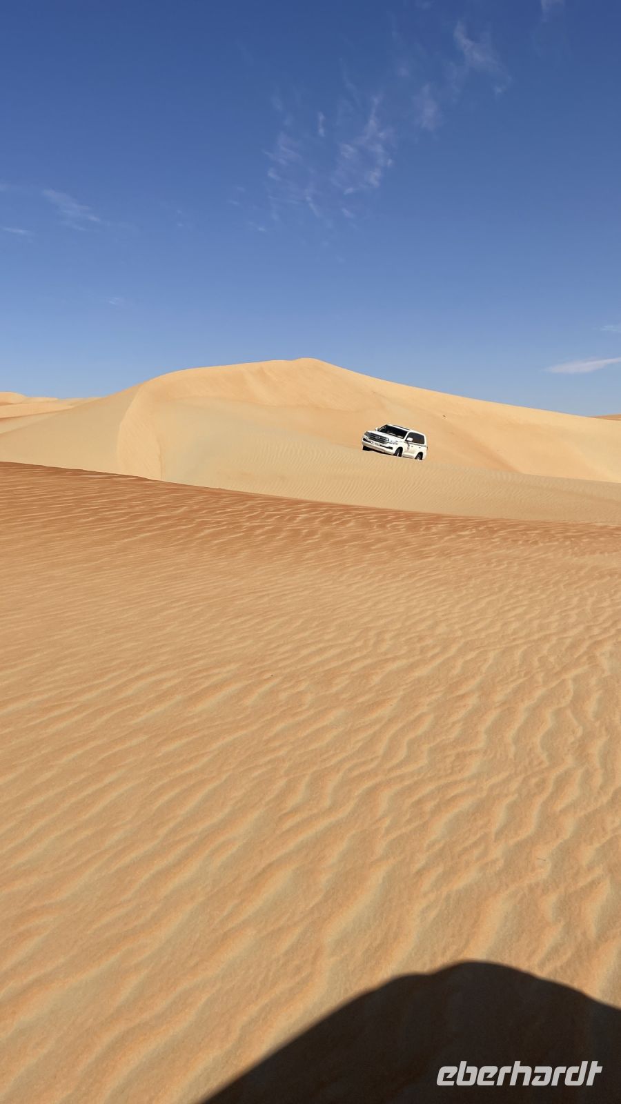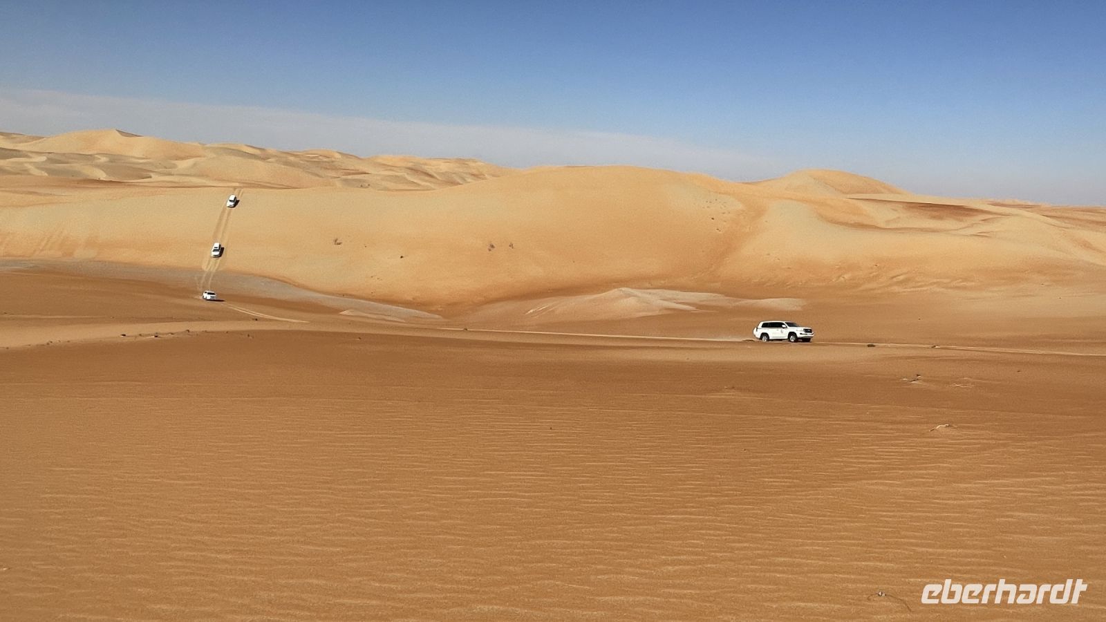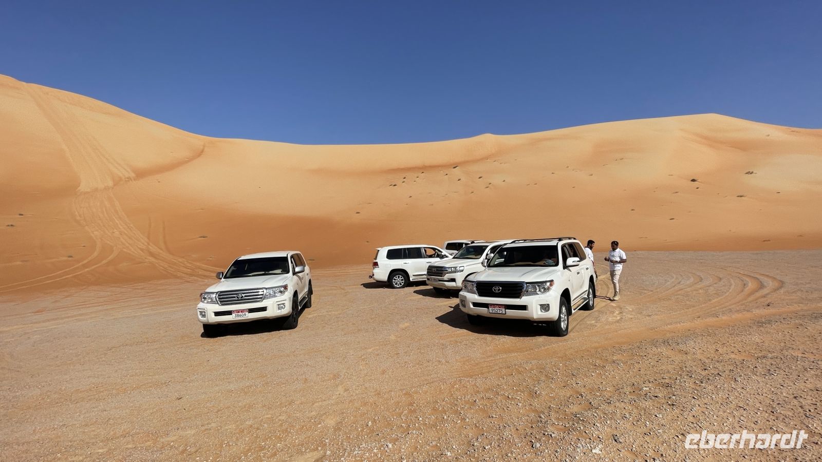 Nach dem Frühstück starten wir mit 3 Jeeps zur Wüstensafari. Wir fahren ca. 1,5 Stunden und legen auf der Hälfte der Strecke einen Besuch im Oldtimer-Museum ein. Dort bestaunen wir von Cadillac bis Trabi die schönsten Autos der letzten 100 Jahre. Danach geht es weiter für ca. 30min. bis wir die Sanddünen erreichen. Nach einem ersten Fotostopp und dem ablassen der Luft aus den Reifen, starten wir nun mit unserer aufregenden Dünenfahrt. Wir erkunden die sandige Landschaft und haben stets genügend Stopps, um die tollen Momente fotografisch festhalten zu können. Nach zwei Stunden erreichen wir eine kleine Oase, die ein pakistanischer Bewohner bewirtschaftet und bewässert. Dort können wir auch unser Mittagessen genießen. Gestärkt von dem Essen geht es weiter zum nächsten Fotostopp – einer Kamelfarm. Die meisten Kamele bewegen sich tagsüber frei in der Wüste und kommen abends zum Essen und Trinken in die Oase bzw. in die Kamelfarm zurück. Danach geht die Entdeckungs-Tour weiter, bis wir schließlich nach einer halben Stunde wieder „festen Boden“ unter den Füßen haben werden. Zum Schluss besuchen wir noch in der Liwa Oasa eine kleine Festungsanlage, die von der Herrscher Familie vor mehreren hundert Jahren zum Schutz der Oasa errichtet wurde. Nach so vielen tollen Eindrücken, fahren wir ca. 2 Stunden zurück in unser Hotel.