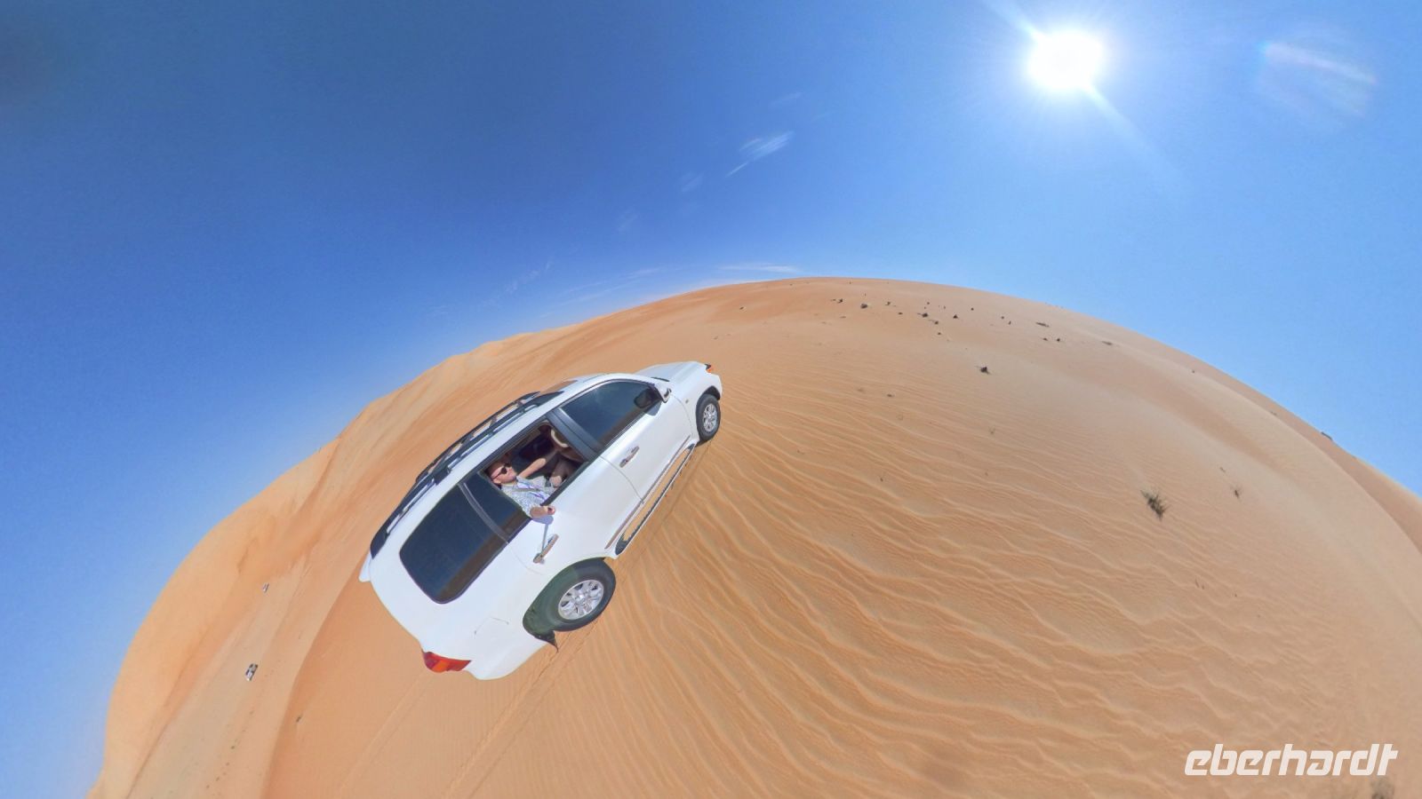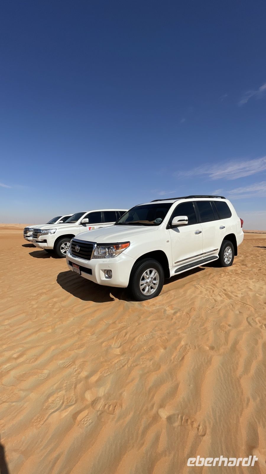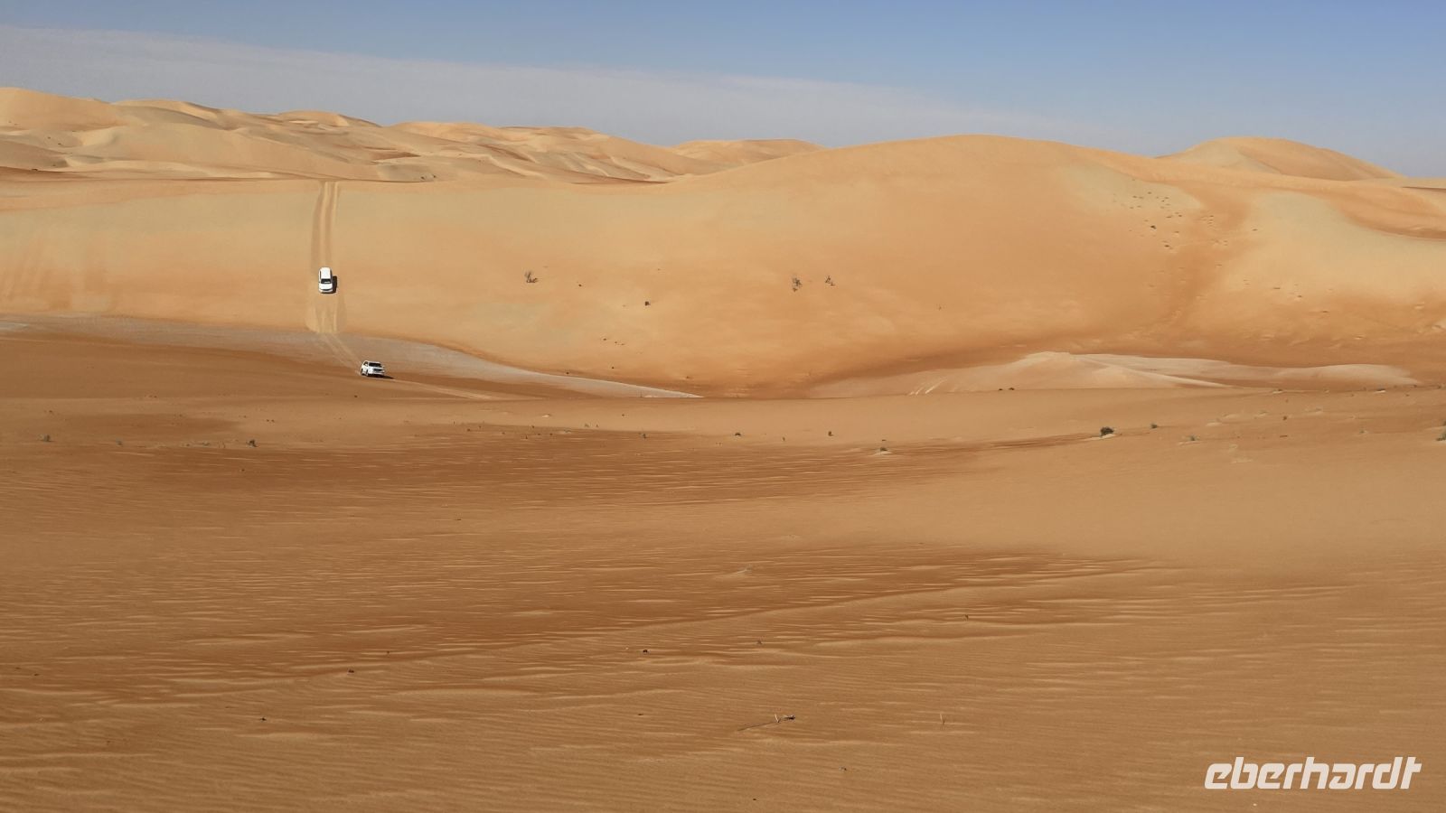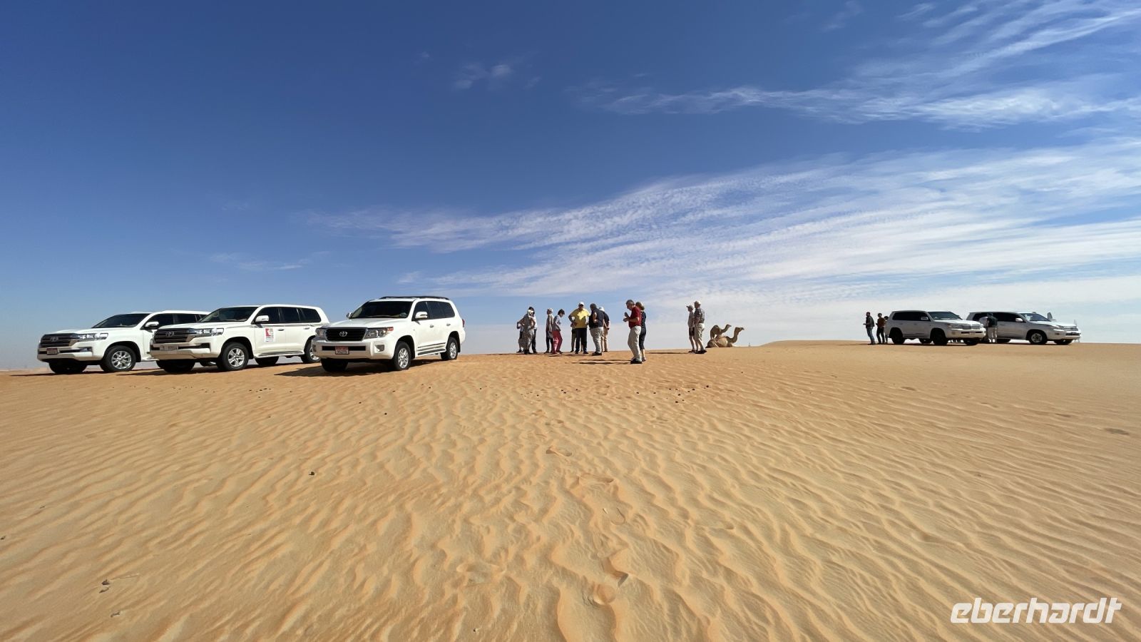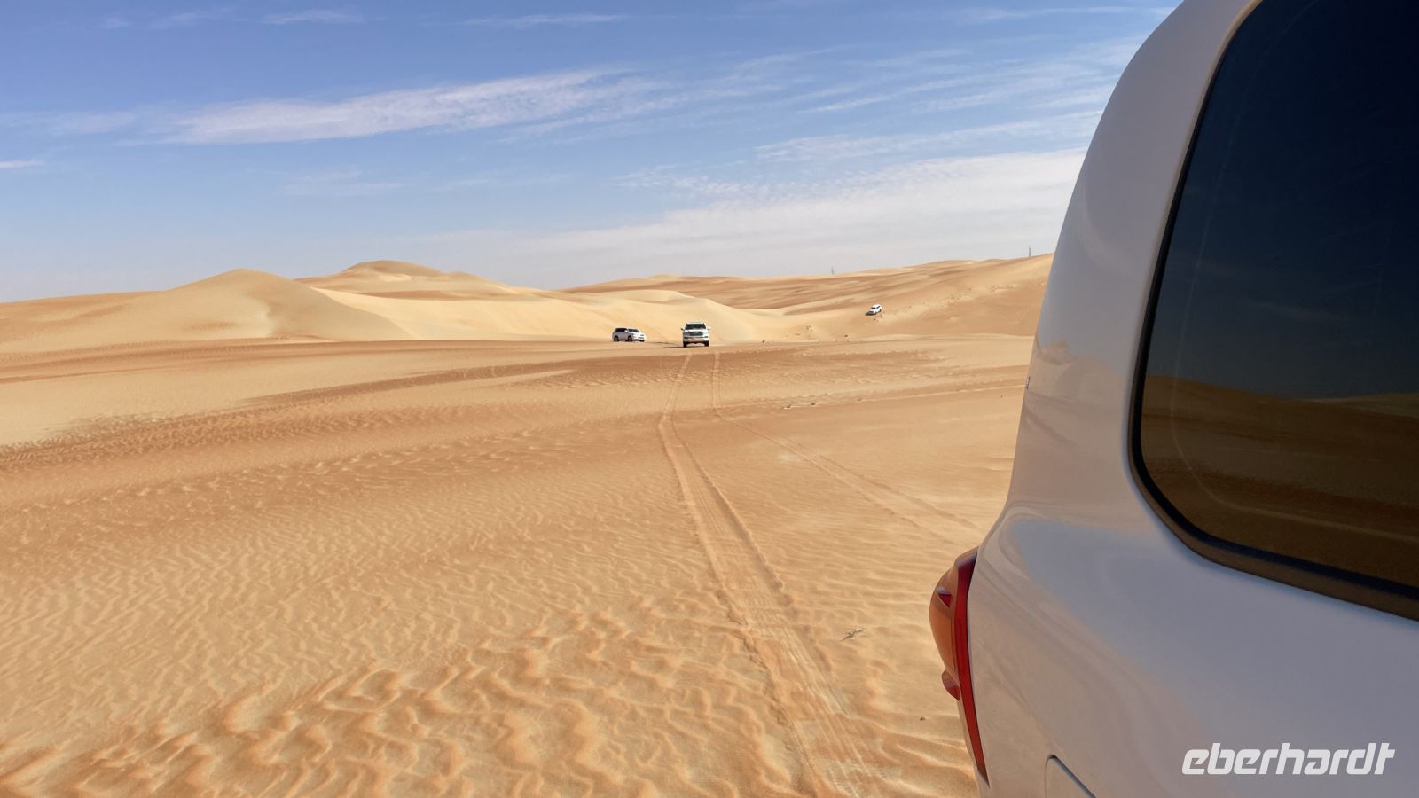 Nach dem Frühstück starten wir mit 3 Jeeps zur Wüstensafari. Wir fahren ca. 1,5 Stunden und legen auf der Hälfte der Strecke einen Besuch im Oldtimer-Museum ein. Dort bestaunen wir von Cadillac bis Trabi die schönsten Autos der letzten 100 Jahre. Danach geht es weiter für ca. 30min. bis wir die Sanddünen erreichen. Nach einem ersten Fotostopp und dem ablassen der Luft aus den Reifen, starten wir nun mit unserer aufregenden Dünenfahrt. Wir erkunden die sandige Landschaft und haben stets genügend Stopps, um die tollen Momente fotografisch festhalten zu können. Nach zwei Stunden erreichen wir eine kleine Oase, die ein pakistanischer Bewohner bewirtschaftet und bewässert. Dort können wir auch unser Mittagessen genießen. Gestärkt von dem Essen geht es weiter zum nächsten Fotostopp – einer Kamelfarm. Die meisten Kamele bewegen sich tagsüber frei in der Wüste und kommen abends zum Essen und Trinken in die Oase bzw. in die Kamelfarm zurück. Danach geht die Entdeckungs-Tour weiter, bis wir schließlich nach einer halben Stunde wieder „festen Boden“ unter den Füßen haben werden. Zum Schluss besuchen wir noch in der Liwa Oasa eine kleine Festungsanlage, die von der Herrscher Familie vor mehreren hundert Jahren zum Schutz der Oasa errichtet wurde. Nach so vielen tollen Eindrücken, fahren wir ca. 2 Stunden zurück in unser Hotel.
