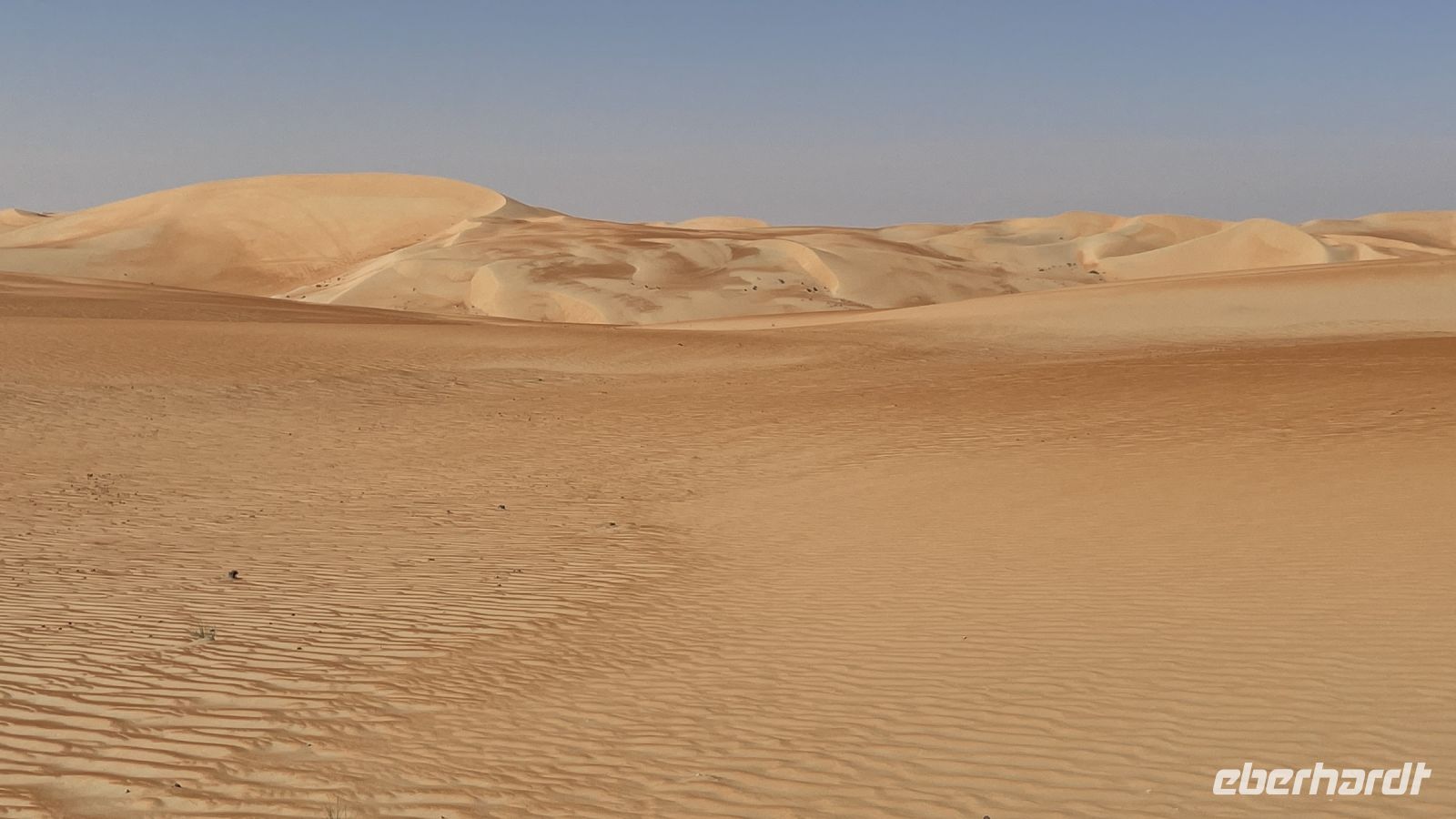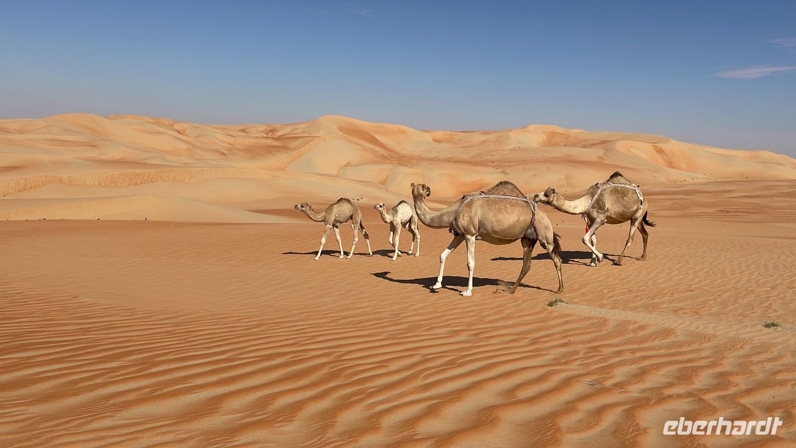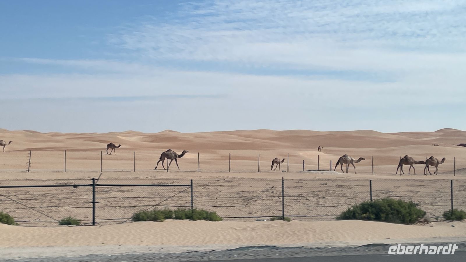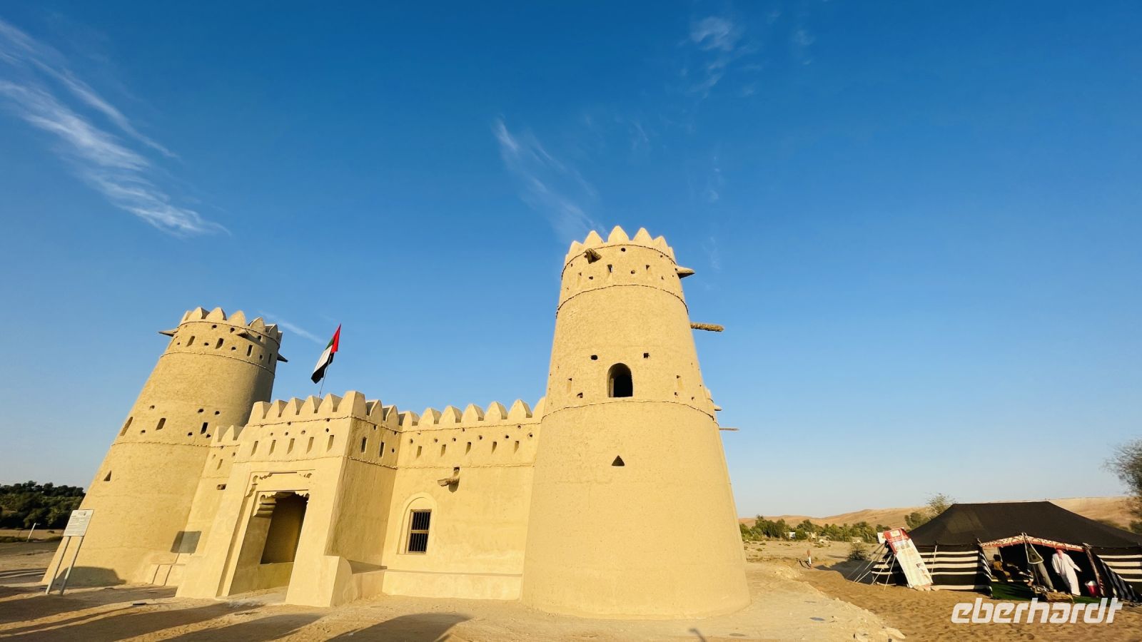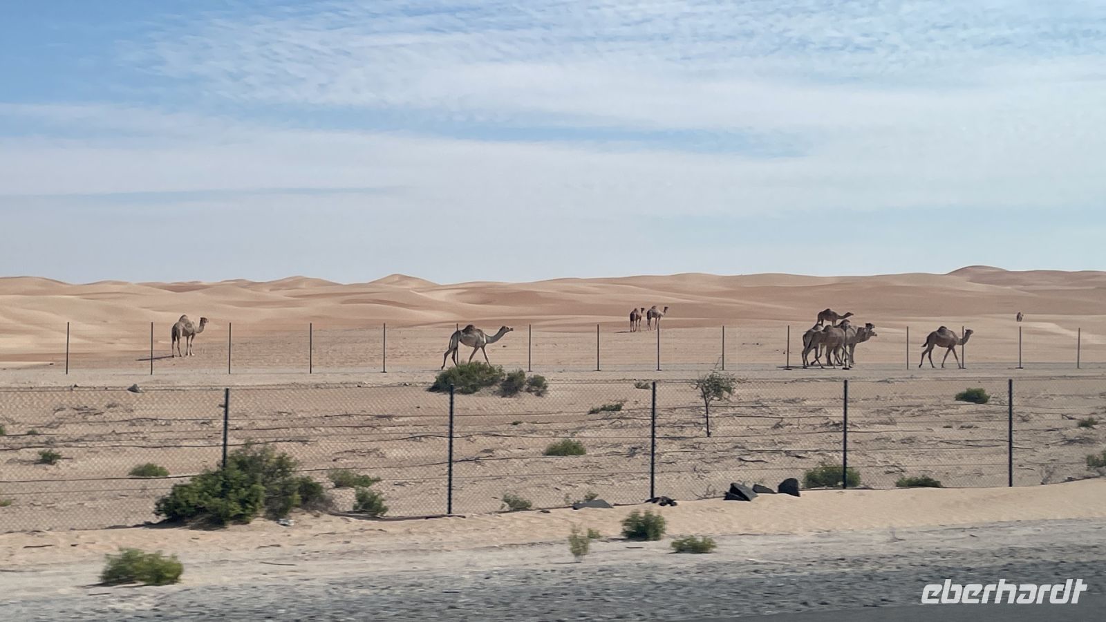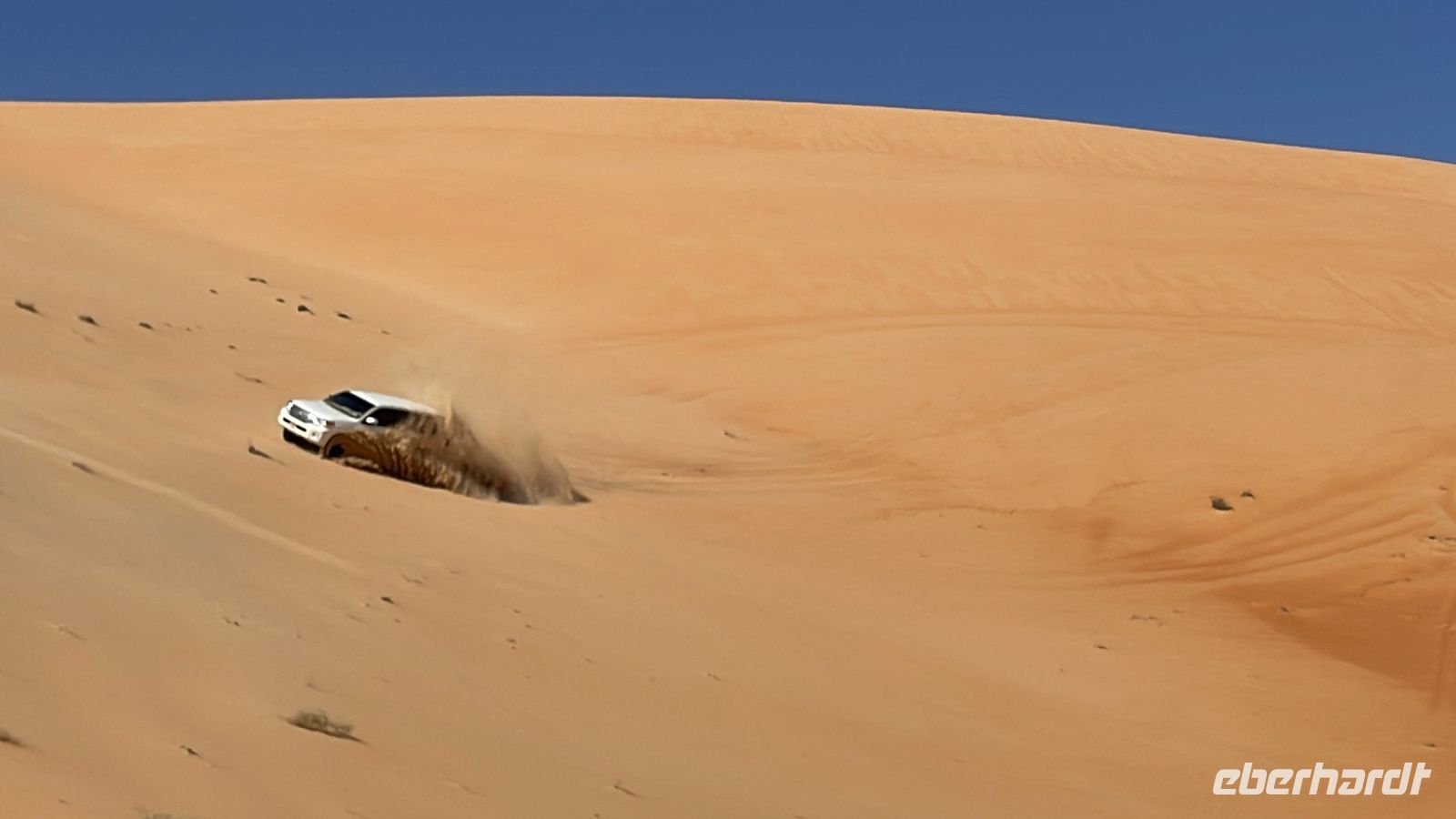 Nach dem Frühstück starten wir mit 3 Jeeps zur Wüstensafari. Wir fahren ca. 1,5 Stunden und legen auf der Hälfte der Strecke einen Besuch im Oldtimer-Museum ein. Dort bestaunen wir von Cadillac bis Trabi die schönsten Autos der letzten 100 Jahre. Danach geht es weiter für ca. 30min. bis wir die Sanddünen erreichen. Nach einem ersten Fotostopp und dem ablassen der Luft aus den Reifen, starten wir nun mit unserer aufregenden Dünenfahrt. Wir erkunden die sandige Landschaft und haben stets genügend Stopps, um die tollen Momente fotografisch festhalten zu können. Nach zwei Stunden erreichen wir eine kleine Oase, die ein pakistanischer Bewohner bewirtschaftet und bewässert. Dort können wir auch unser Mittagessen genießen. Gestärkt von dem Essen geht es weiter zum nächsten Fotostopp – einer Kamelfarm. Die meisten Kamele bewegen sich tagsüber frei in der Wüste und kommen abends zum Essen und Trinken in die Oase bzw. in die Kamelfarm zurück. Danach geht die Entdeckungs-Tour weiter, bis wir schließlich nach einer halben Stunde wieder „festen Boden“ unter den Füßen haben werden. Zum Schluss besuchen wir noch in der Liwa Oasa eine kleine Festungsanlage, die von der Herrscher Familie vor mehreren hundert Jahren zum Schutz der Oasa errichtet wurde. Nach so vielen tollen Eindrücken, fahren wir ca. 2 Stunden zurück in unser Hotel.