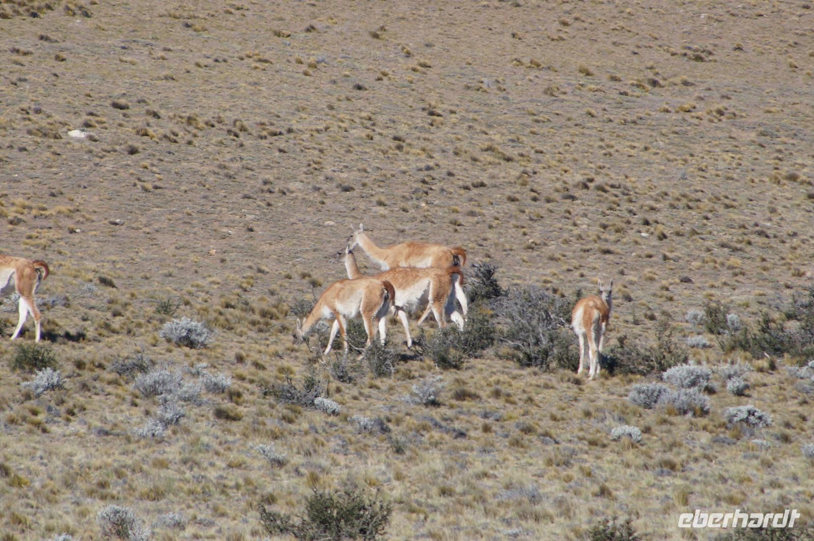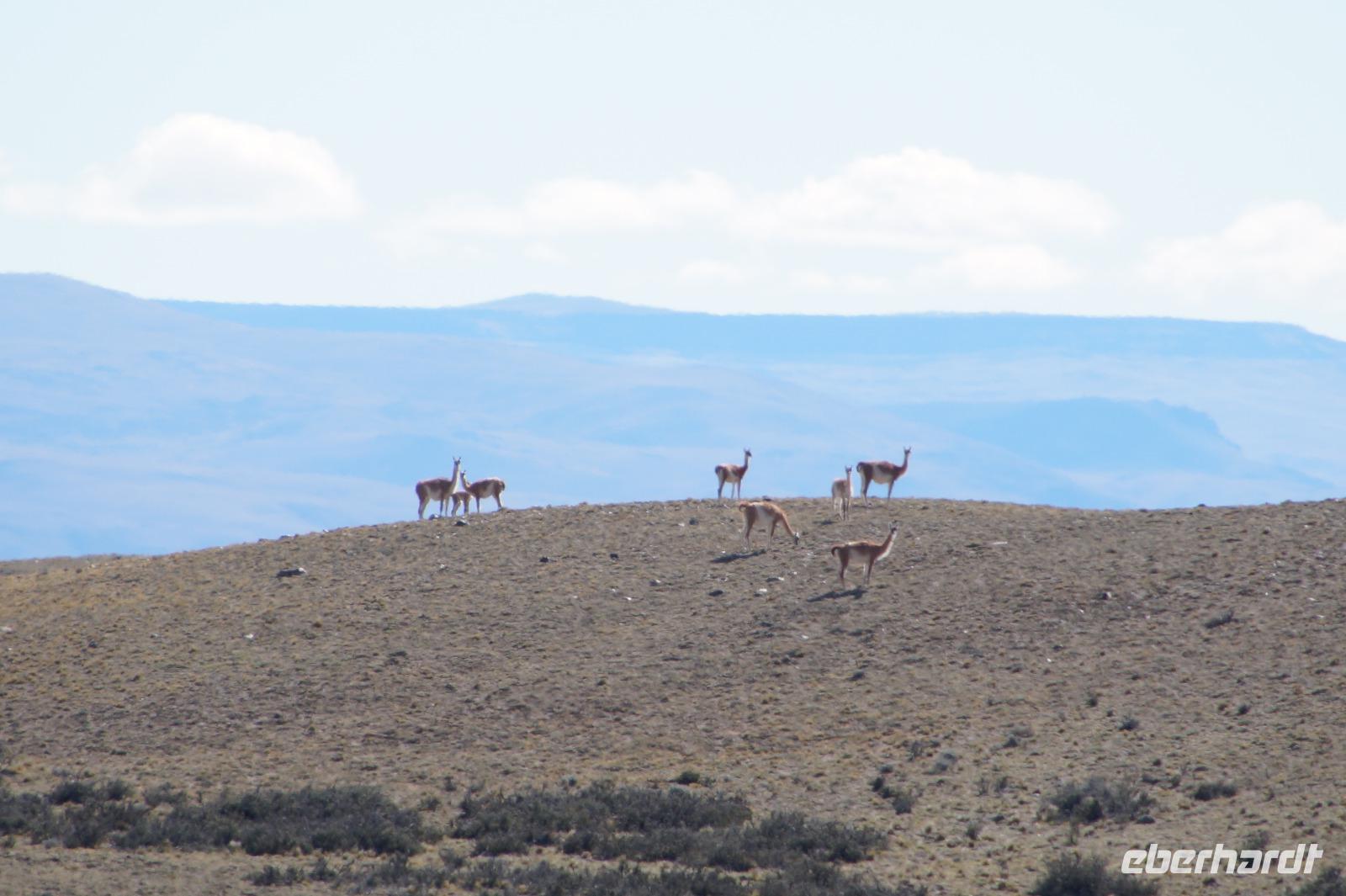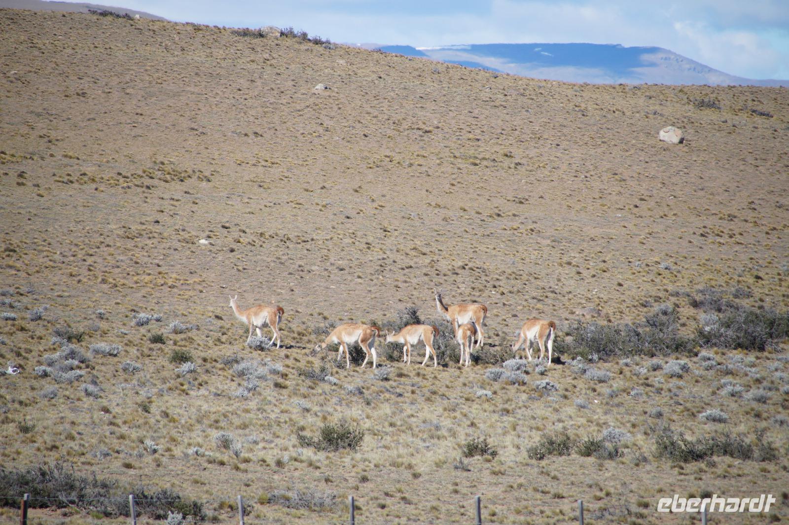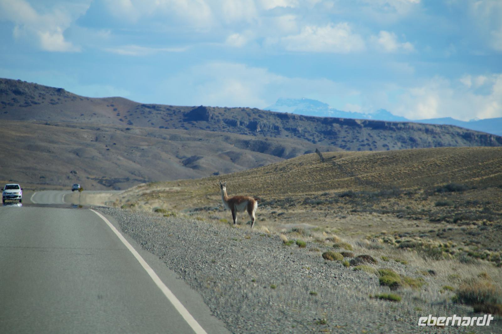 Kurz nach unserer Abfahrt vom Flughafen begegnen wir unseren ersten Ñandús und Guanacos; irgendwo in der Steppe halten wir auch mal an, um von einer kleinen Guanaco-Herde Fotos zu machen. Wir sehen den Lago Argentino und den Lago Viedma.