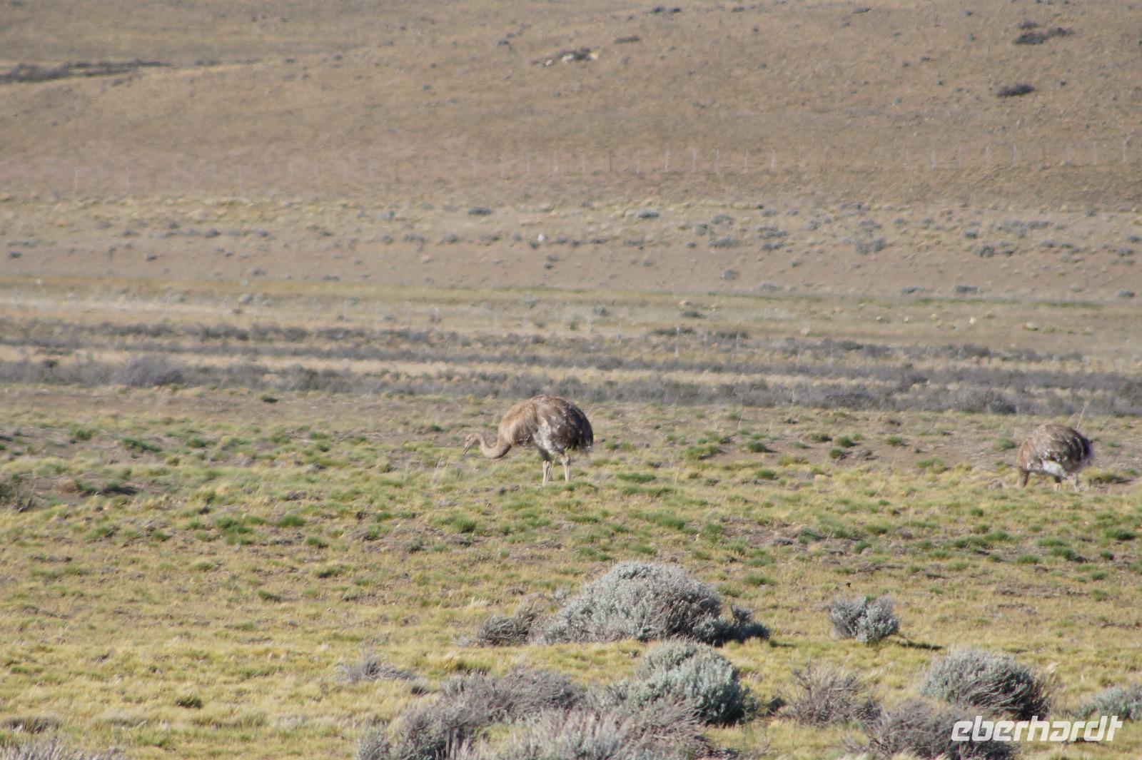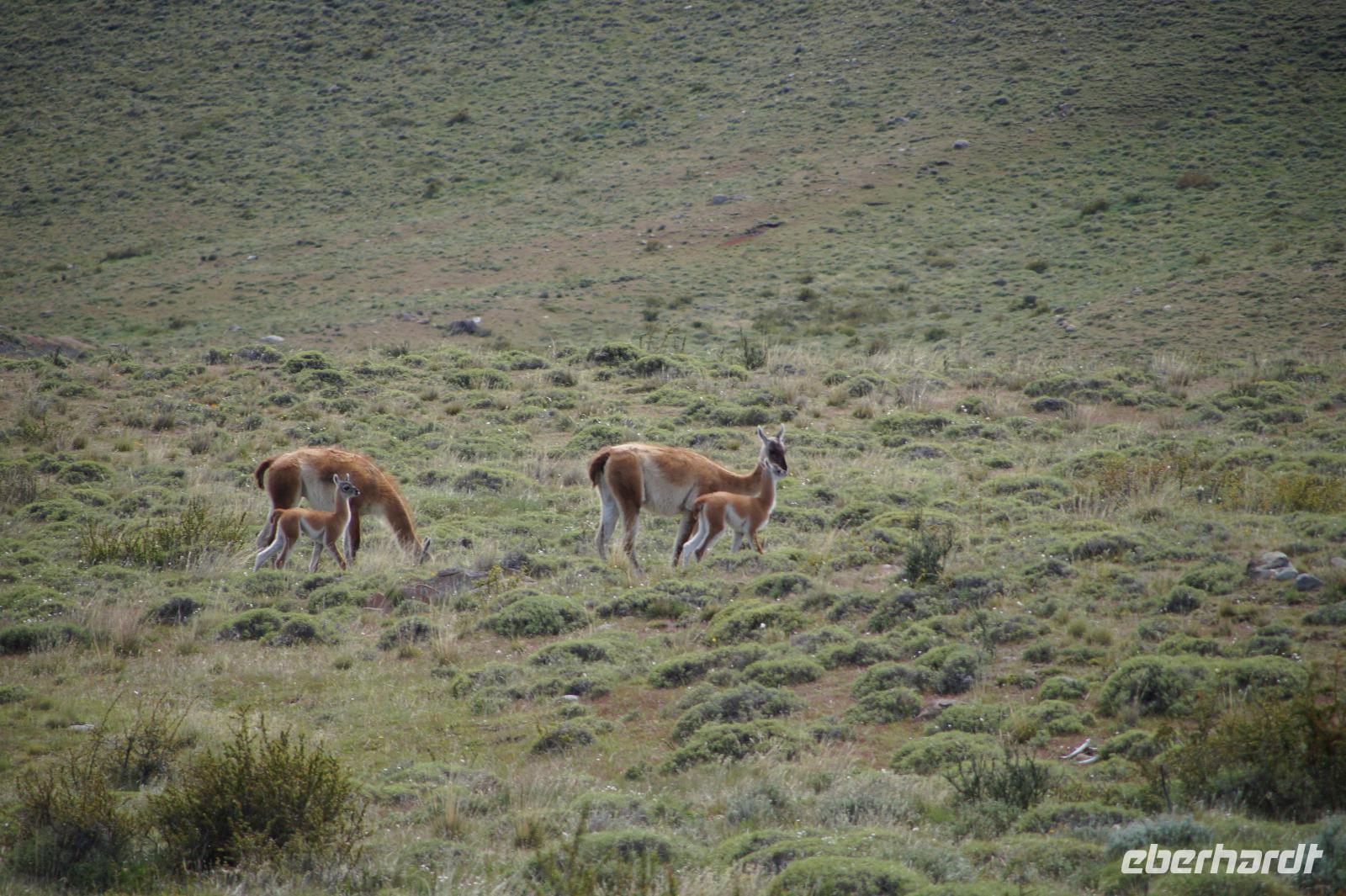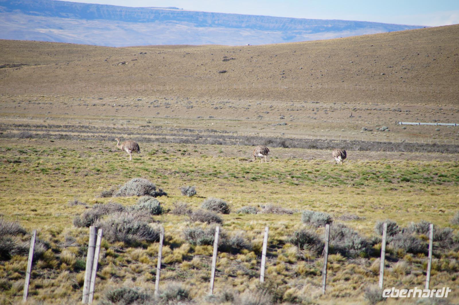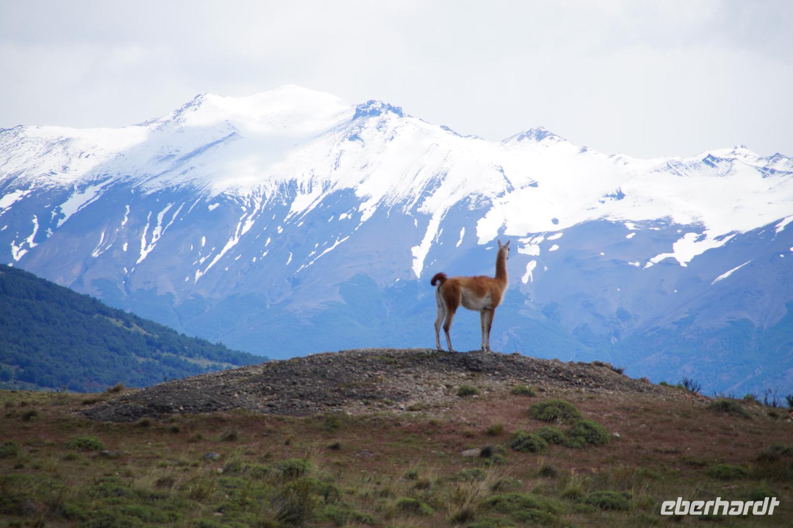 Kurz nach unserer Abfahrt vom Flughafen begegnen wir unseren ersten Ñandús und Guanacos; irgendwo in der Steppe halten wir auch mal an, um von einer kleinen Guanaco-Herde Fotos zu machen. Wir sehen den Lago Argentino und den Lago Viedma.