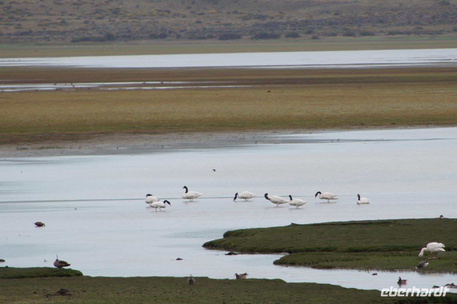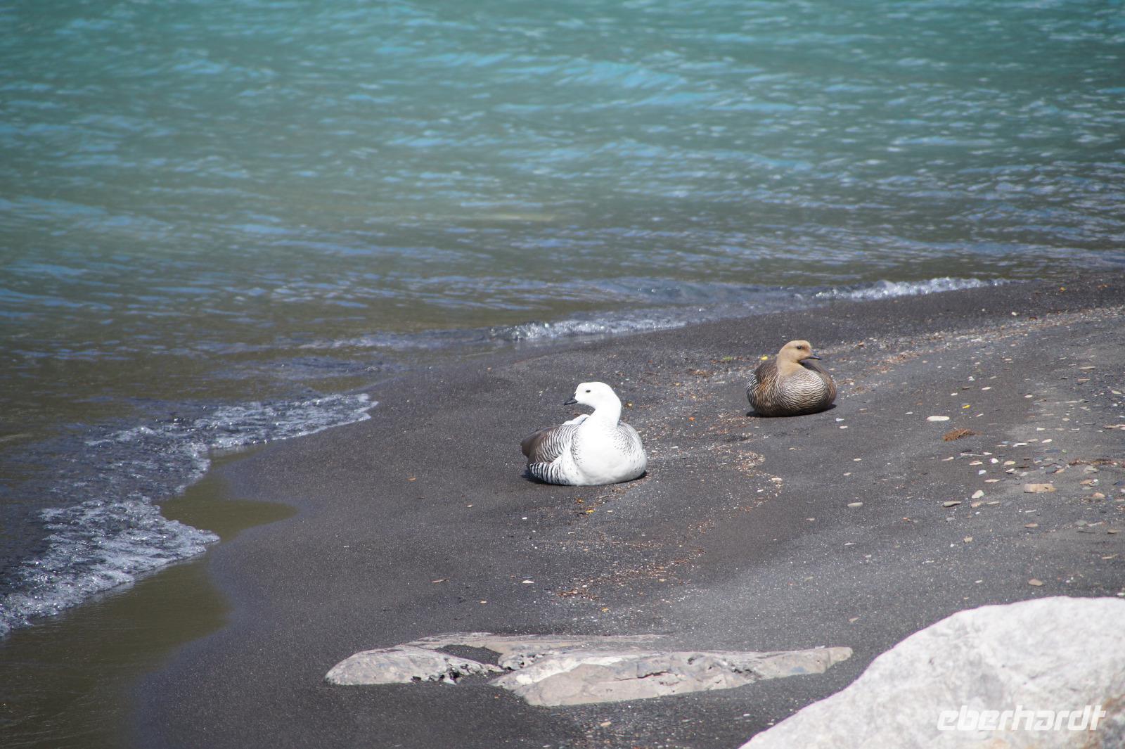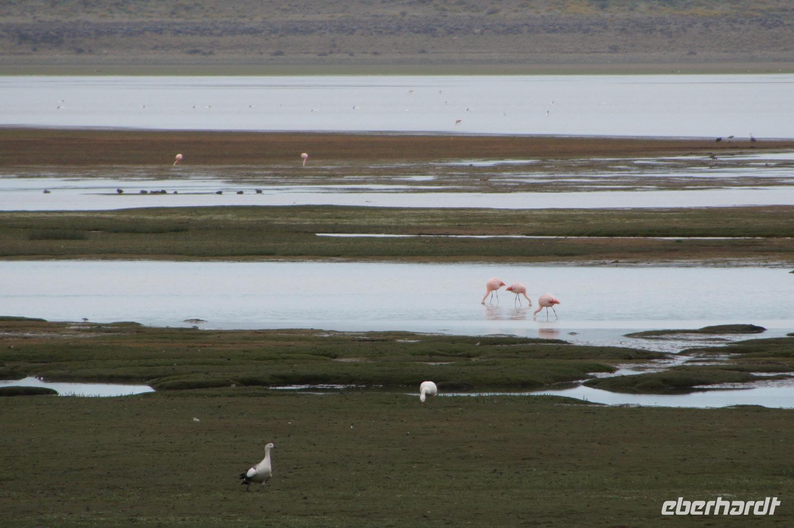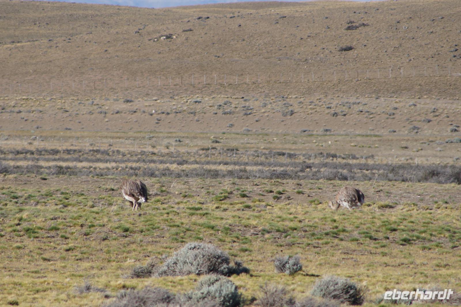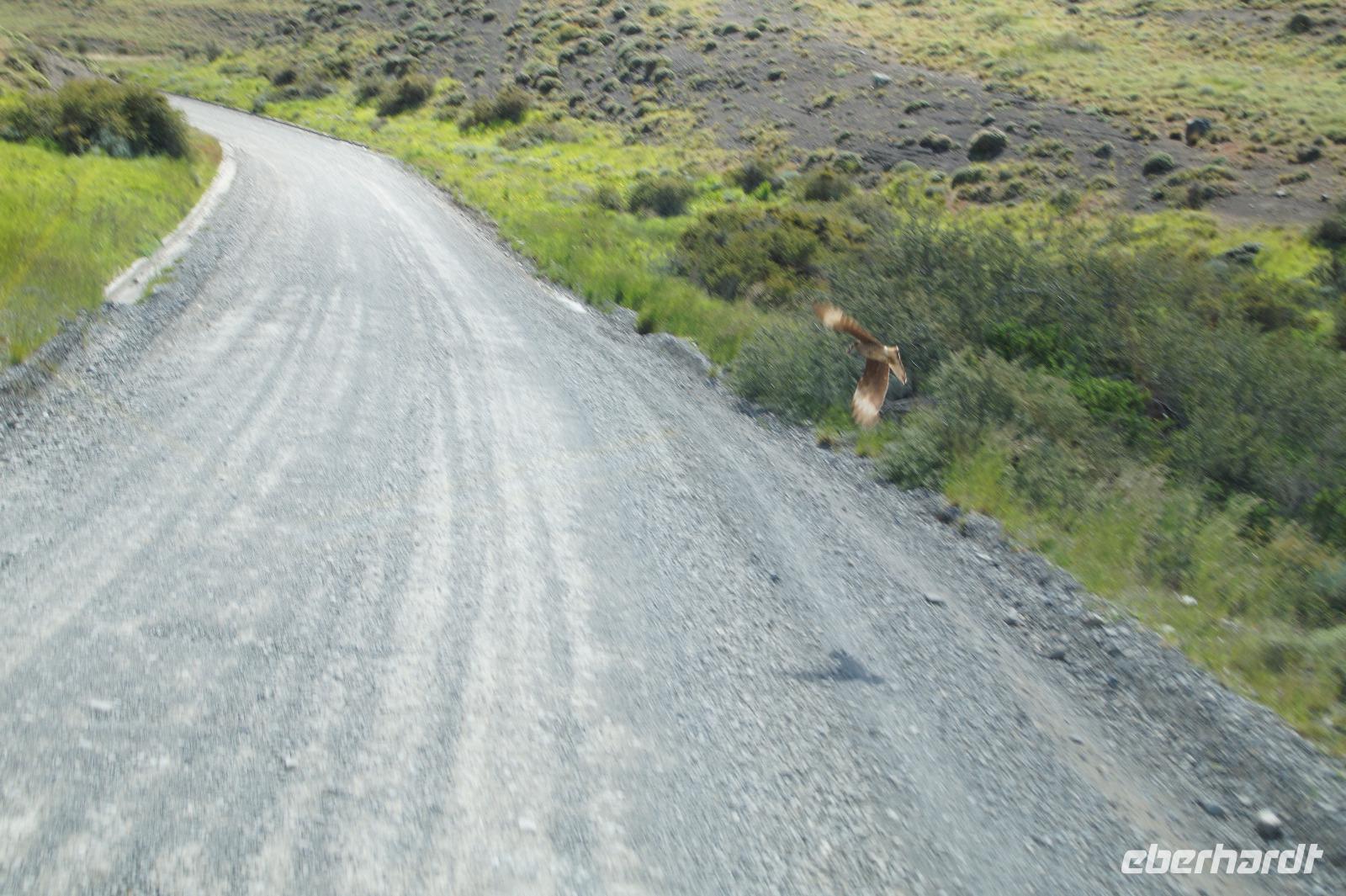 Kurz nach unserer Abfahrt vom Flughafen begegnen wir unseren ersten Ñandús und Guanacos; irgendwo in der Steppe halten wir auch mal an, um von einer kleinen Guanaco-Herde Fotos zu machen. Wir sehen den Lago Argentino und den Lago Viedma.
