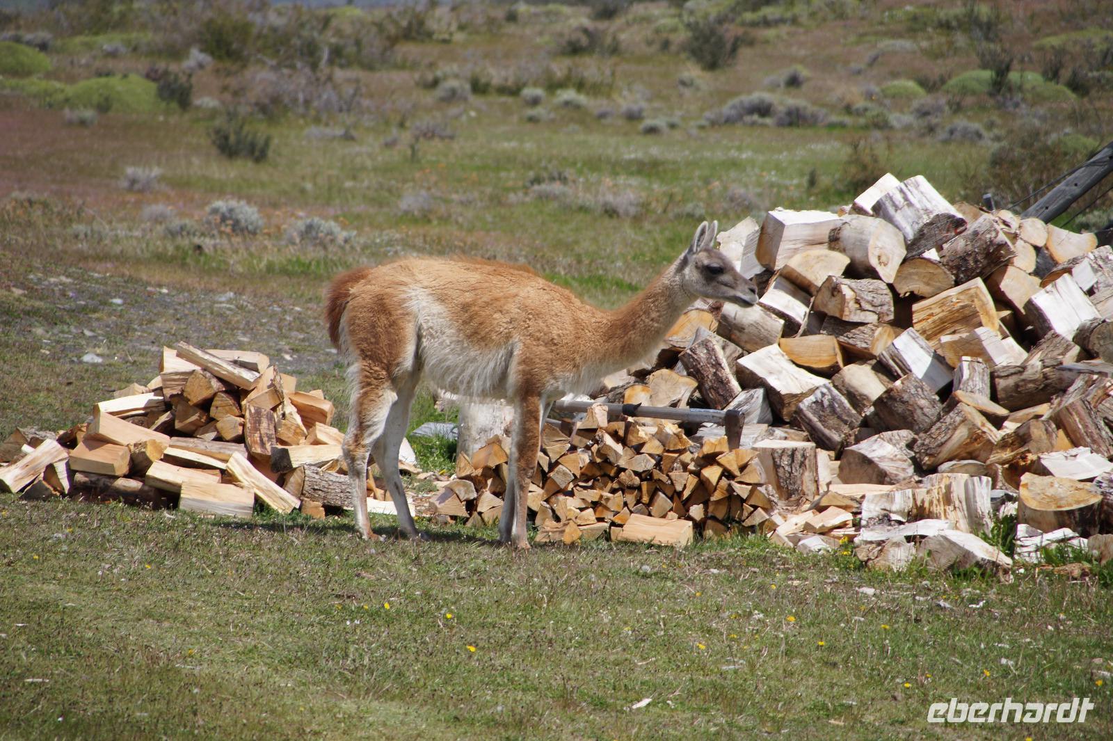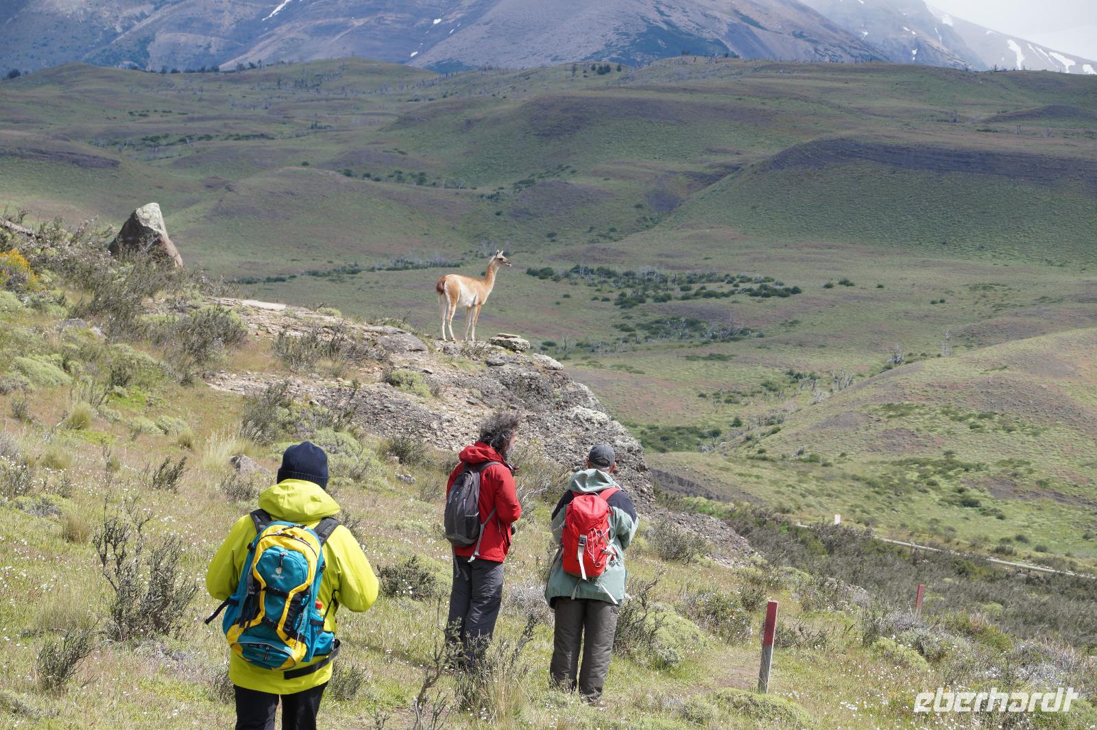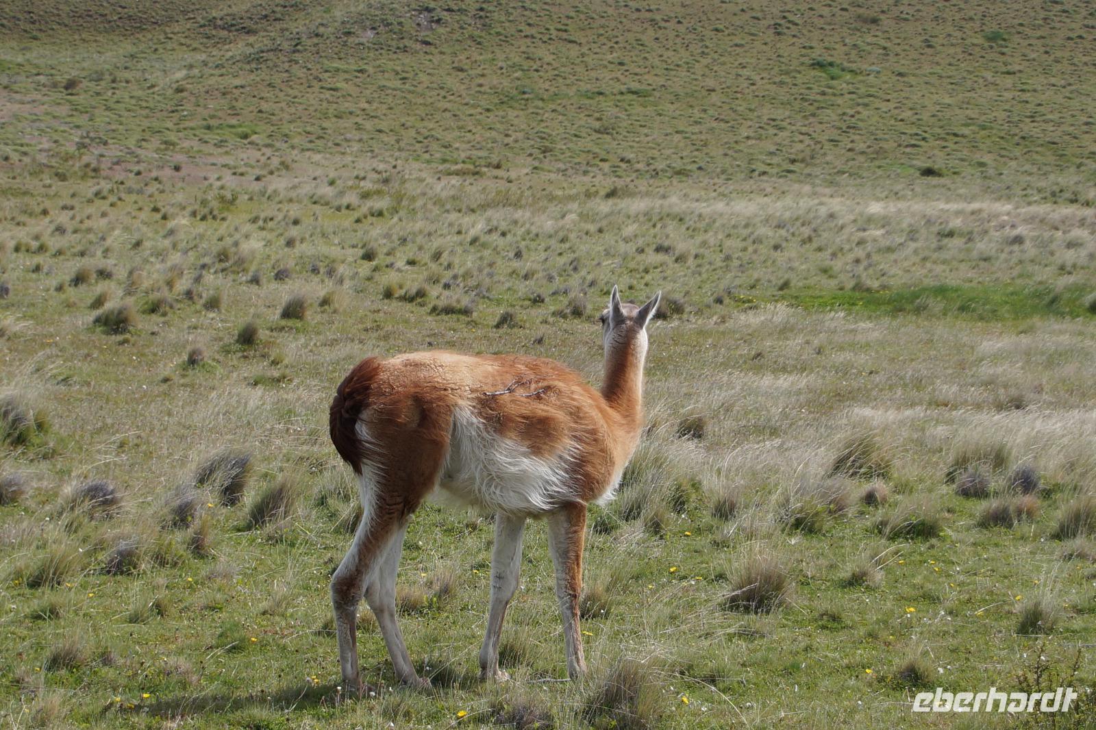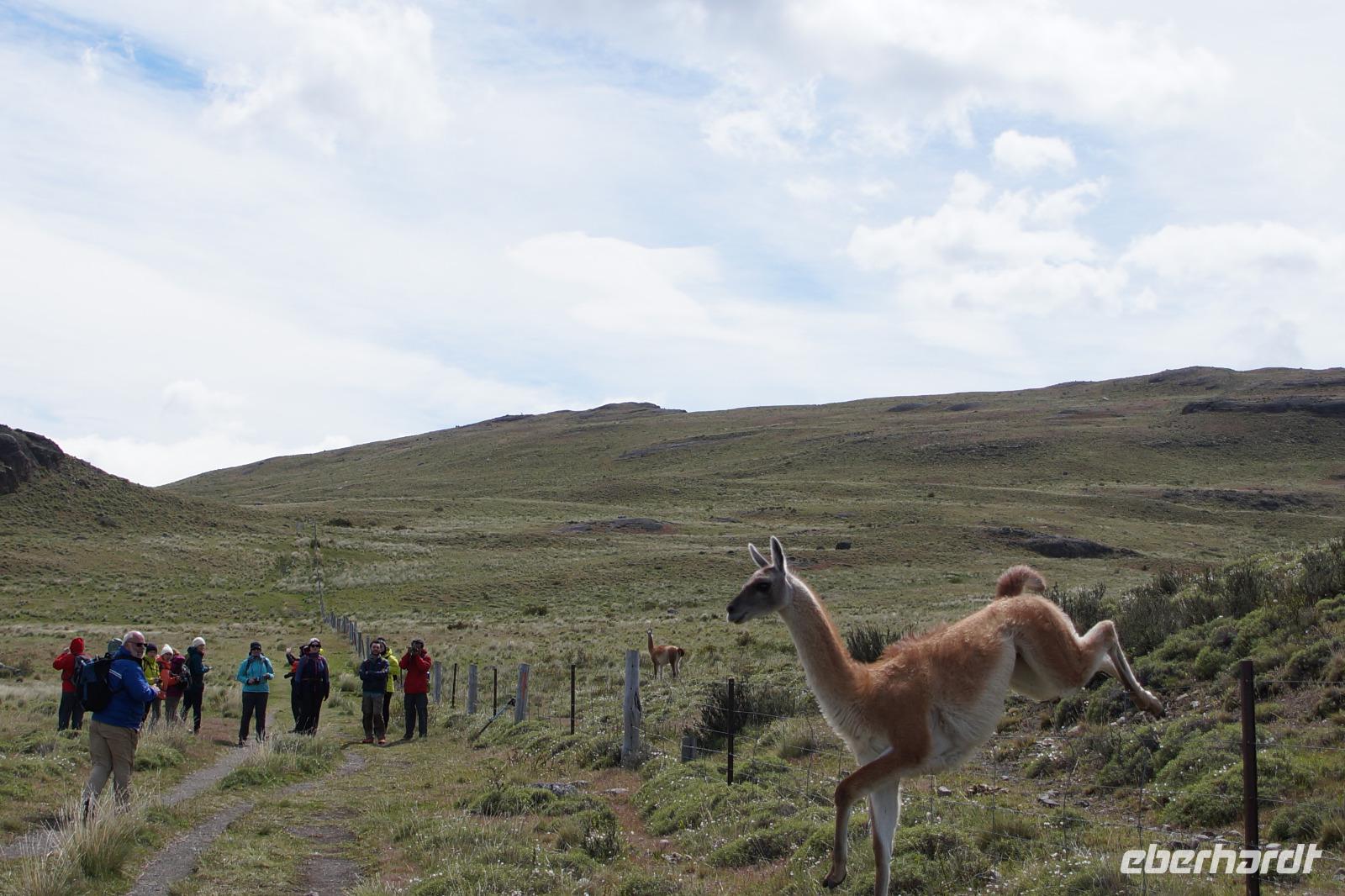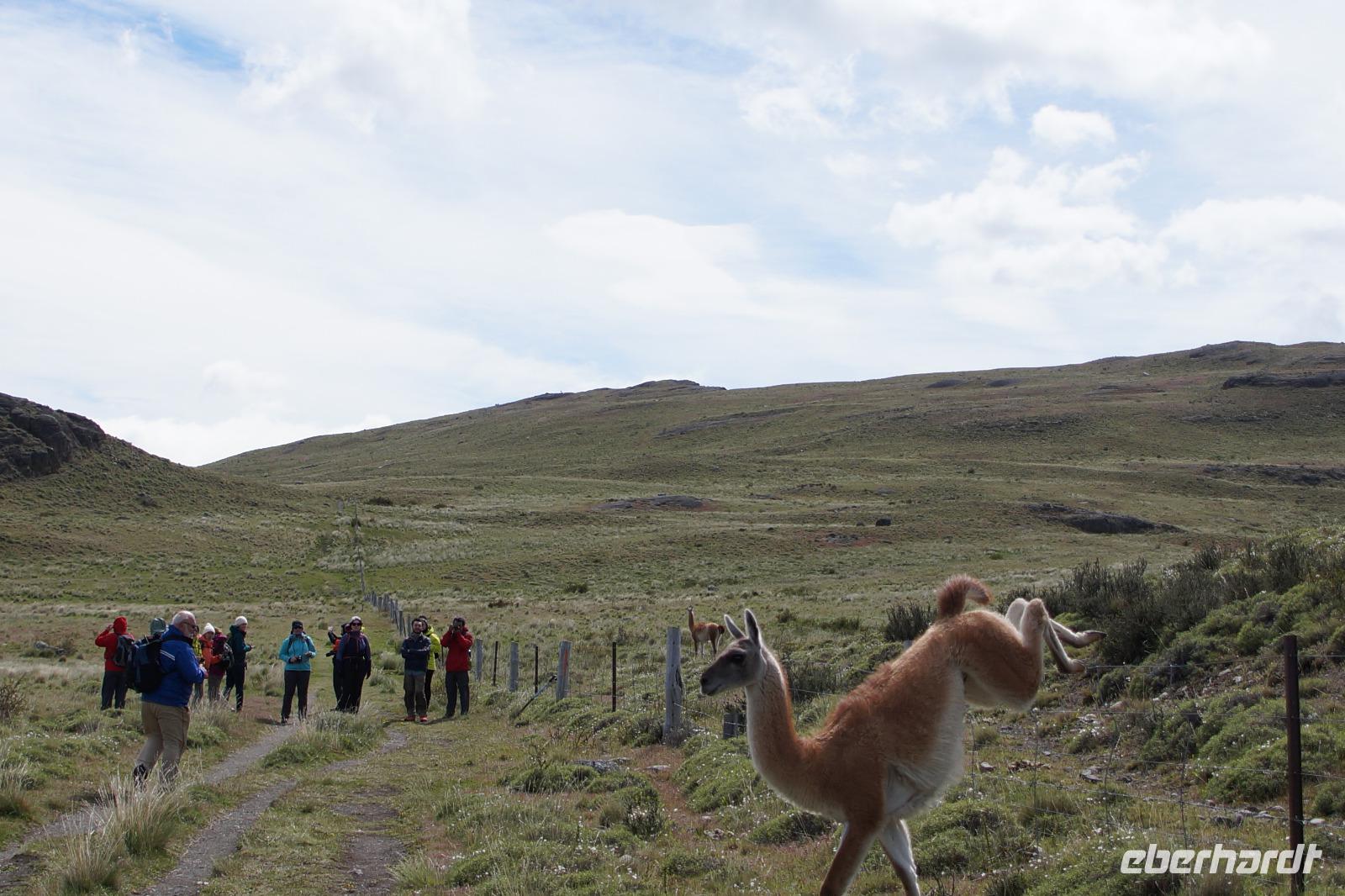 Im weiteren Verlauf unserer Wanderung konnten wir uns davon überzeugen, wie wenig Scheu die Guanacos - mindestens hier im Nationalpark - vor uns Menschen zeigen, aber auch über die Anwesenheit von Pumas. Wir sahen zwar in der Tat keinen einzigen der amerikanischen Silberlöwen - was mancher Schade fand, manch anderer begrüßte - aber überall entlang des Zauns an der Nationalparkgrenze fanden wir in Form von Guanaco-Knochen die Überreste seiner Mahlzeiten.