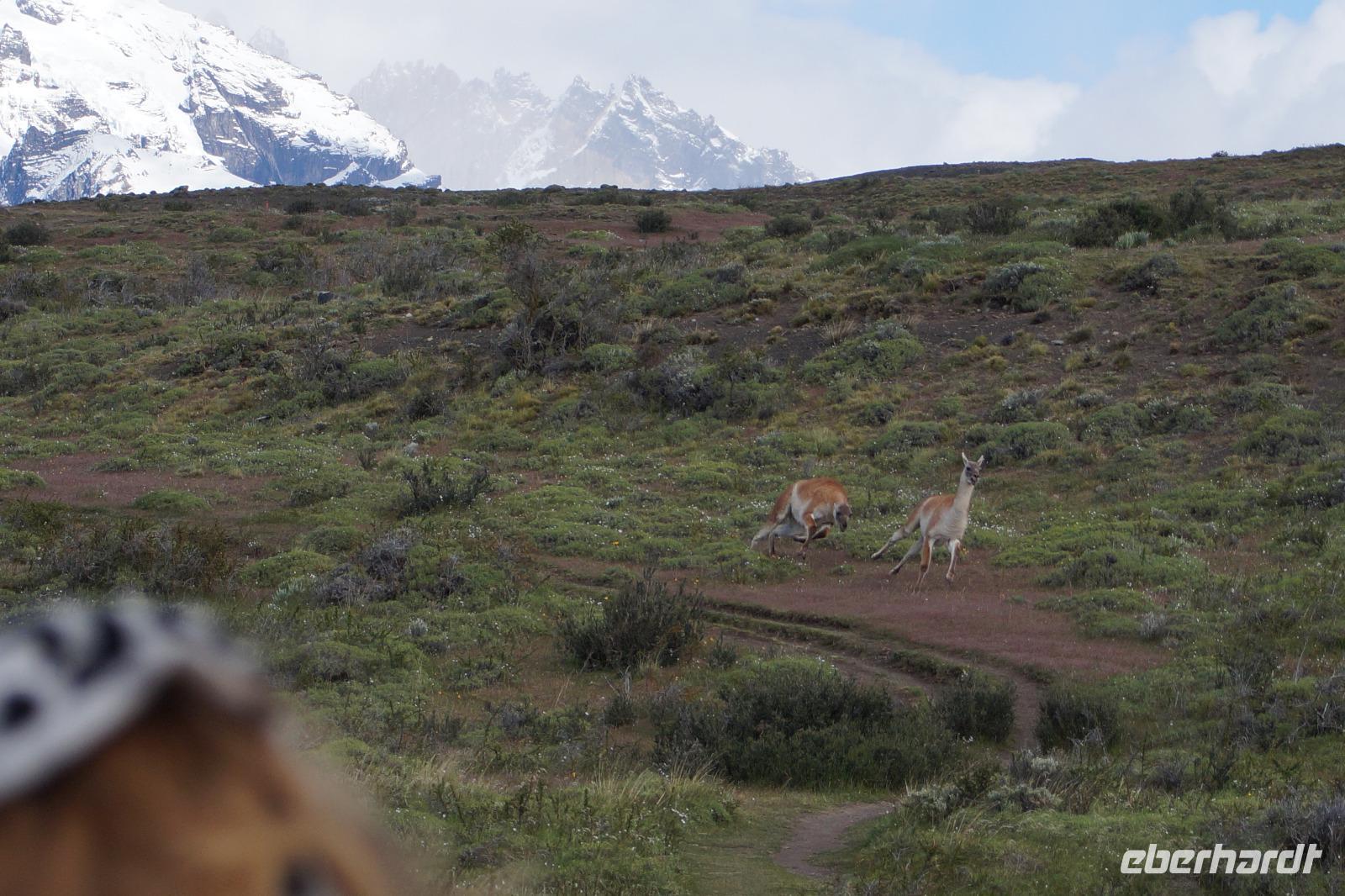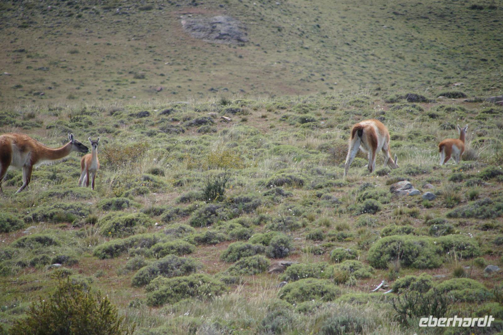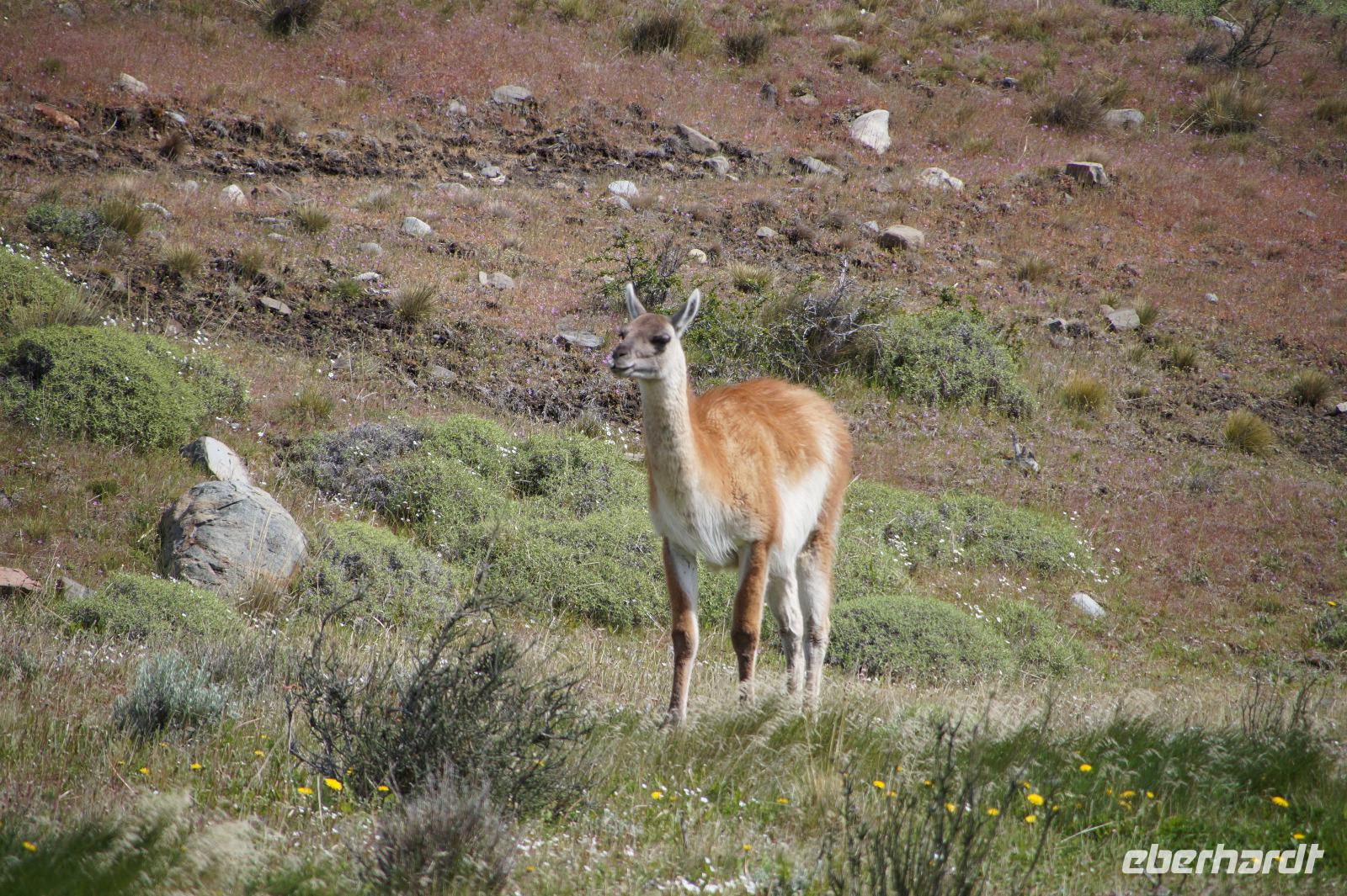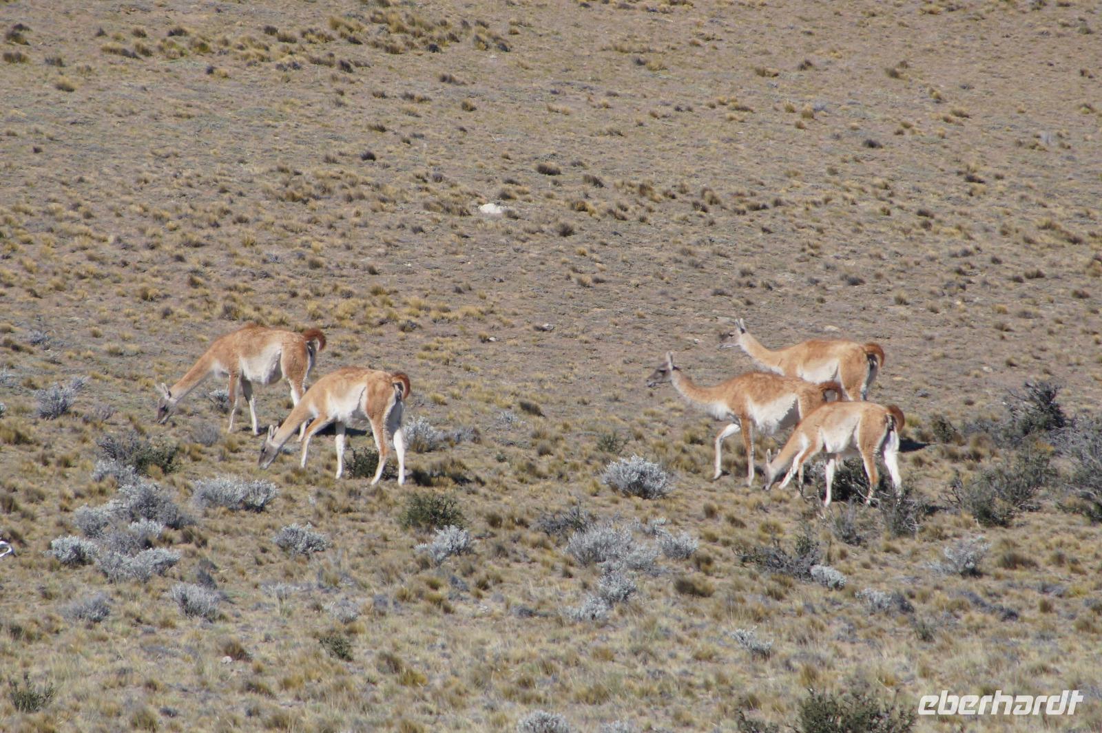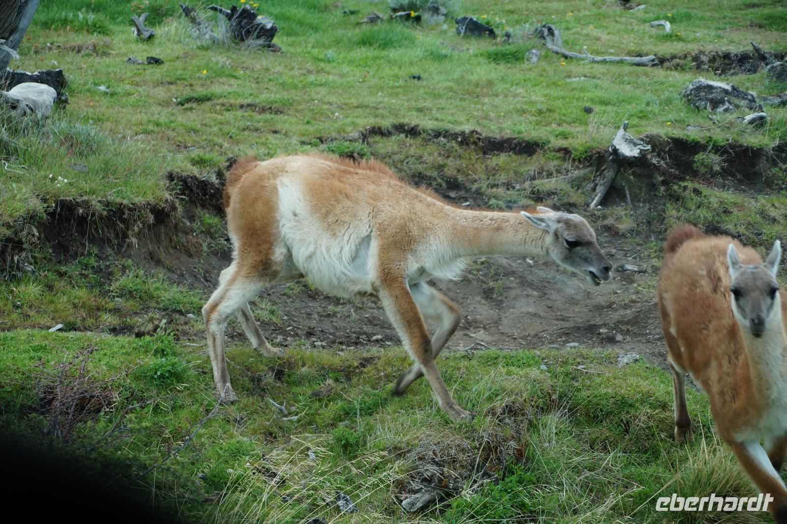 Im weiteren Verlauf unserer Wanderung konnten wir uns davon überzeugen, wie wenig Scheu die Guanacos - mindestens hier im Nationalpark - vor uns Menschen zeigen, aber auch über die Anwesenheit von Pumas. Wir sahen zwar in der Tat keinen einzigen der amerikanischen Silberlöwen - was mancher Schade fand, manch anderer begrüßte - aber überall entlang des Zauns an der Nationalparkgrenze fanden wir in Form von Guanaco-Knochen die Überreste seiner Mahlzeiten.
