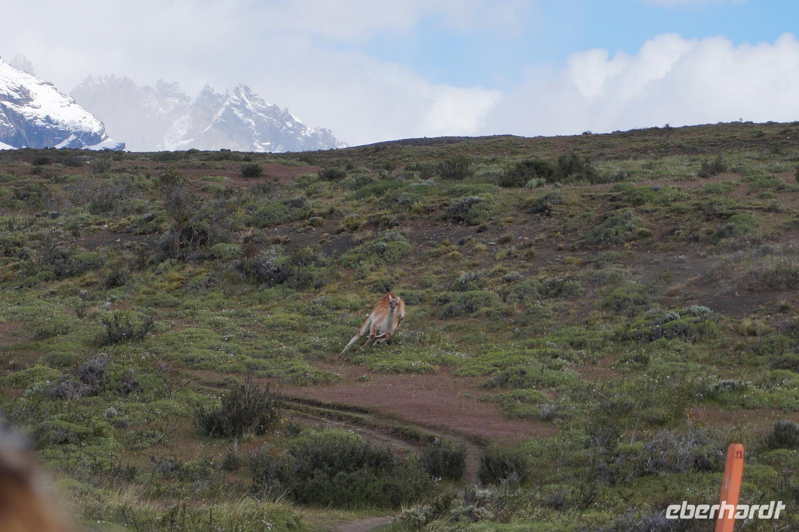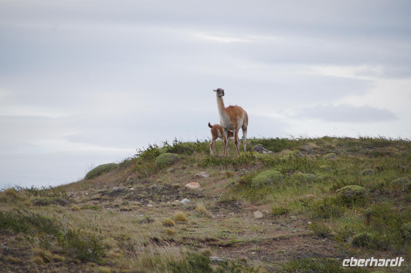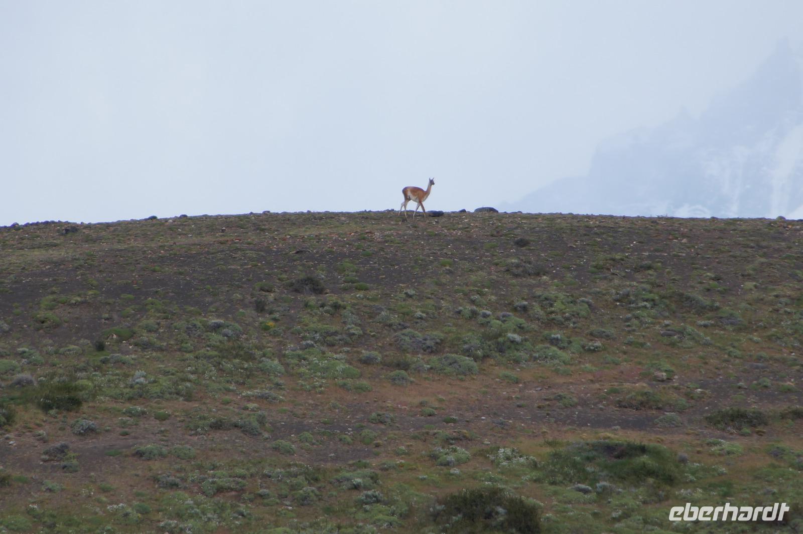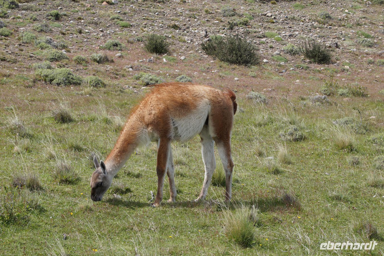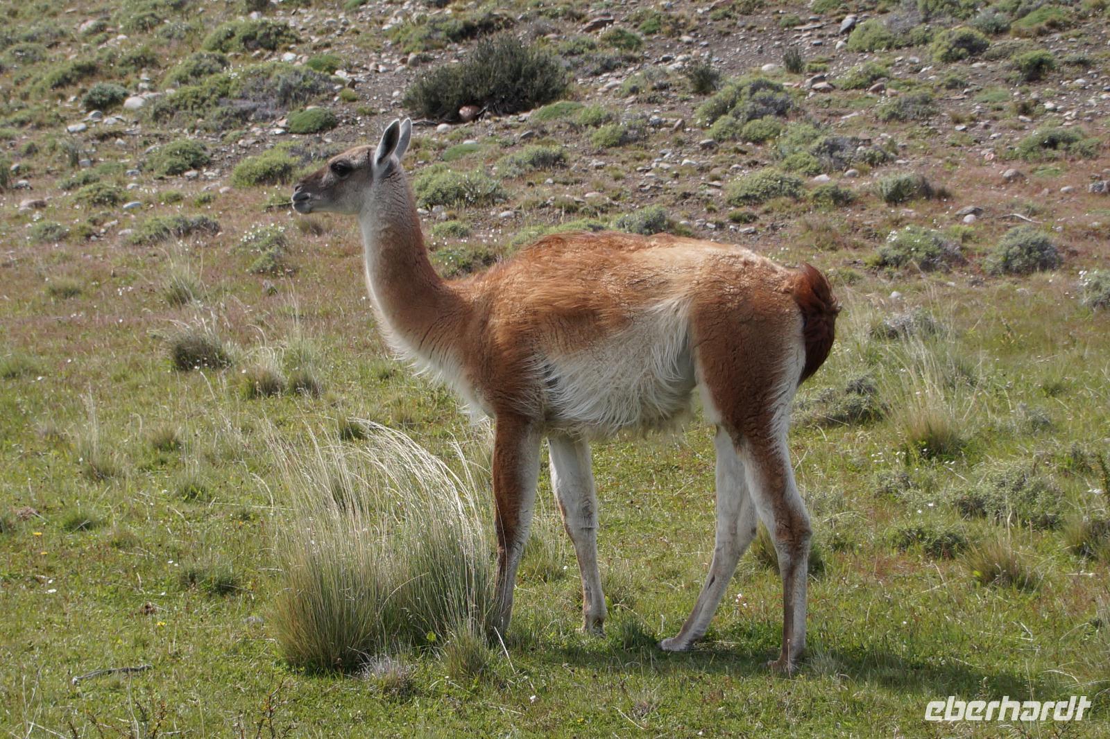 Im weiteren Verlauf unserer Wanderung konnten wir uns davon überzeugen, wie wenig Scheu die Guanacos - mindestens hier im Nationalpark - vor uns Menschen zeigen, aber auch über die Anwesenheit von Pumas. Wir sahen zwar in der Tat keinen einzigen der amerikanischen Silberlöwen - was mancher Schade fand, manch anderer begrüßte - aber überall entlang des Zauns an der Nationalparkgrenze fanden wir in Form von Guanaco-Knochen die Überreste seiner Mahlzeiten.