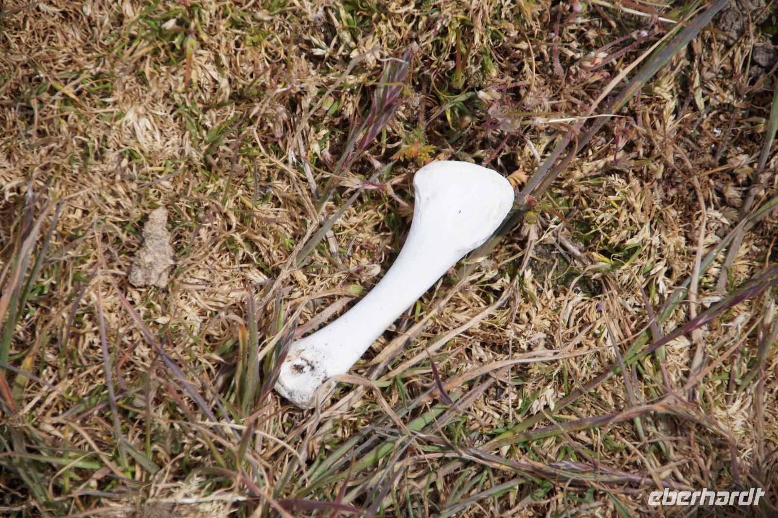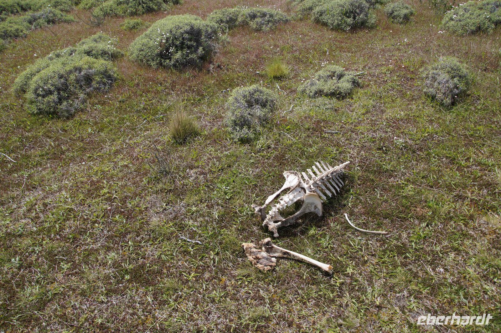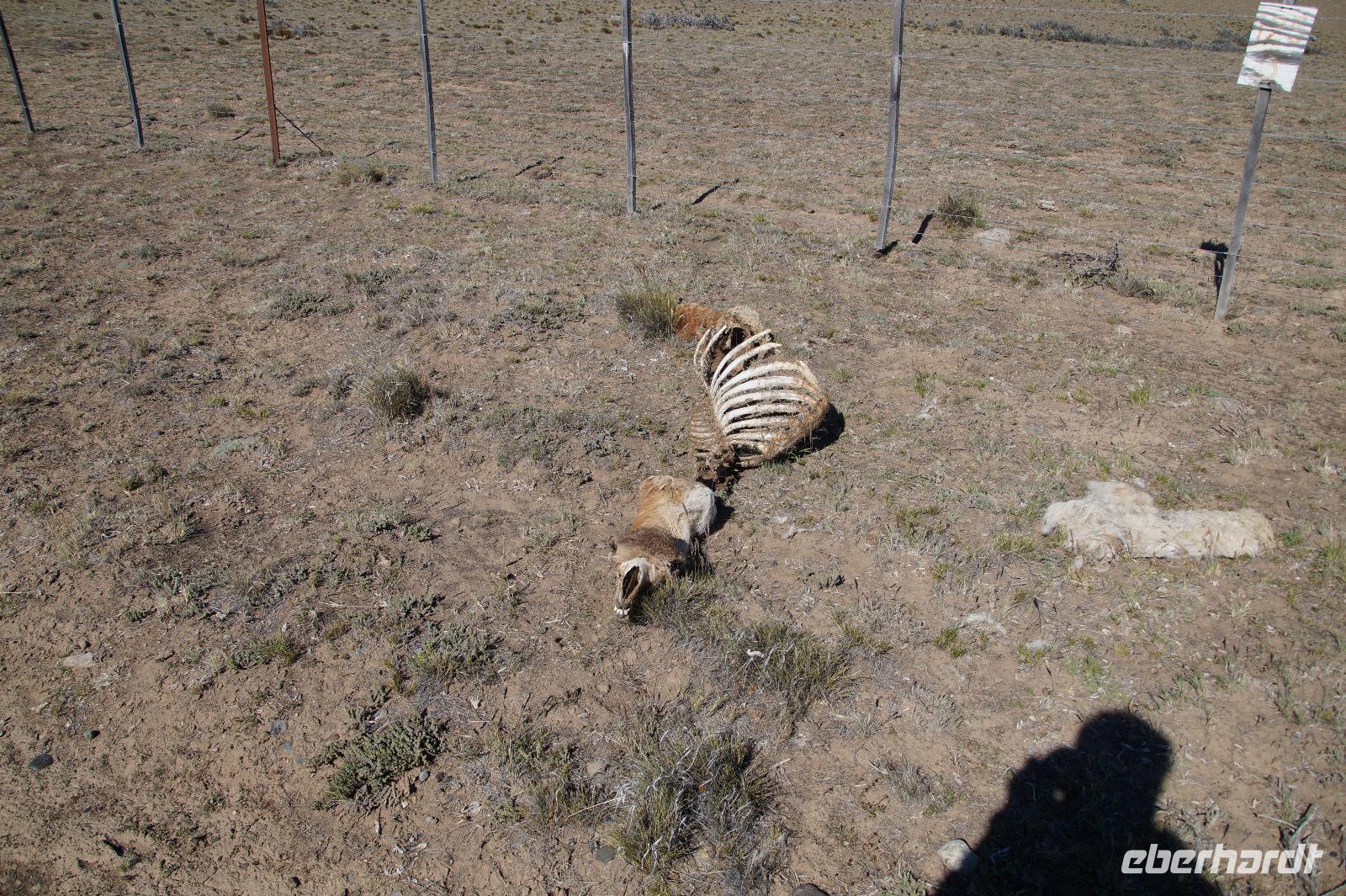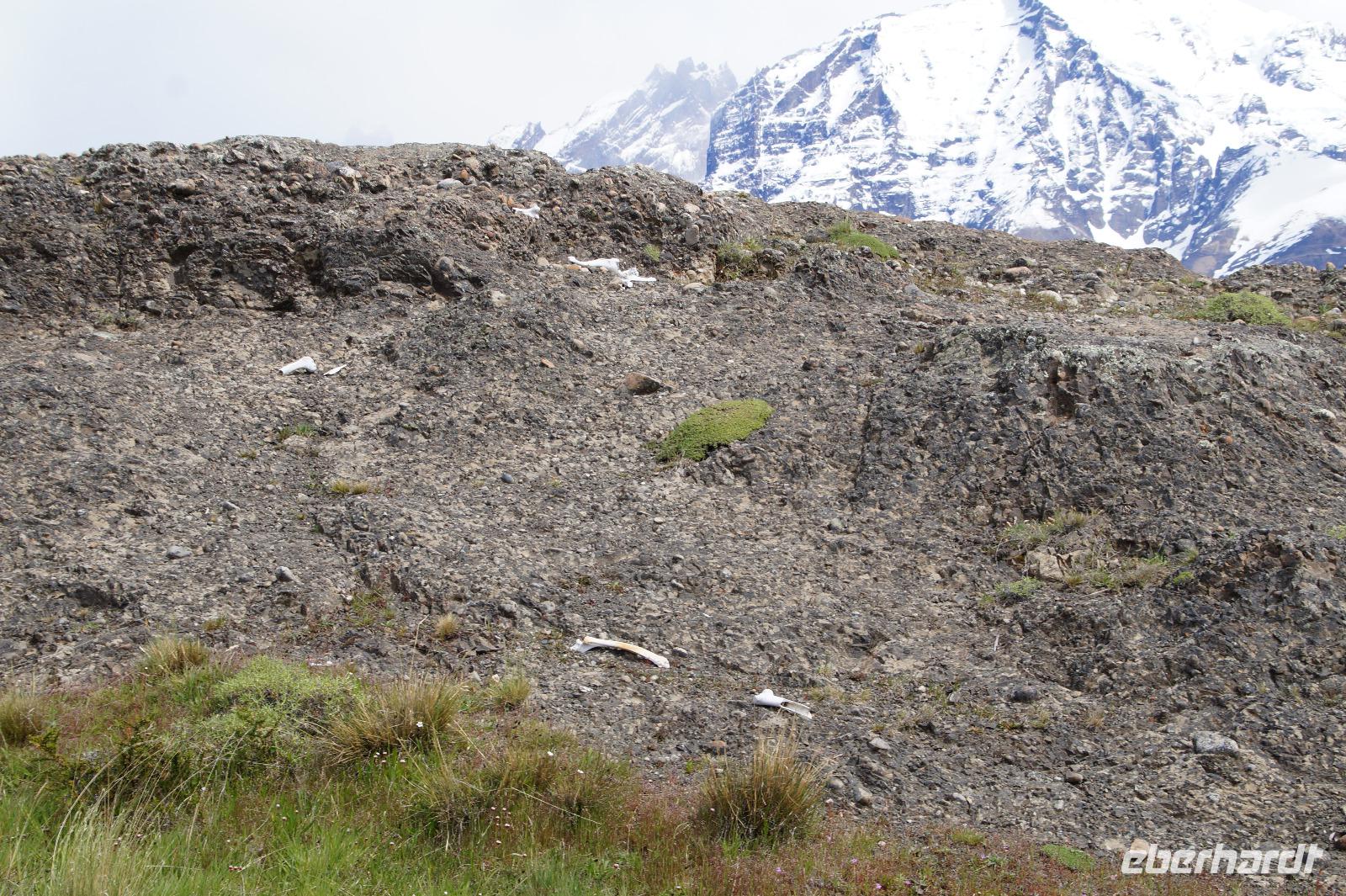 Kaum waren wir losgegangen, fanden wir schon den ersten Rest eines Guanacos. Pancho, unser hiesiger Wanderführer erklärte uns, dass die Pumas gerne in diesem Gebiet an der Grenze des Nationalparks jagten, weil schwächere Guanacos den Zaun, der eine Schafs-Estancia vom Nationalpark trennt, häufig nicht überqueren können, sie verheddern sich oder der Zaun schneidet ihnen Rückzugsmöglichkeiten ab. Die Pumas bedecken die Kadaver der von ihnen erlegten Tiere mit Gestrüpp, um sie vor Aasfressern zu verbergen und kommen über mehrere Tage immer wieder zum Fressen zurück.