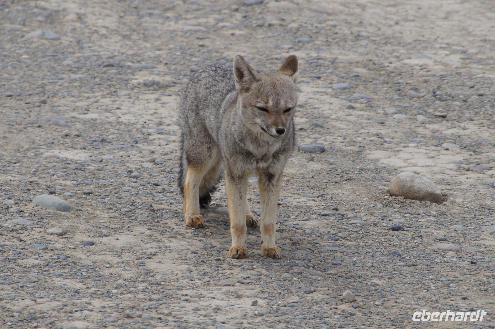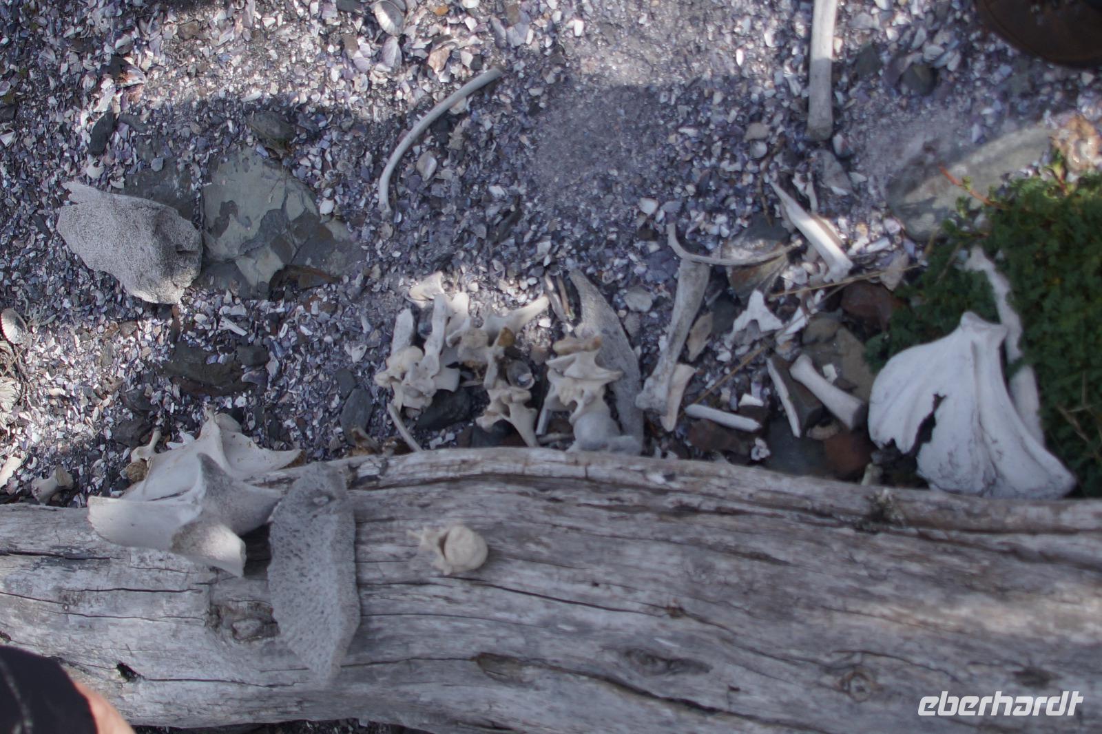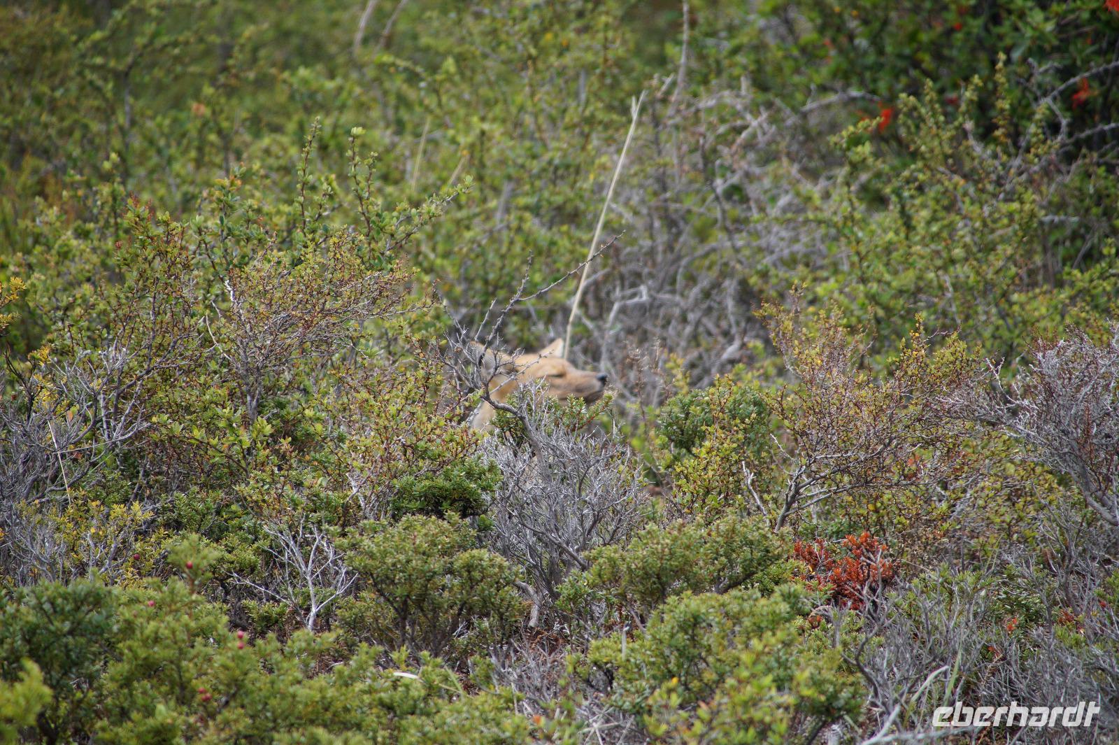 Kaum waren wir losgegangen, fanden wir schon den ersten Rest eines Guanacos. Pancho, unser hiesiger Wanderführer erklärte uns, dass die Pumas gerne in diesem Gebiet an der Grenze des Nationalparks jagten, weil schwächere Guanacos den Zaun, der eine Schafs-Estancia vom Nationalpark trennt, häufig nicht überqueren können, sie verheddern sich oder der Zaun schneidet ihnen Rückzugsmöglichkeiten ab. Die Pumas bedecken die Kadaver der von ihnen erlegten Tiere mit Gestrüpp, um sie vor Aasfressern zu verbergen und kommen über mehrere Tage immer wieder zum Fressen zurück.