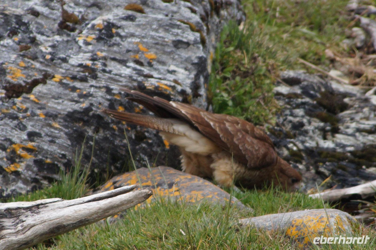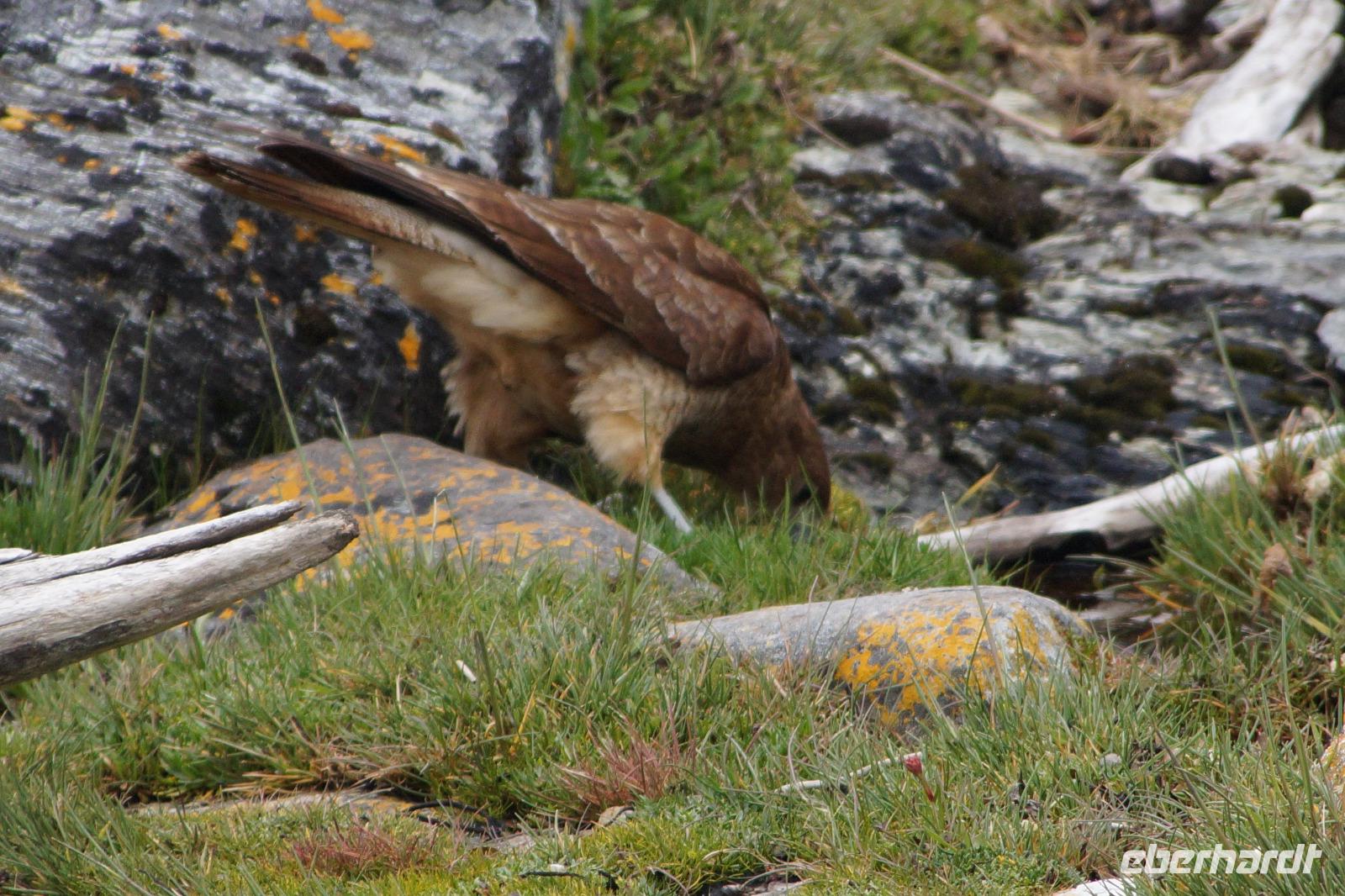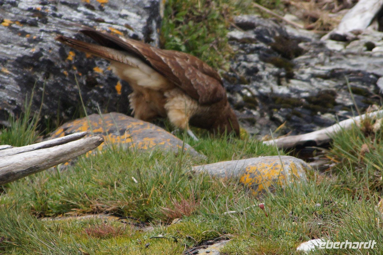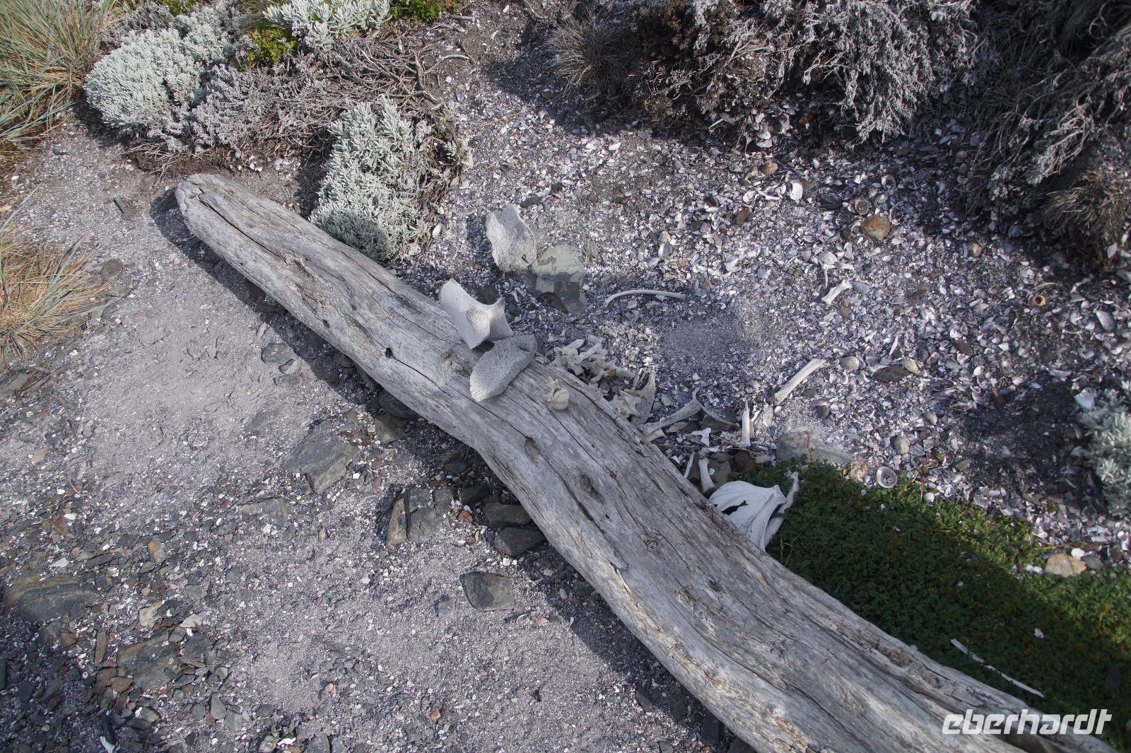 Kaum waren wir losgegangen, fanden wir schon den ersten Rest eines Guanacos. Pancho, unser hiesiger Wanderführer erklärte uns, dass die Pumas gerne in diesem Gebiet an der Grenze des Nationalparks jagten, weil schwächere Guanacos den Zaun, der eine Schafs-Estancia vom Nationalpark trennt, häufig nicht überqueren können, sie verheddern sich oder der Zaun schneidet ihnen Rückzugsmöglichkeiten ab. Die Pumas bedecken die Kadaver der von ihnen erlegten Tiere mit Gestrüpp, um sie vor Aasfressern zu verbergen und kommen über mehrere Tage immer wieder zum Fressen zurück.