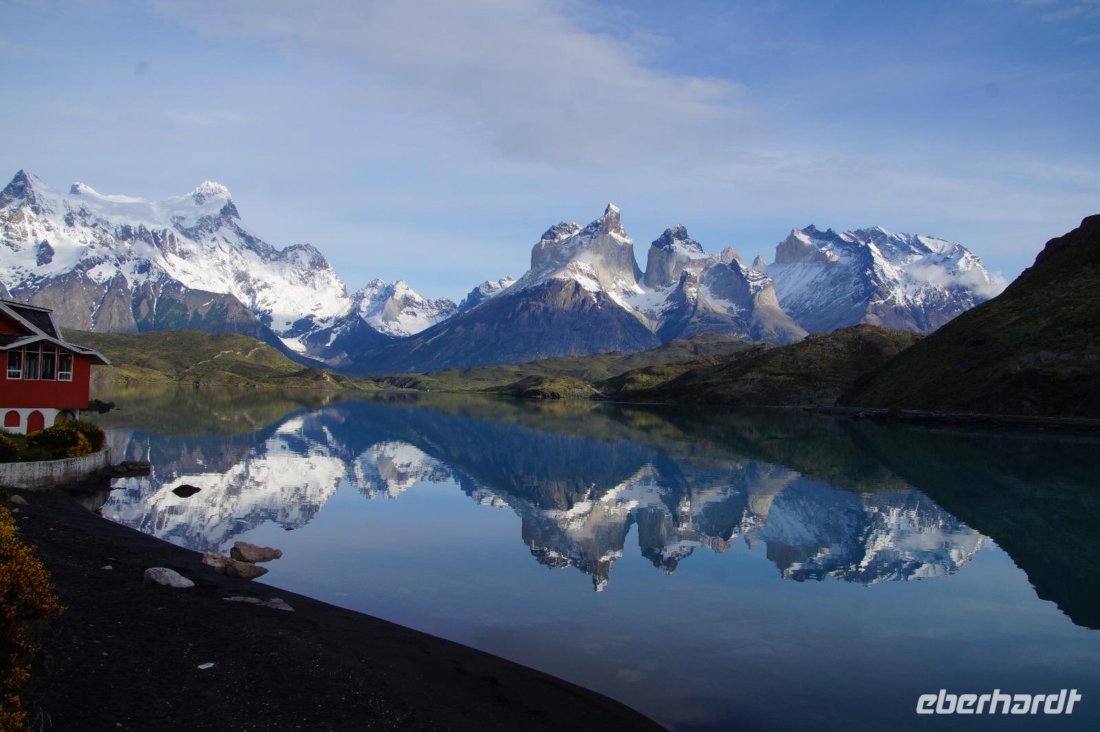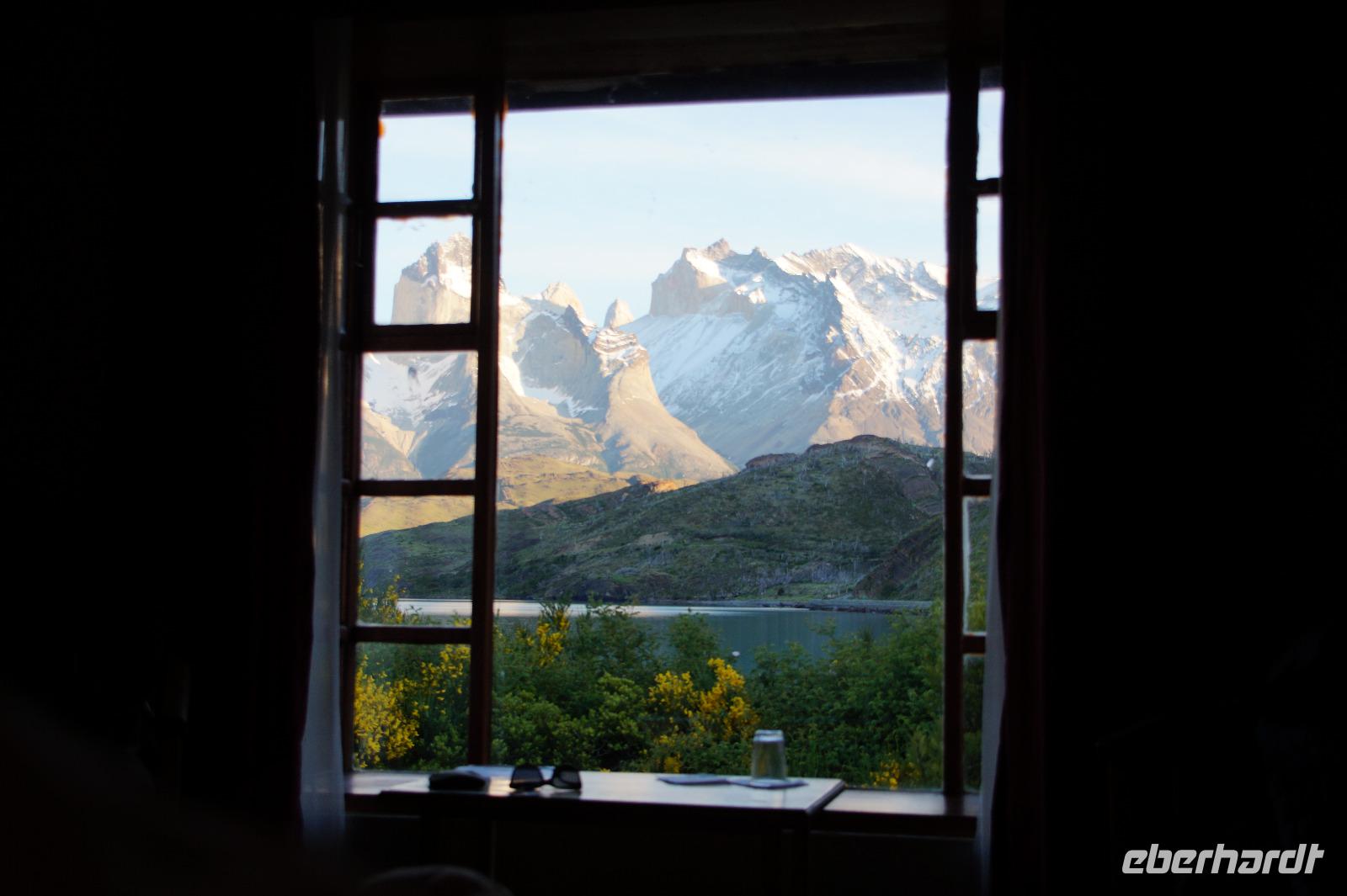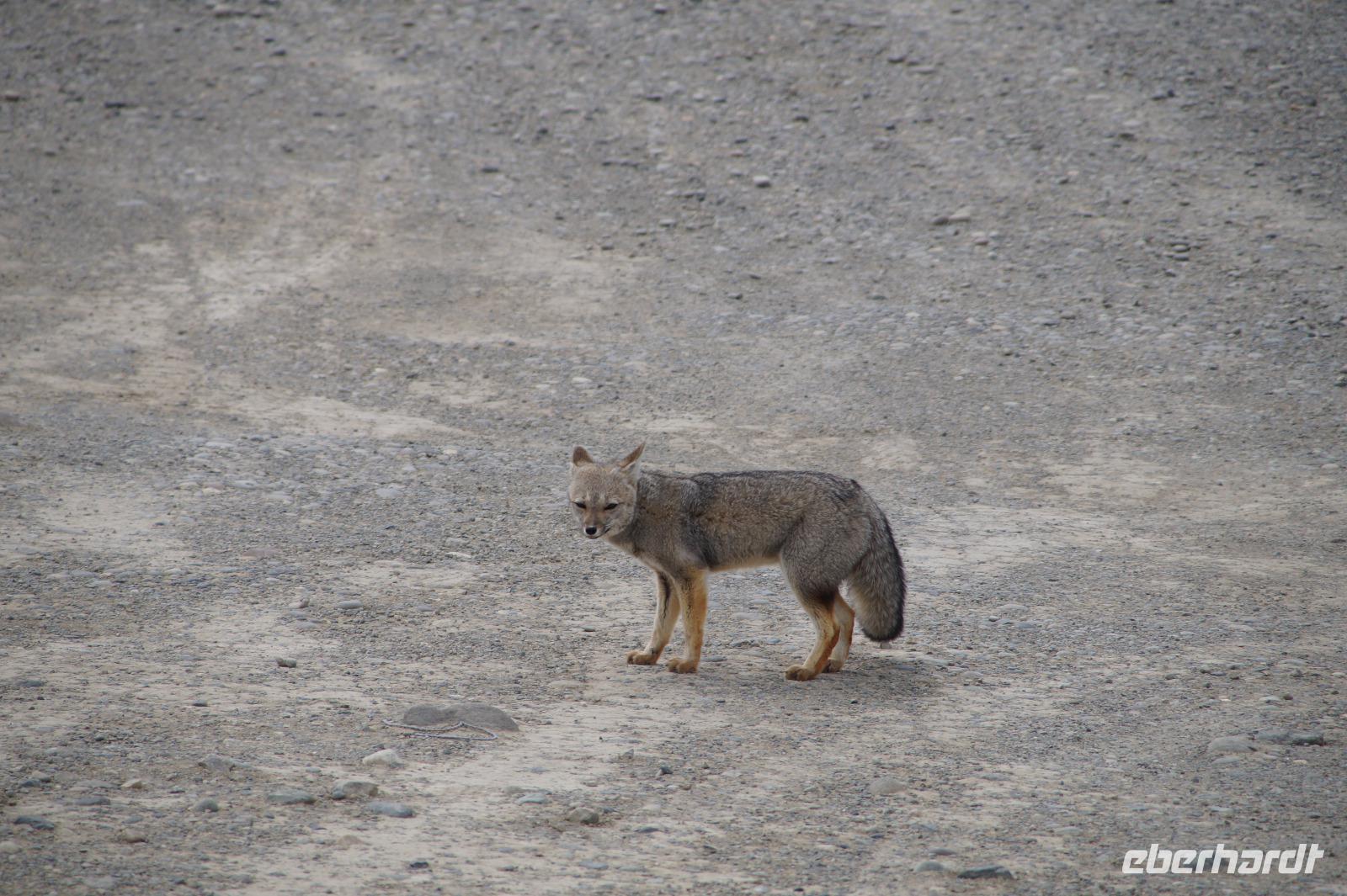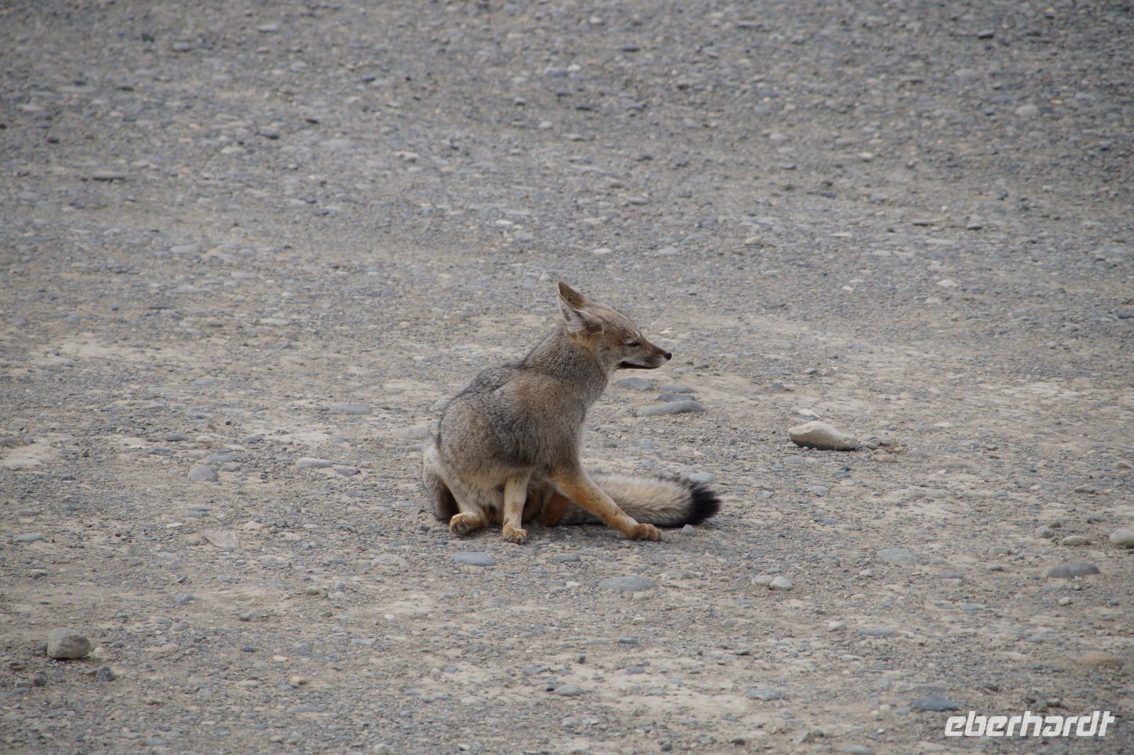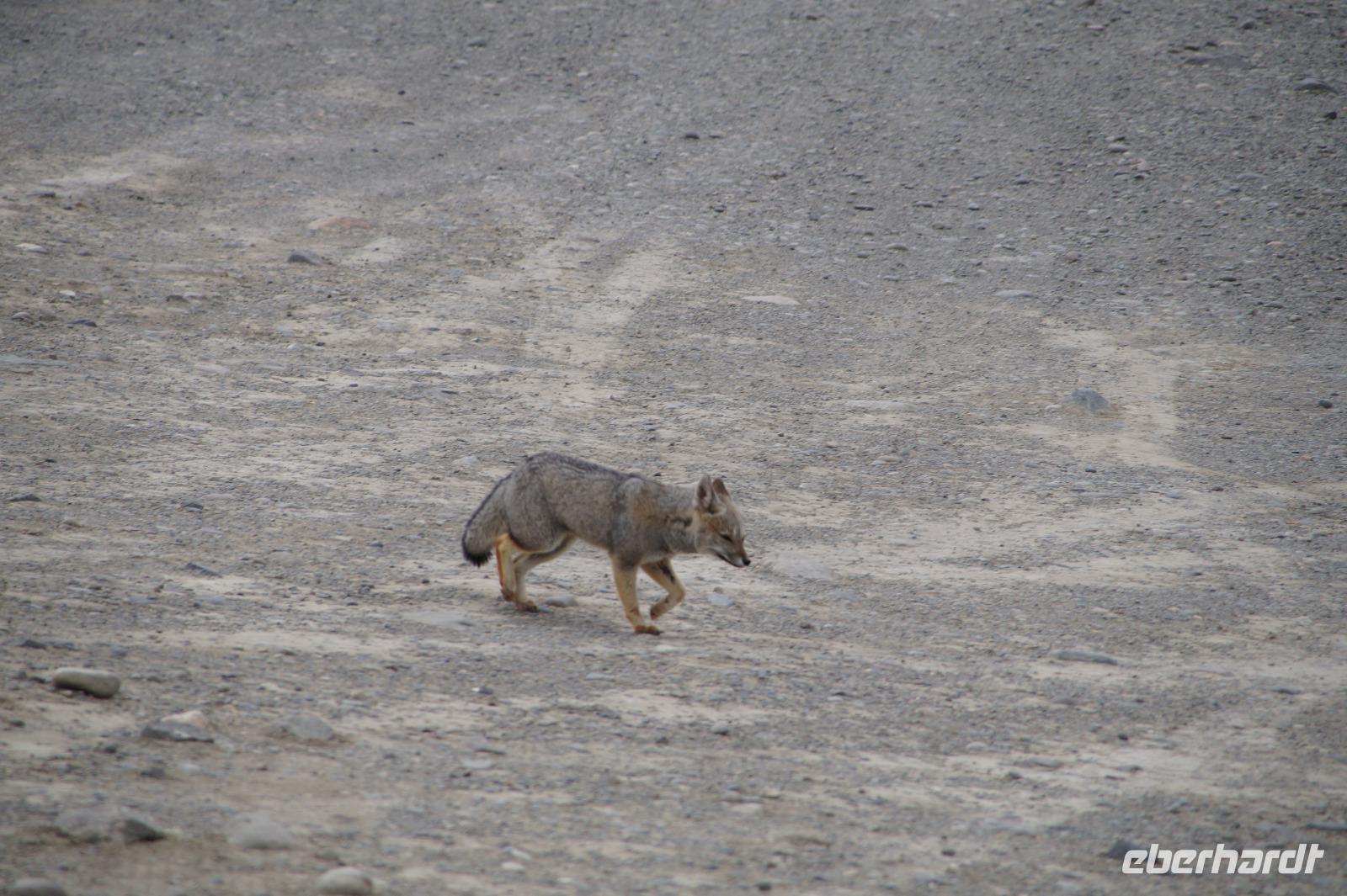 An der Grenze wechselten wir Geld und machten Mittag. Vorbei an einander jagenden Guanacos und einem Fuchsbau, wo unter der Aufsicht eines Elterntiers ein paar Jungtiere herumtollten, erreichten wir schließlich den Lago Sarmiento. Von hier aus war es nicht mehr weit bis in den Torres del Paine-Nationalpark, in dem auch unser Hotel lag, bei dem wir nach mehreren Fotostopps ankamen.
