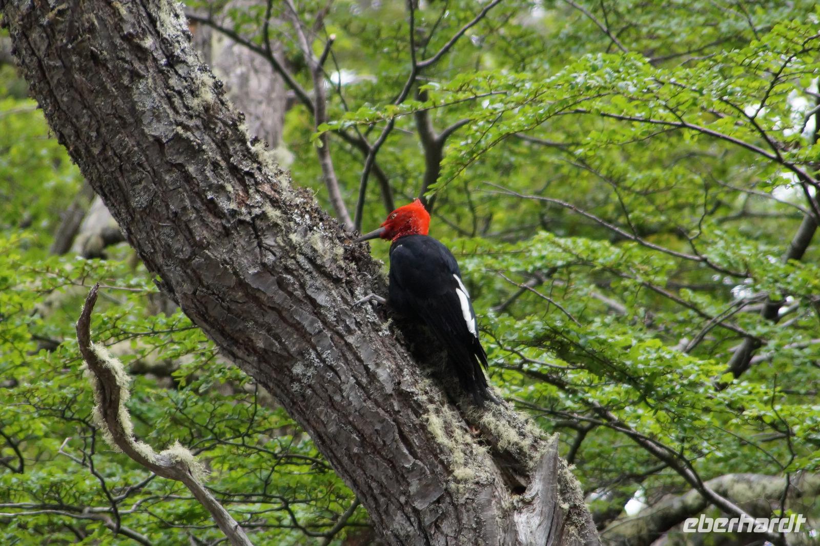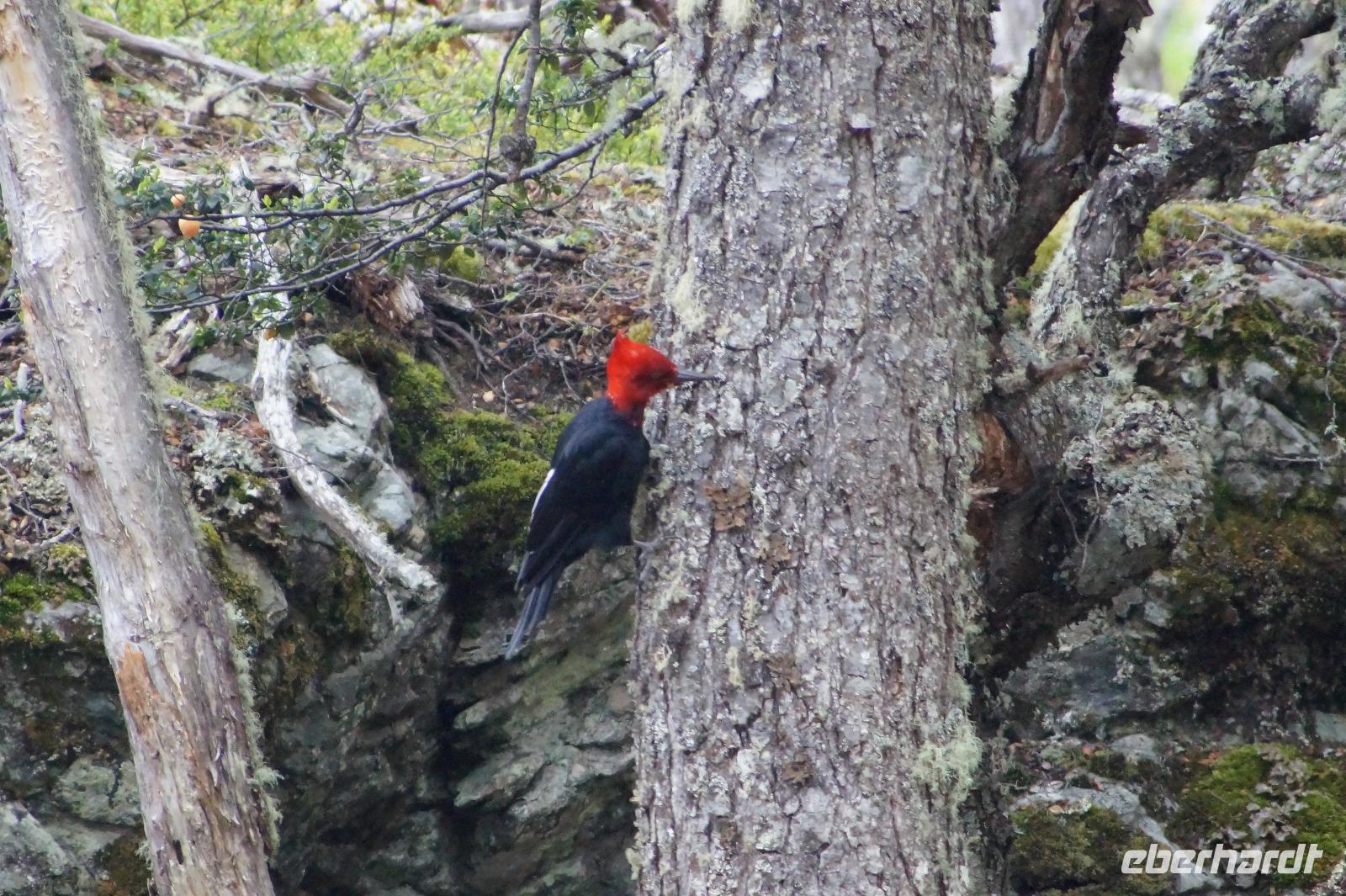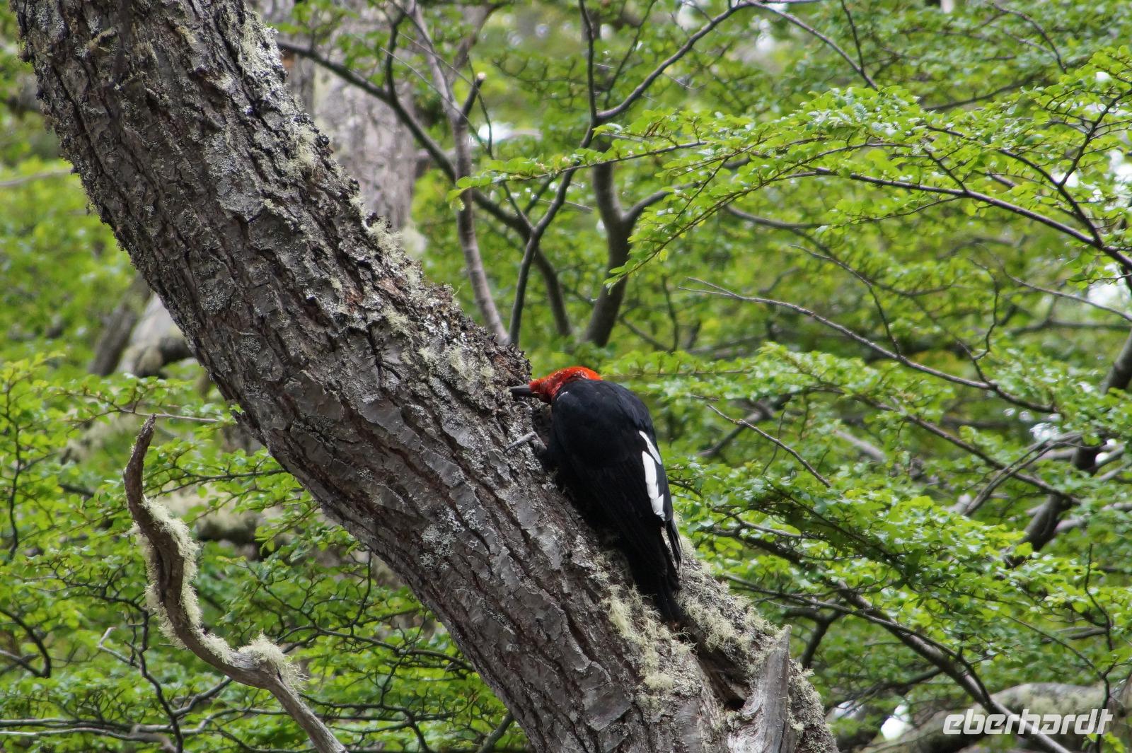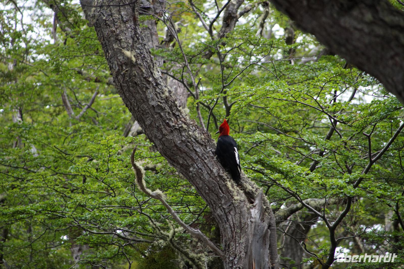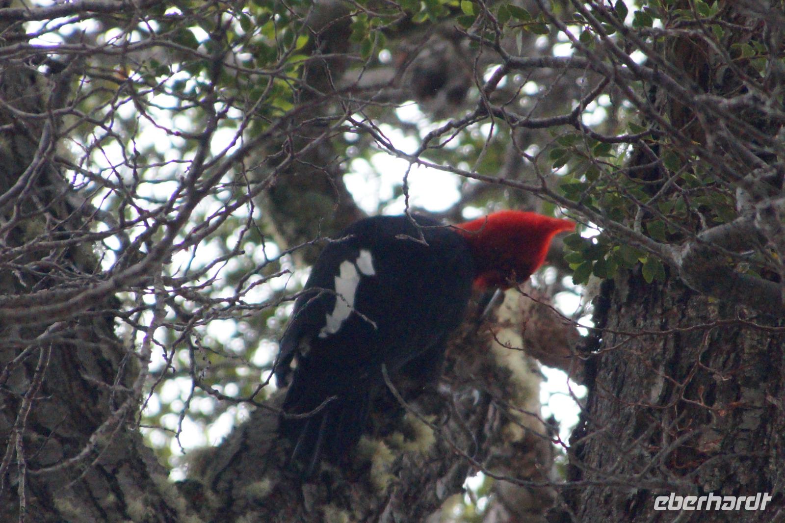 Vom Postamt am Ende der Bahnlinie aus starteten wir unsere Wanderung in Richtung der Lapataia-Bucht, einer Seitenbucht des Beagle Canals. Hier begegneten wir wieder unserem Specht, den wir schon auf unserer zweiten Wanderung gesehen hatten, ich persönlich habe zwei Männchen und ein Weibchen gesehen, Eli meinte, es handele sich um zwei Pärchen, die Männchen mit ihren scharlachroten Köpfen und die Weibchen mit ihren schwarzen Köpfen.