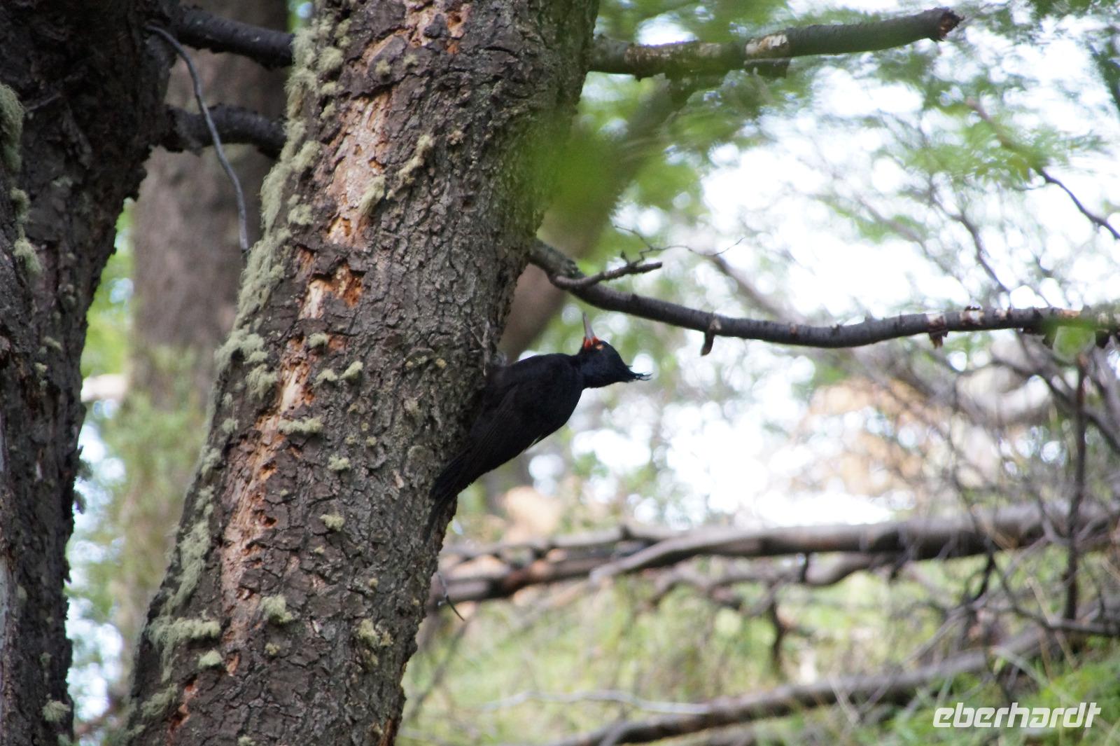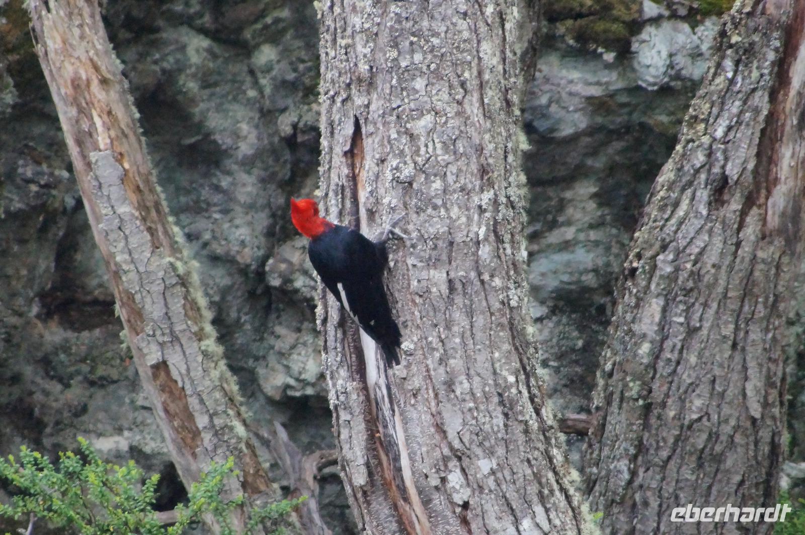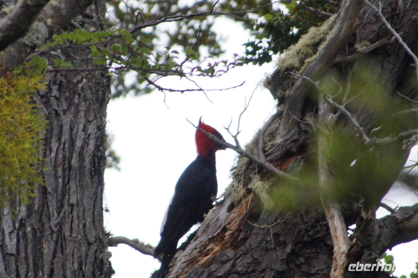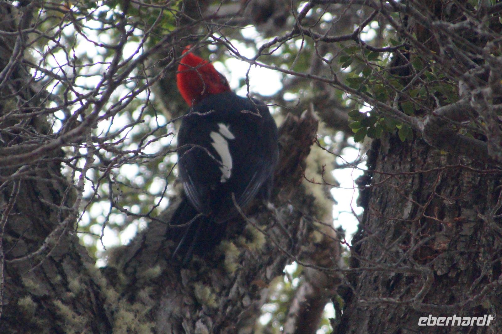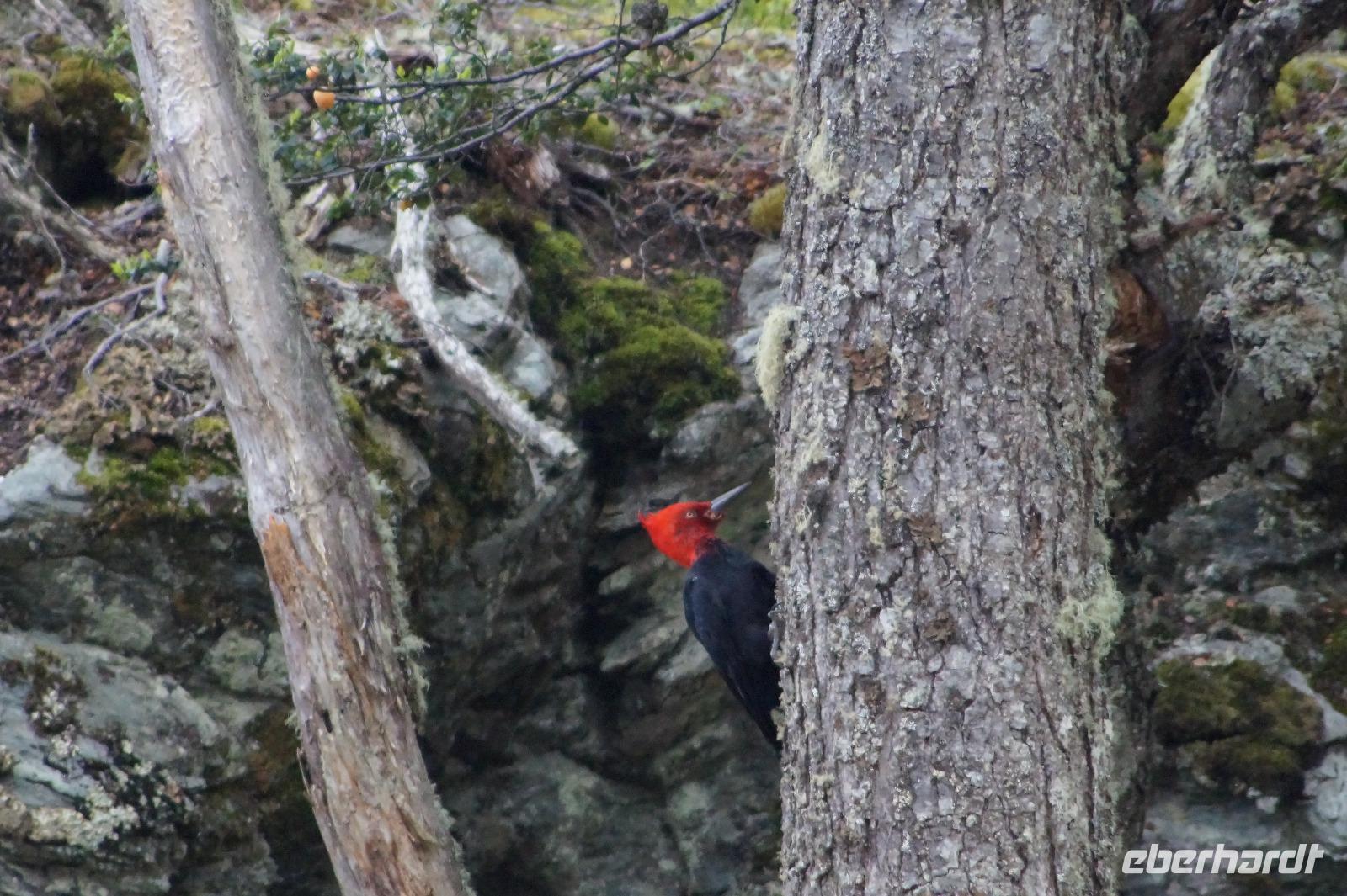 Vom Postamt am Ende der Bahnlinie aus starteten wir unsere Wanderung in Richtung der Lapataia-Bucht, einer Seitenbucht des Beagle Canals. Hier begegneten wir wieder unserem Specht, den wir schon auf unserer zweiten Wanderung gesehen hatten, ich persönlich habe zwei Männchen und ein Weibchen gesehen, Eli meinte, es handele sich um zwei Pärchen, die Männchen mit ihren scharlachroten Köpfen und die Weibchen mit ihren schwarzen Köpfen.