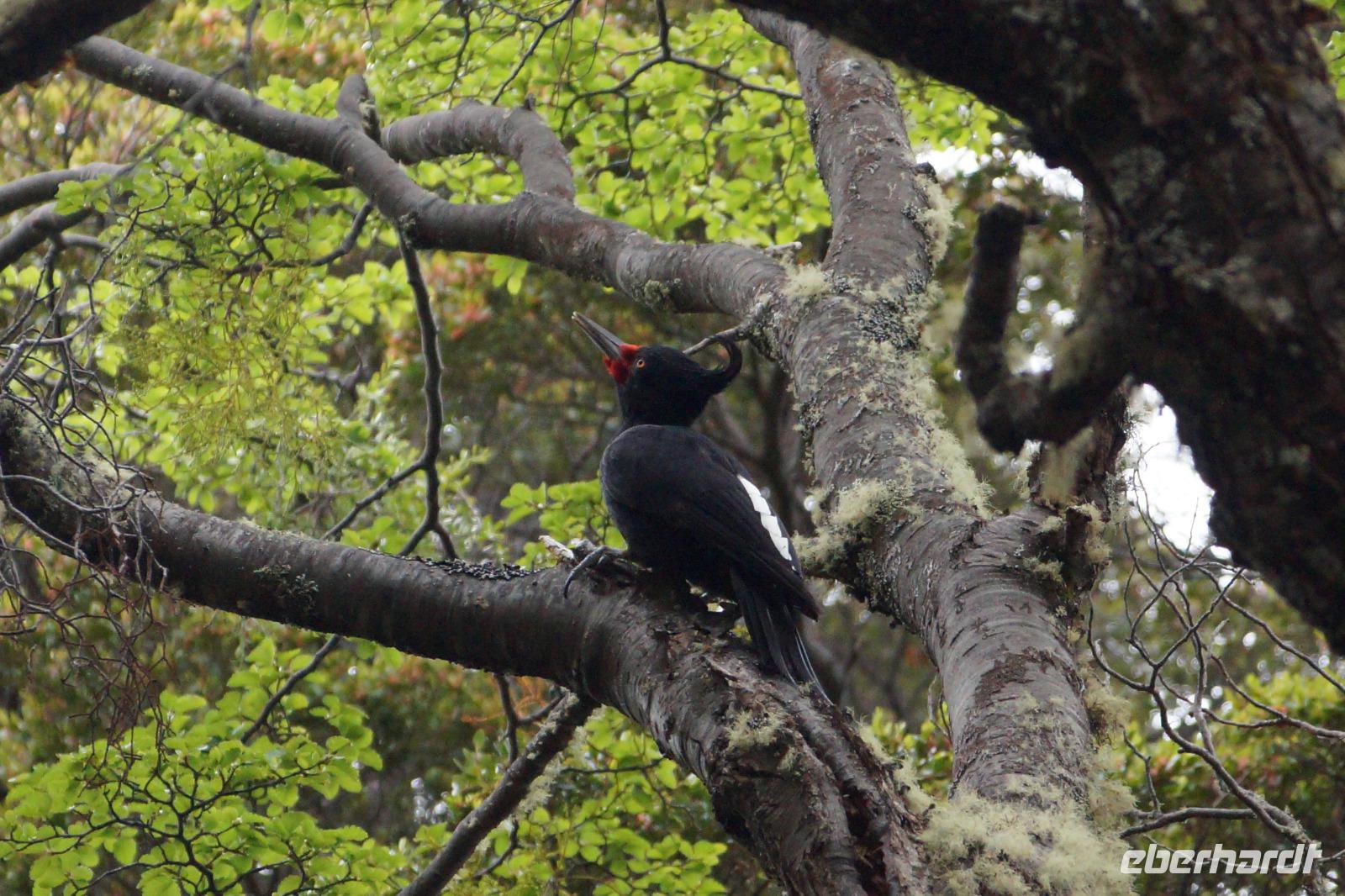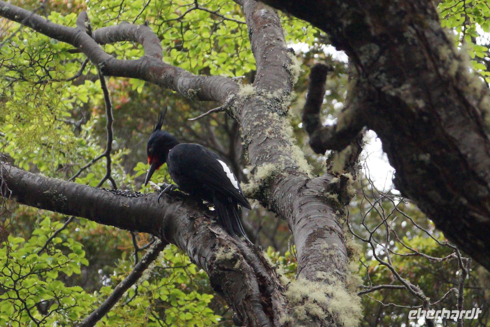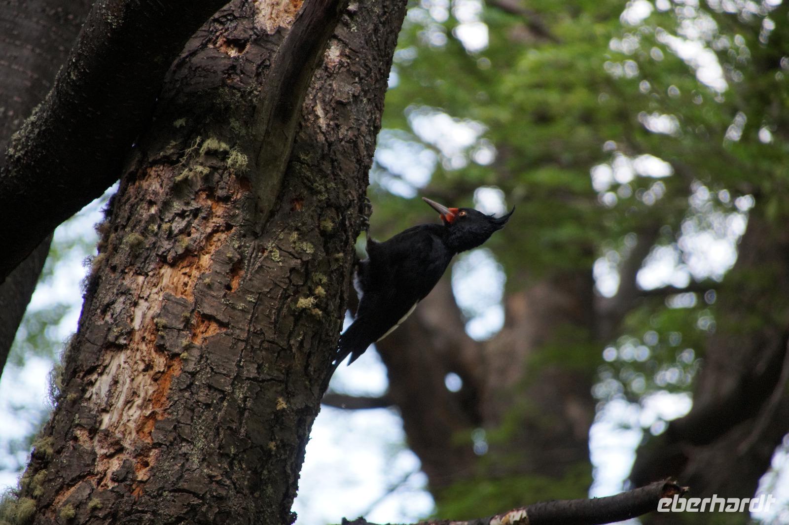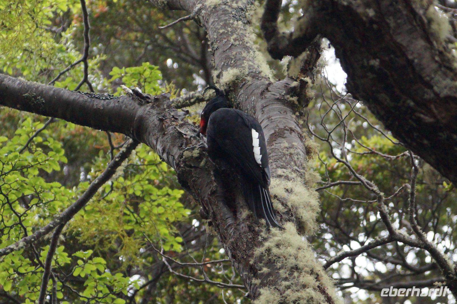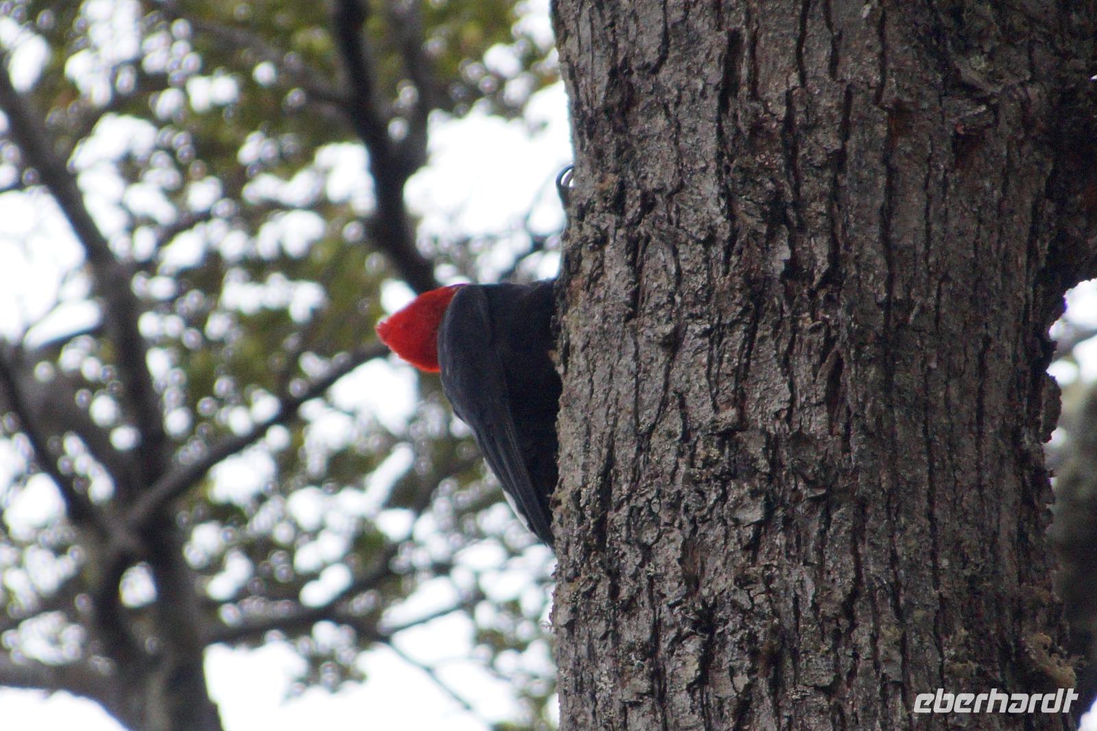 Vom Postamt am Ende der Bahnlinie aus starteten wir unsere Wanderung in Richtung der Lapataia-Bucht, einer Seitenbucht des Beagle Canals. Hier begegneten wir wieder unserem Specht, den wir schon auf unserer zweiten Wanderung gesehen hatten, ich persönlich habe zwei Männchen und ein Weibchen gesehen, Eli meinte, es handele sich um zwei Pärchen, die Männchen mit ihren scharlachroten Köpfen und die Weibchen mit ihren schwarzen Köpfen.