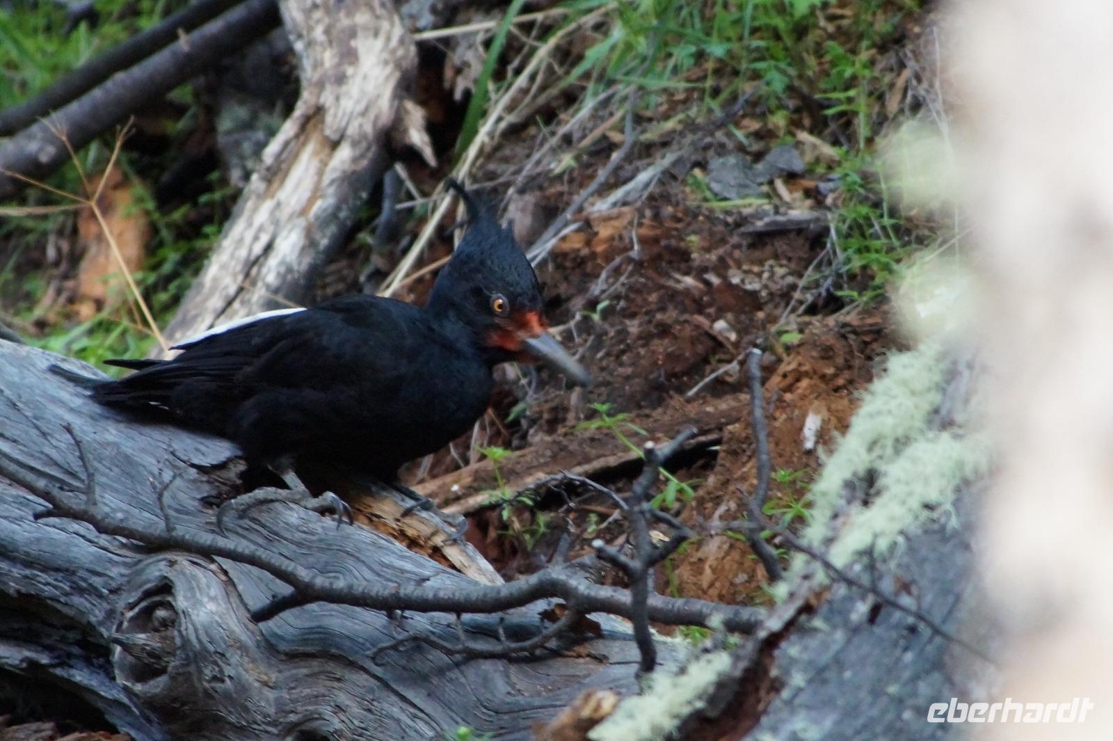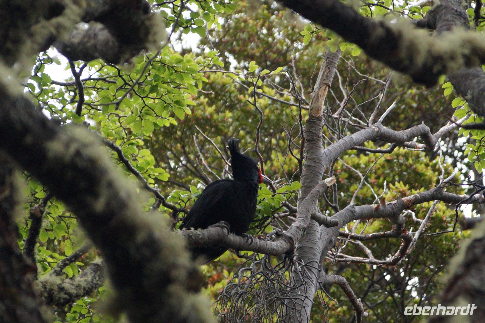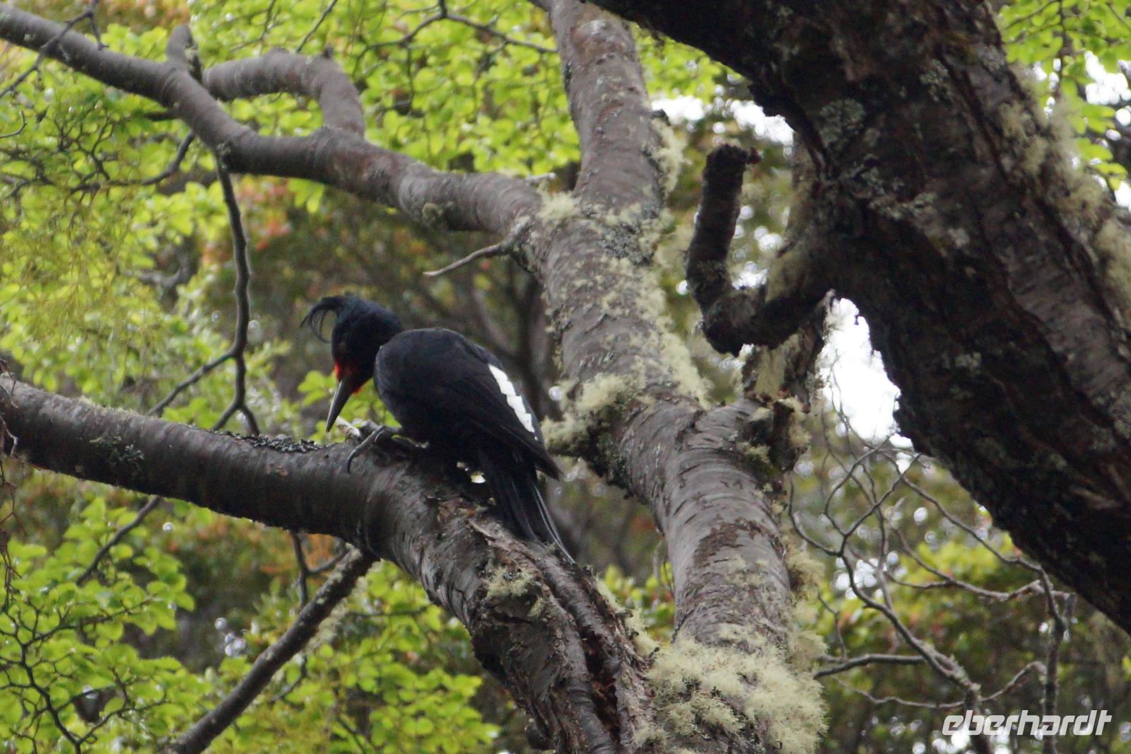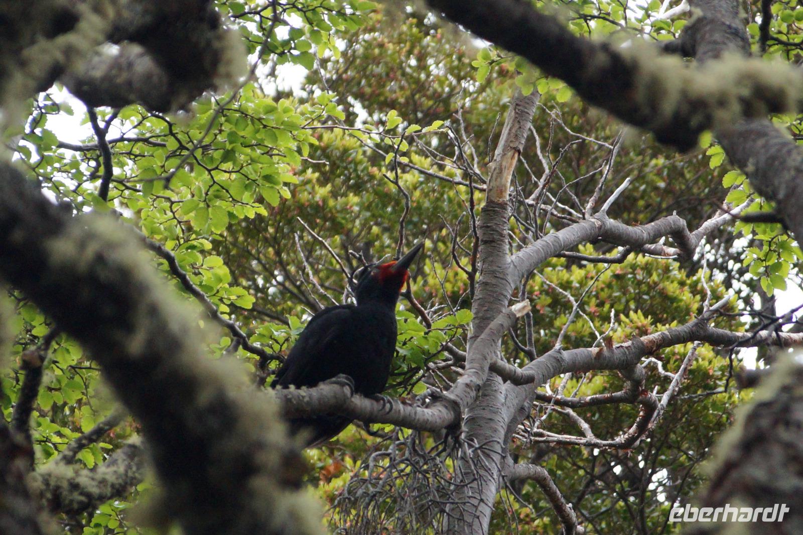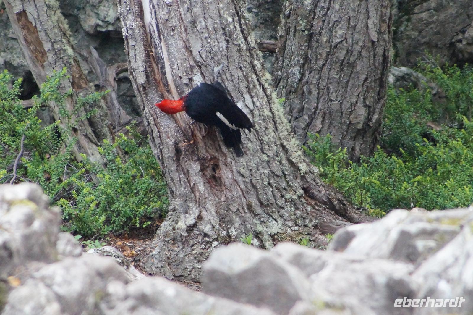 Vom Postamt am Ende der Bahnlinie aus starteten wir unsere Wanderung in Richtung der Lapataia-Bucht, einer Seitenbucht des Beagle Canals. Hier begegneten wir wieder unserem Specht, den wir schon auf unserer zweiten Wanderung gesehen hatten, ich persönlich habe zwei Männchen und ein Weibchen gesehen, Eli meinte, es handele sich um zwei Pärchen, die Männchen mit ihren scharlachroten Köpfen und die Weibchen mit ihren schwarzen Köpfen.