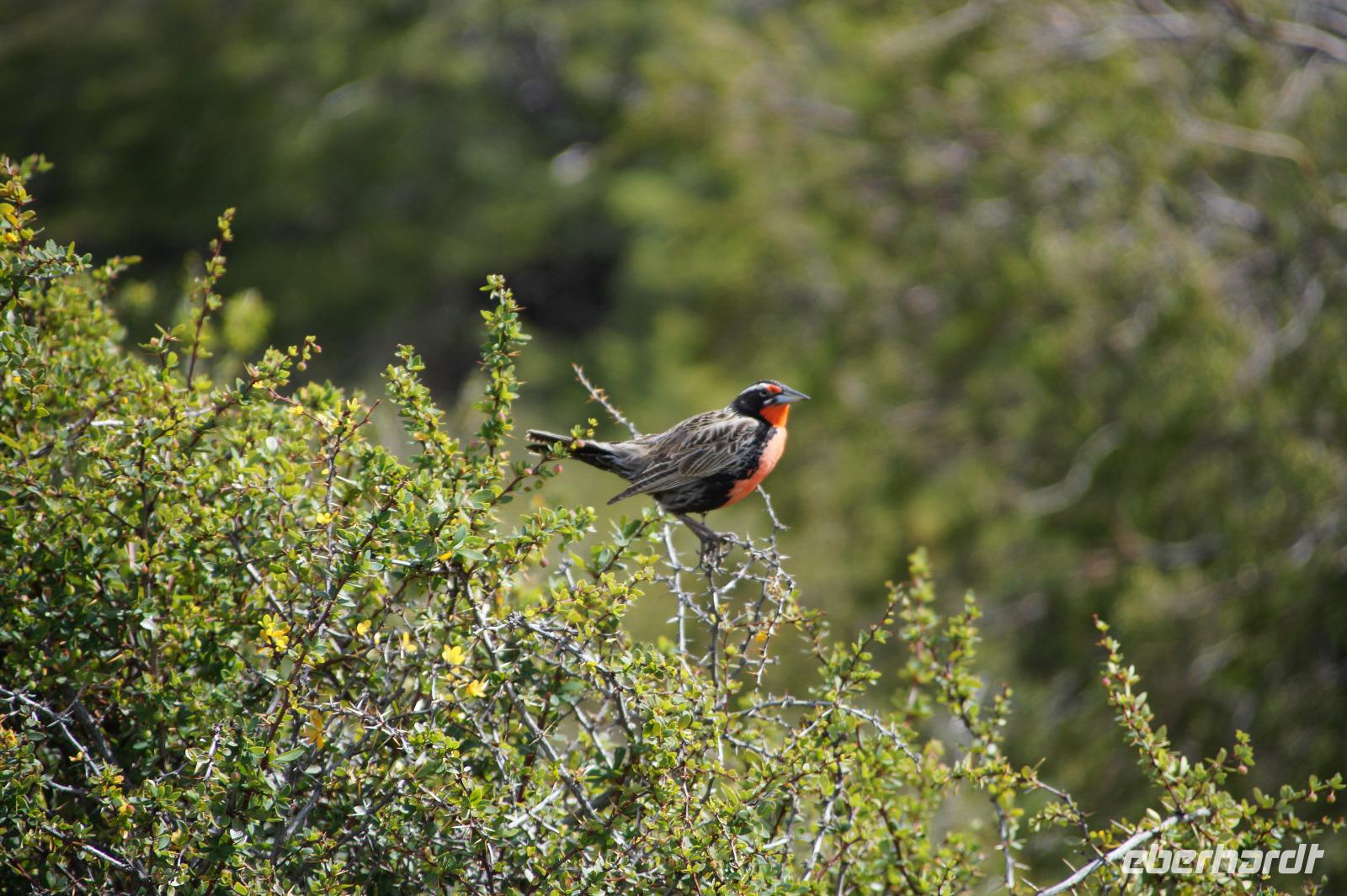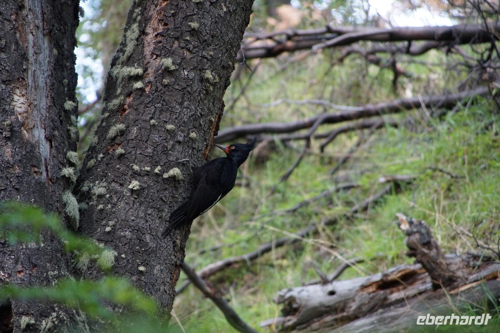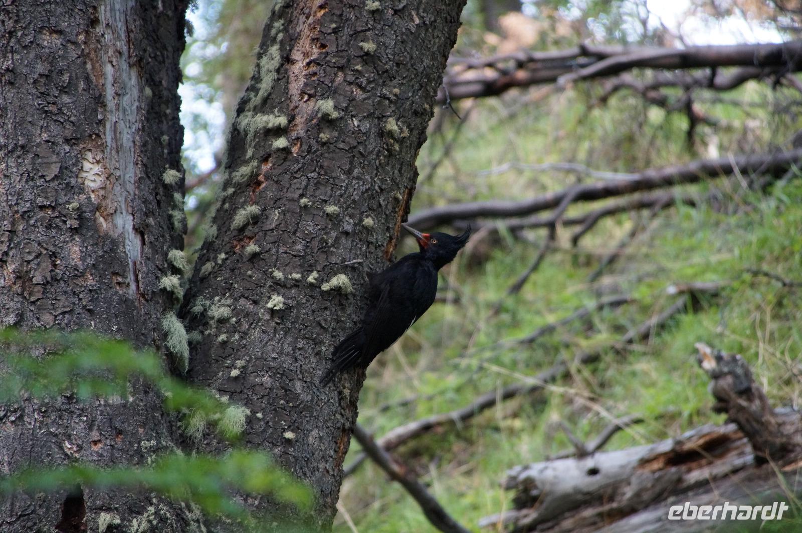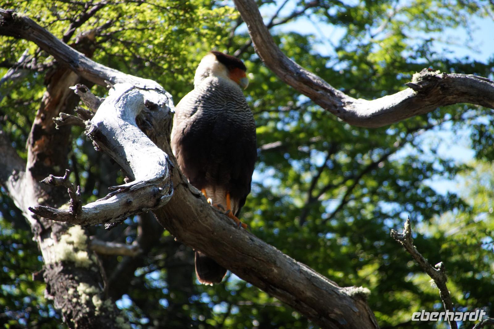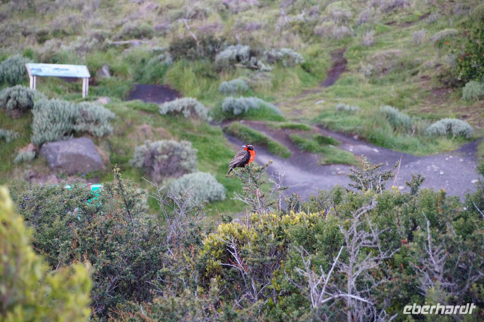 Vom Postamt am Ende der Bahnlinie aus starteten wir unsere Wanderung in Richtung der Lapataia-Bucht, einer Seitenbucht des Beagle Canals. Hier begegneten wir wieder unserem Specht, den wir schon auf unserer zweiten Wanderung gesehen hatten, ich persönlich habe zwei Männchen und ein Weibchen gesehen, Eli meinte, es handele sich um zwei Pärchen, die Männchen mit ihren scharlachroten Köpfen und die Weibchen mit ihren schwarzen Köpfen.