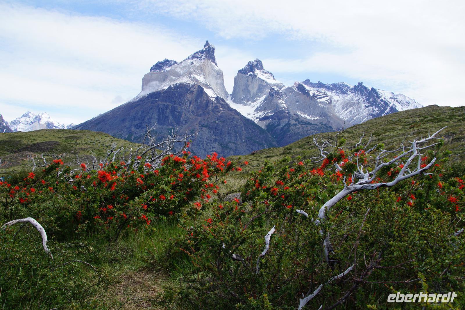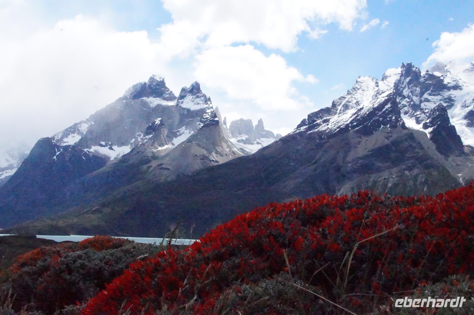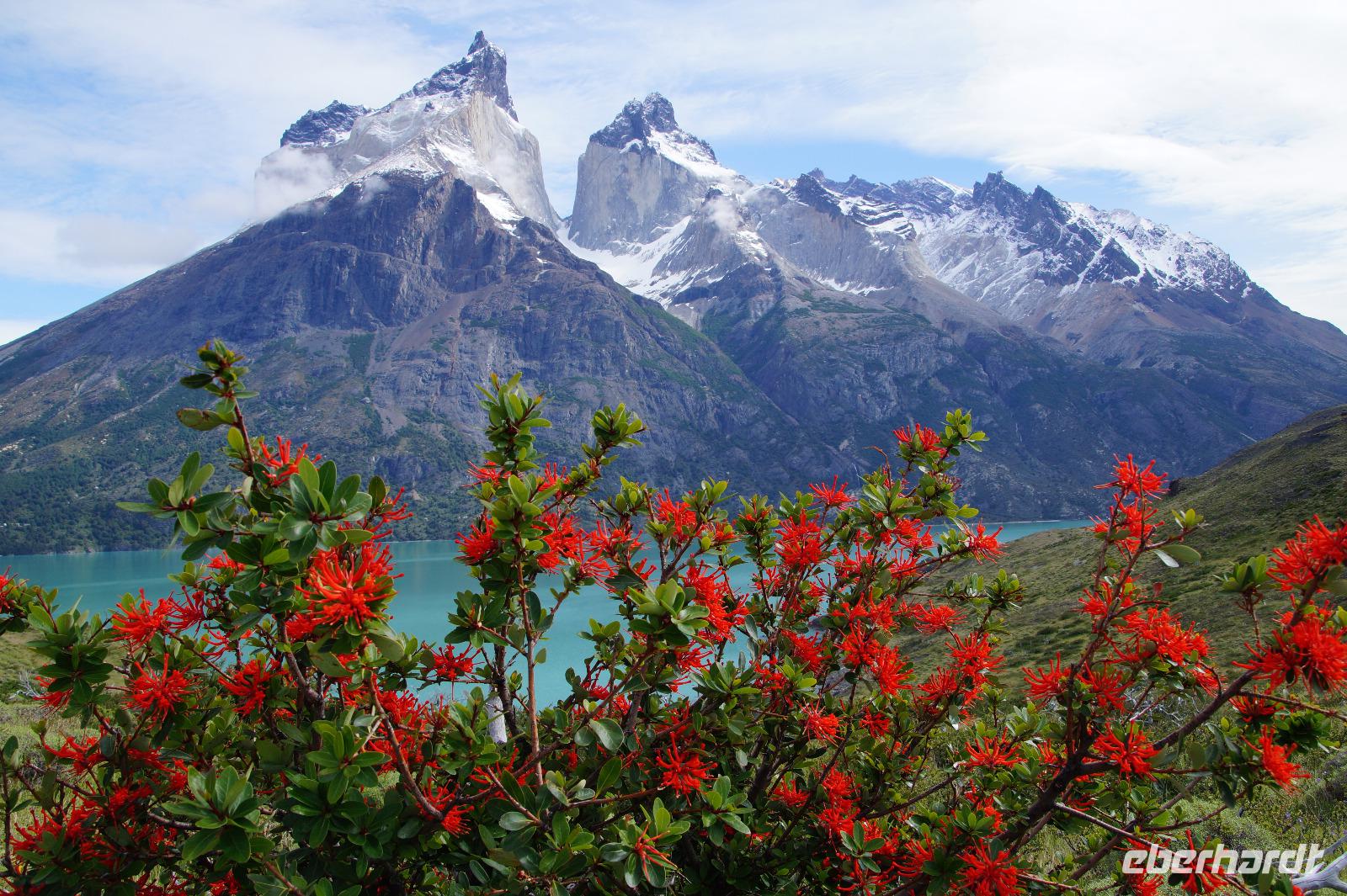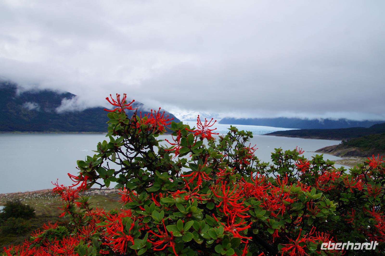 Endpunkt der Wanderung war ein Aussichtspunkt, wo rotblühender Notro (chilenischer Feuerbusch), grün-graue-Steppe, türkise Gletscherlagune und die verschiedenen Farben der Schnee-bedeckten Berge im Sonnenlicht interessante farbliche Kontraste boten.