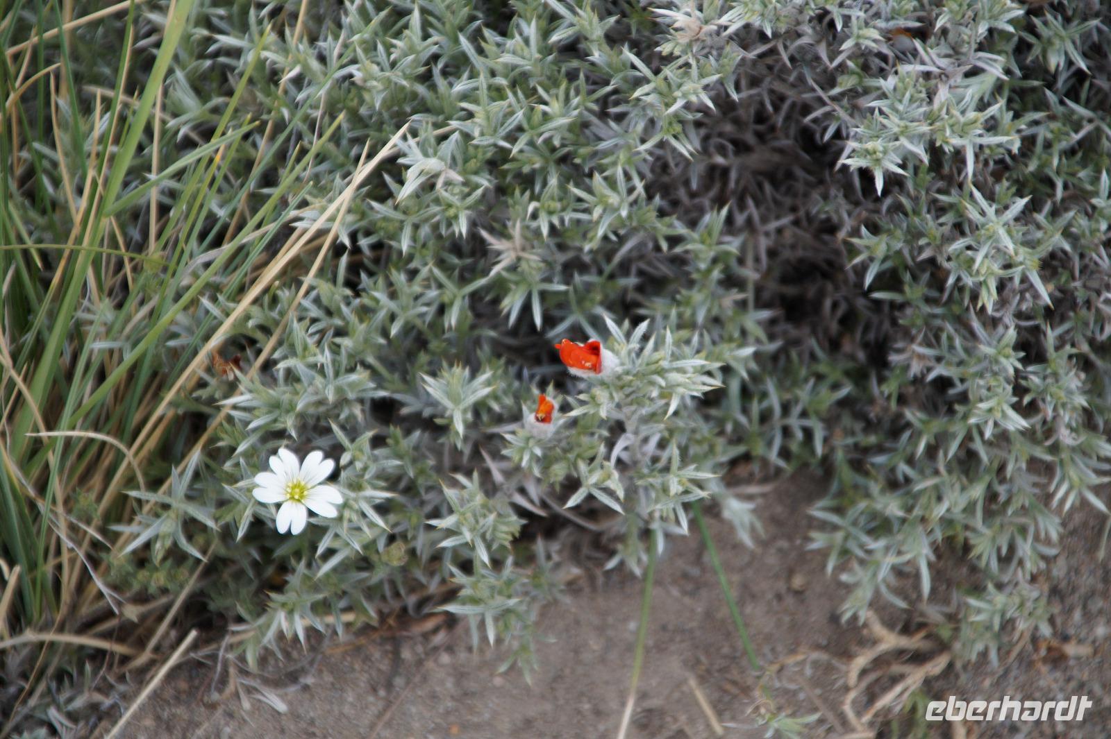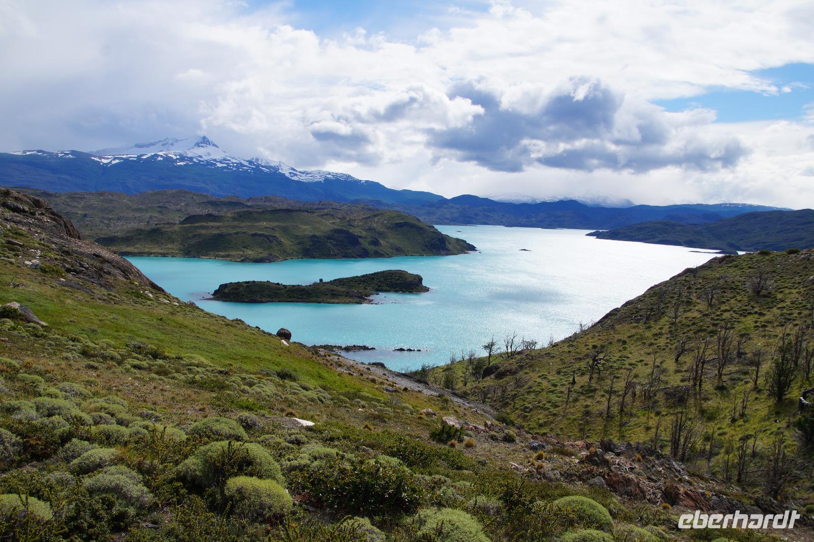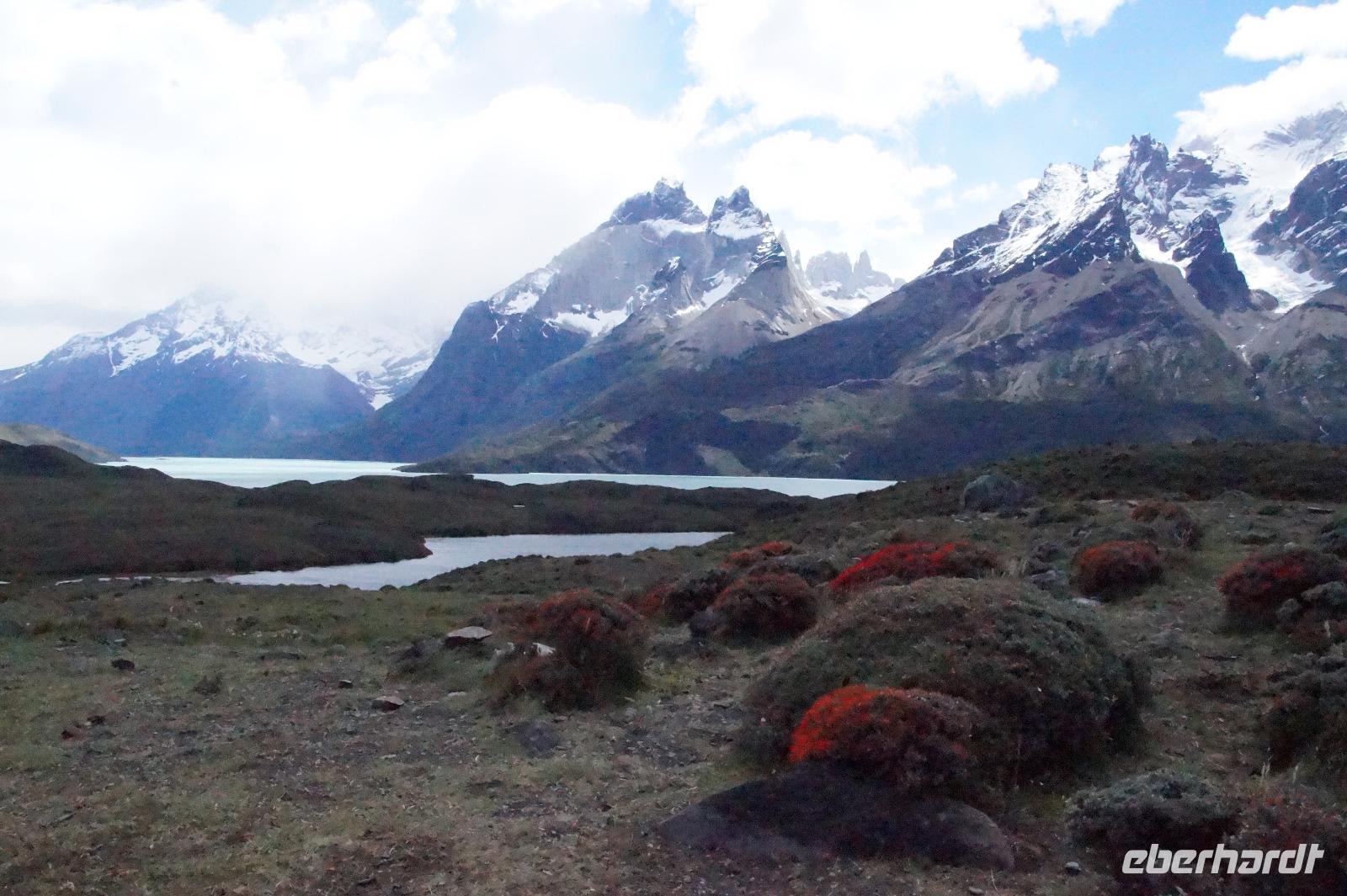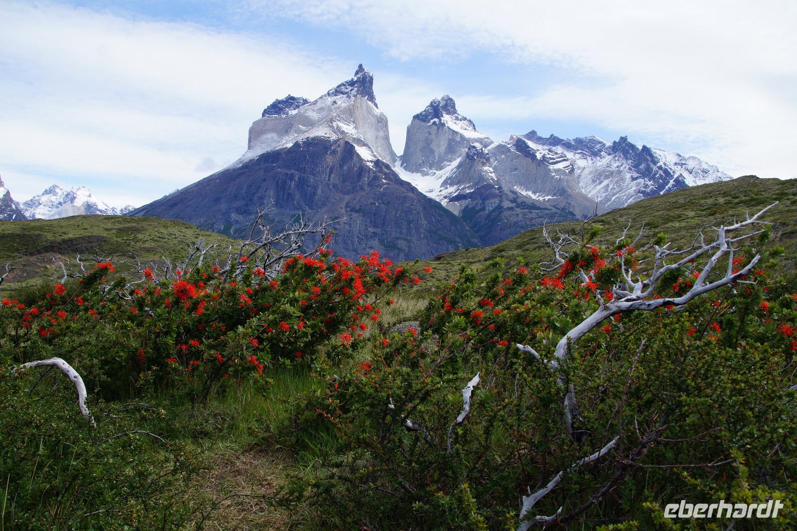 Endpunkt der Wanderung war ein Aussichtspunkt, wo rotblühender Notro (chilenischer Feuerbusch), grün-graue-Steppe, türkise Gletscherlagune und die verschiedenen Farben der Schnee-bedeckten Berge im Sonnenlicht interessante farbliche Kontraste boten.