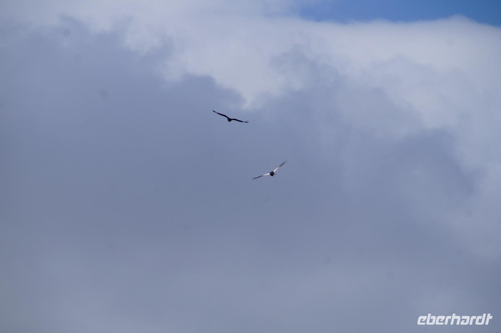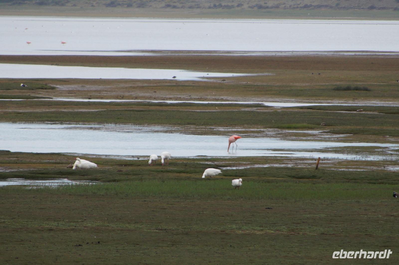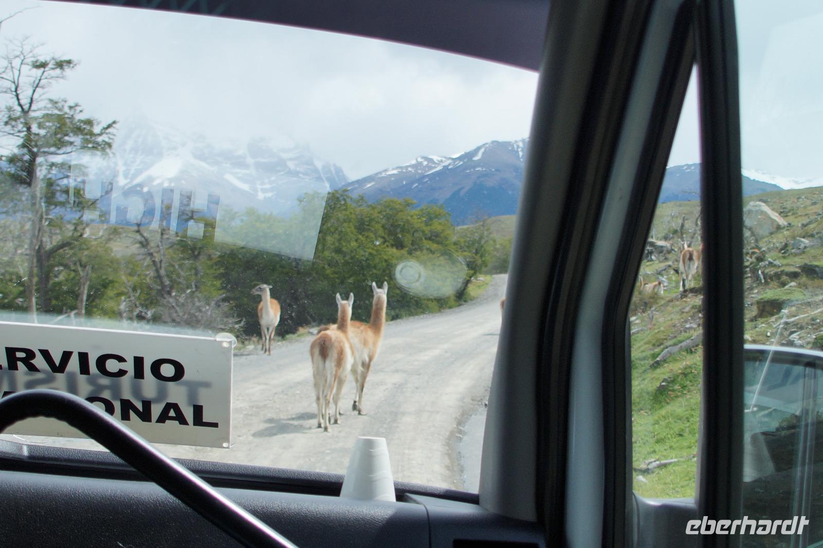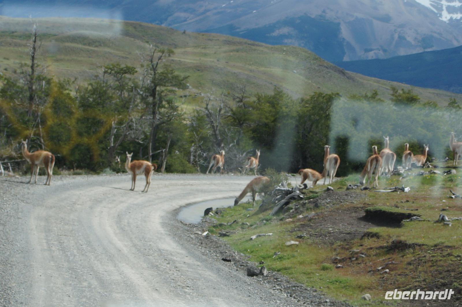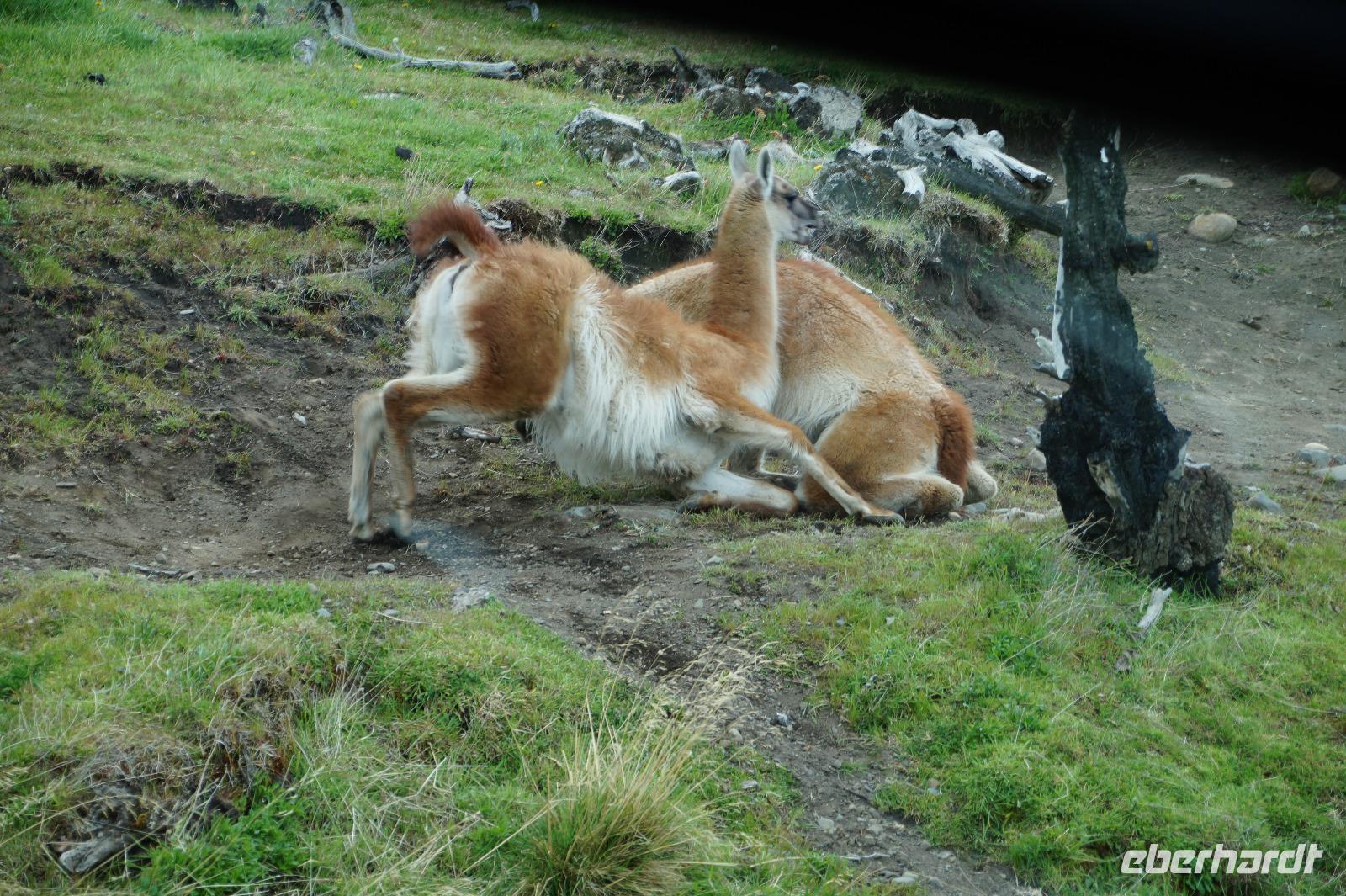 Mit Luis fuhren wir in Richtung der Laguna Azul, wobei teils großen Guanaco-Ansammlungen begegneten, es wurde sogar - ich selbst habe es nicht gesehen - im Vorbeifahren die Geburt eines kleinen Guanacos beobachtet. Wir hielten deswegen aber nicht an, denn Guanacos können als Fluchttiere in diesem Fall, die Geburt abbrechen und das Jungtier wieder in den Bauch zurückziehen. So jedenfalls erklärte es Pancho. Was wir aber einige Minuten beobachteten, war ein weiterer Kampf zwischen zwei Hengsten, die direkt neben der Straße ihre absonderlichen Versuche, sich gegenseitig in die Testikeln zu beißen, übten.