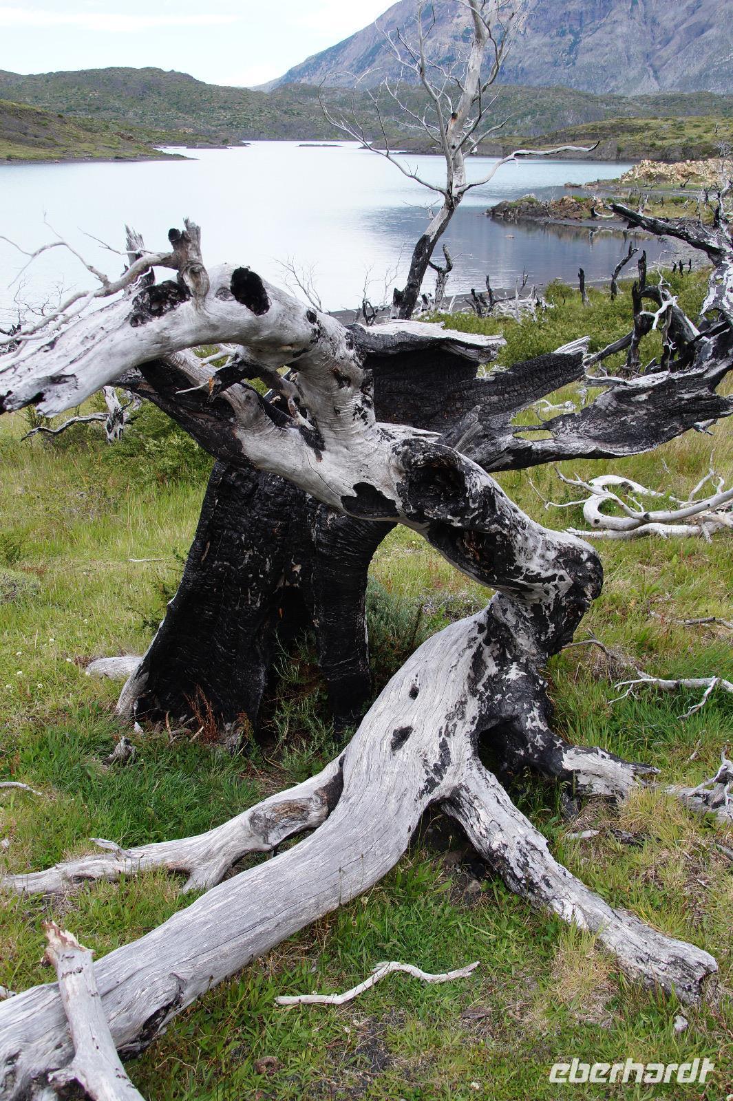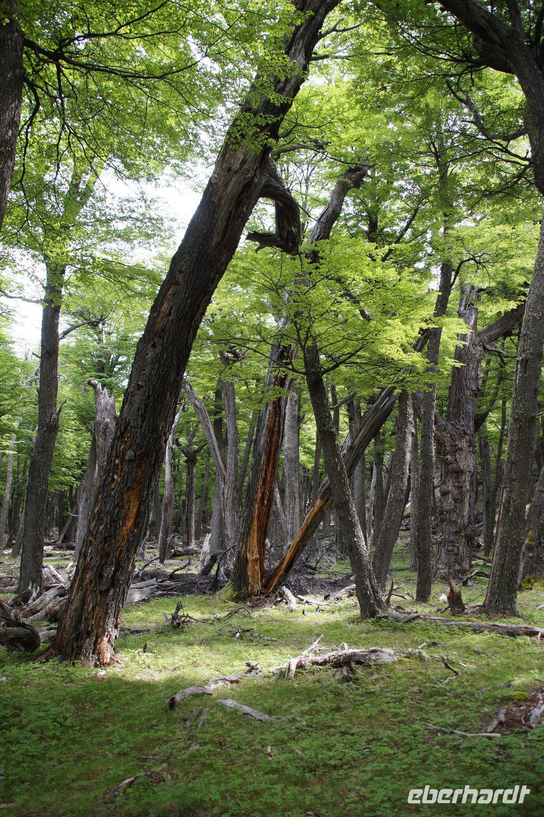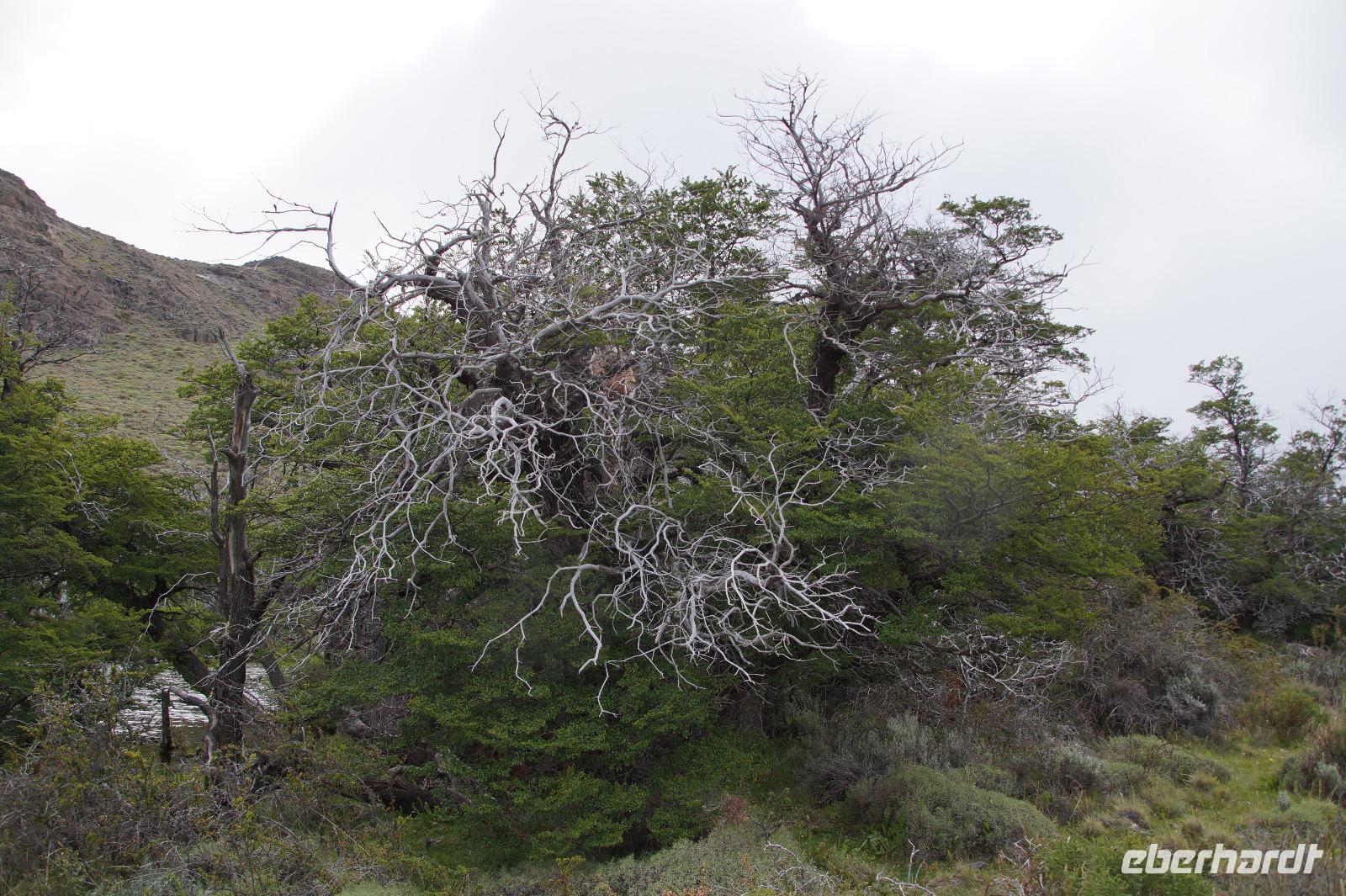An einer Stelle sehen wir ein feuchtes Feld voller Baumgerippe, den Unterschied zwischen Ñirre und Lenga kennen wir zu diesem Zeitpunkt noch nicht. Wir denken an europäische Überflutungsgebiete mit ihren Baumgerippen, aber Pedro erklärt uns, dass das die Überreste eines Waldbrandes seien. Ich meine, ein kleiner Waldbrand sei doch nicht so schlimm und führe den Yellowstone Nationalpark an mit seinen schlimmen Verwüstungen vor 30 Jahren - kaum ein Jahr nach dem großen Brand grünten und blühten Blumen im Park, deren Existenz man dort gar nicht vermutete hatte, sie waren durch den Wald behindert worden. Dies sei hier aber nicht der Fall, widerspricht mir Pedro, die Wälder hier seien nicht an Feuer angepasst, er erklärt warum: Hier gibt es keine Gewitter und keinen Blitzschlag, Bäume fallen aufgrund des Windes um, Feuer sind in Südpatagonien nicht natürlich, sondern immer menschengemacht. Aus manchen der Ñirrewurzeln, die den Waldbrand überlebt haben, treiben zwar wieder Äste und Zweige aus, aber das seien eben, so Pedro, keine jungen, kräftigen Bäume, sondern Abklatsche der Altbäume mit deren alten DNA, die Gegend verbuscht und junges Gehölz hat wenig Chancen.