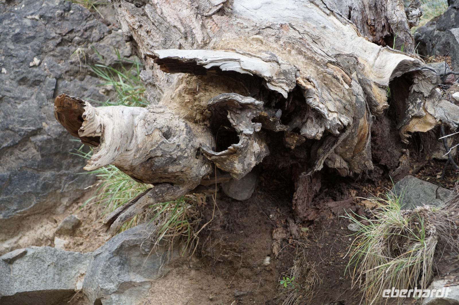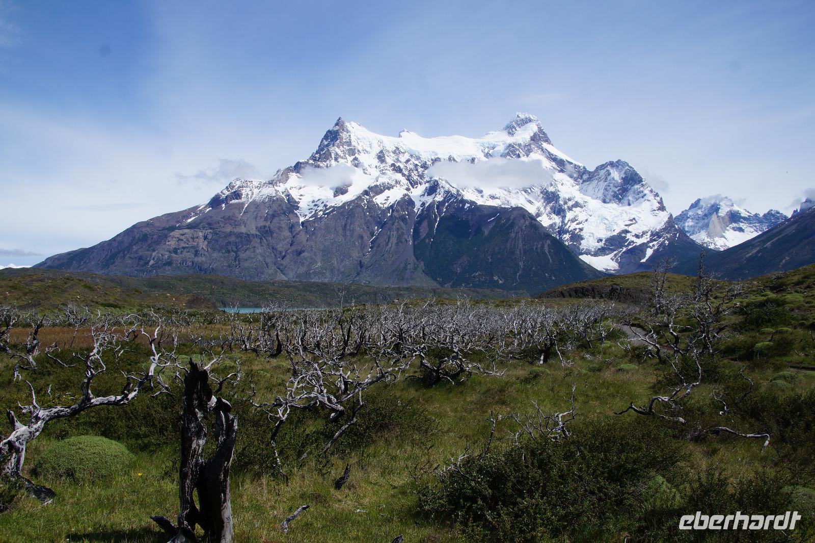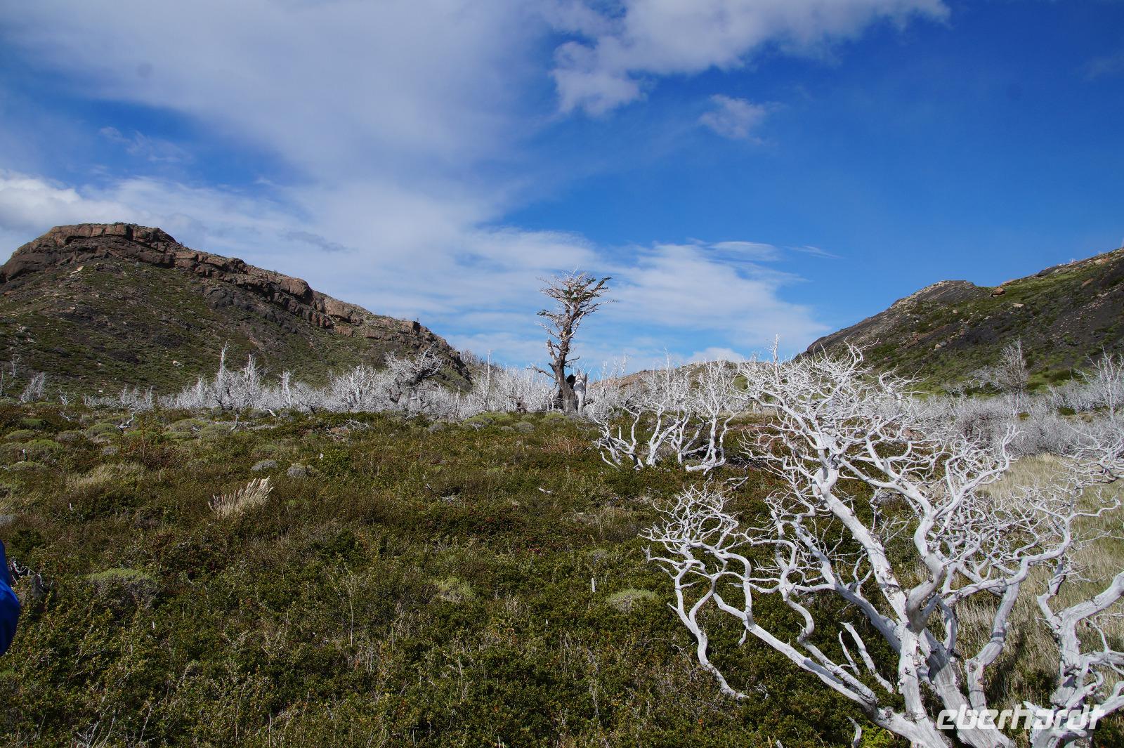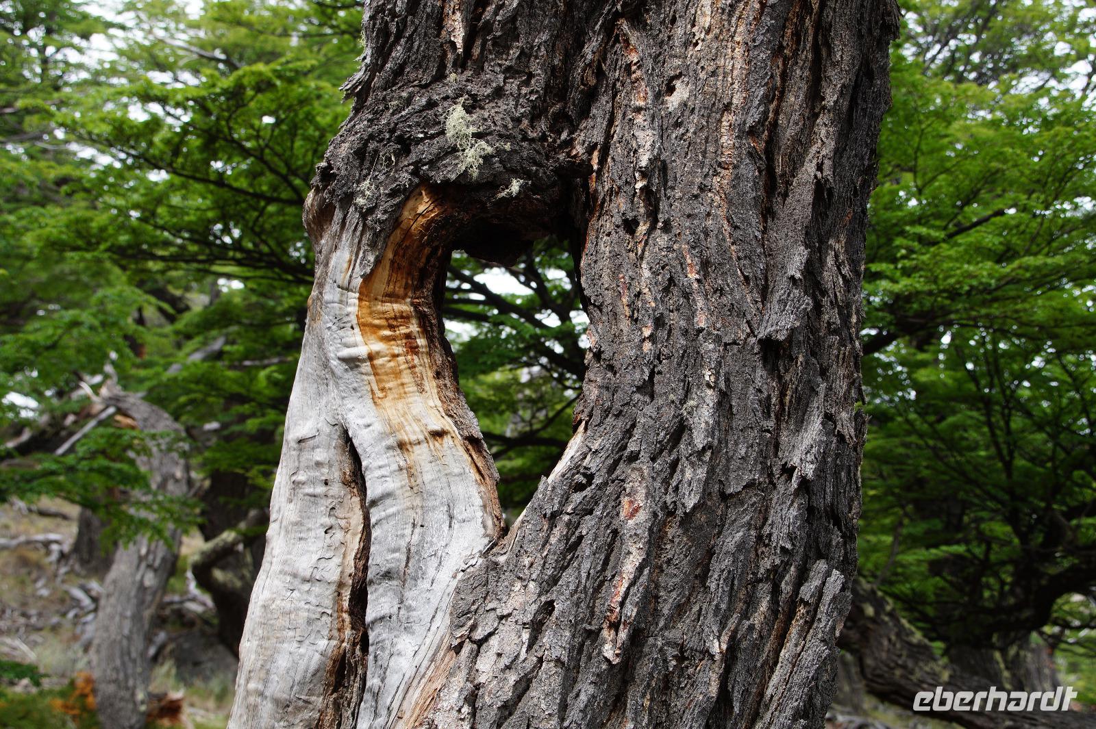 An einer Stelle sehen wir ein feuchtes Feld voller Baumgerippe, den Unterschied zwischen Ñirre und Lenga kennen wir zu diesem Zeitpunkt noch nicht. Wir denken an europäische Überflutungsgebiete mit ihren Baumgerippen, aber Pedro erklärt uns, dass das die Überreste eines Waldbrandes seien. Ich meine, ein kleiner Waldbrand sei doch nicht so schlimm und führe den Yellowstone Nationalpark an mit seinen schlimmen Verwüstungen vor 30 Jahren - kaum ein Jahr nach dem großen Brand grünten und blühten Blumen im Park, deren Existenz man dort gar nicht vermutete hatte, sie waren durch den Wald behindert worden. Dies sei hier aber nicht der Fall, widerspricht mir Pedro, die Wälder hier seien nicht an Feuer angepasst, er erklärt warum: Hier gibt es keine Gewitter und keinen Blitzschlag, Bäume fallen aufgrund des Windes um, Feuer sind in Südpatagonien nicht natürlich, sondern immer menschengemacht. Aus manchen der Ñirrewurzeln, die den Waldbrand überlebt haben, treiben zwar wieder Äste und Zweige aus, aber das seien eben, so Pedro, keine jungen, kräftigen Bäume, sondern Abklatsche der Altbäume mit deren alten DNA, die Gegend verbuscht und junges Gehölz hat wenig Chancen.