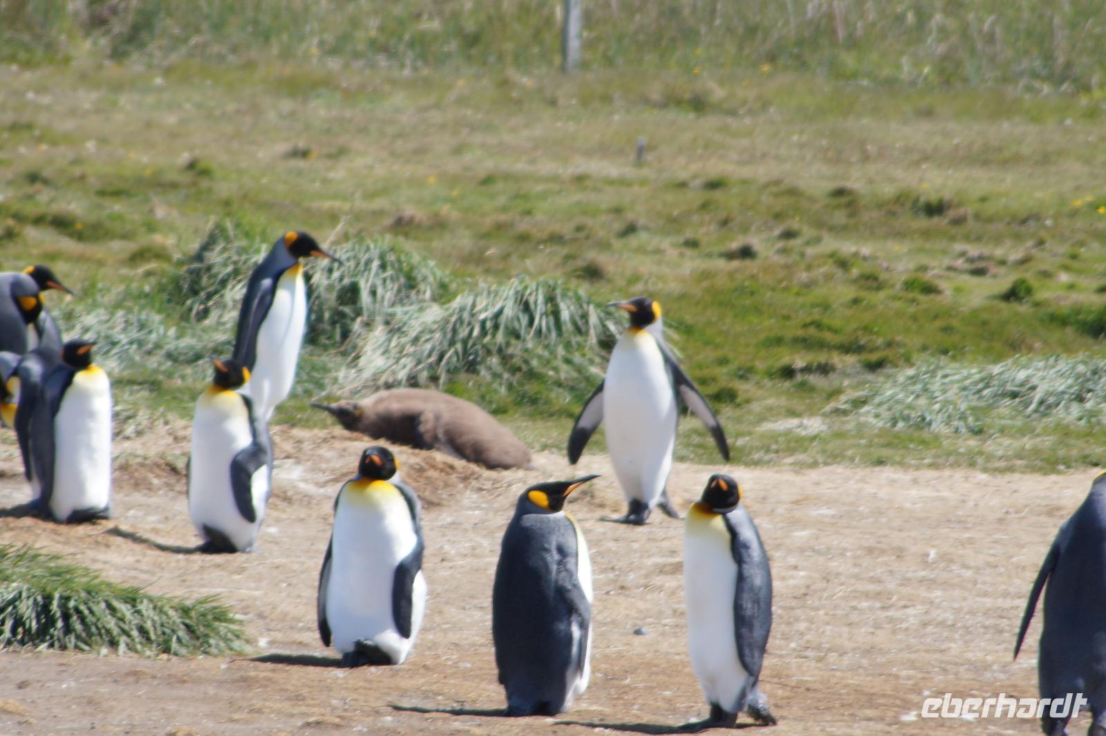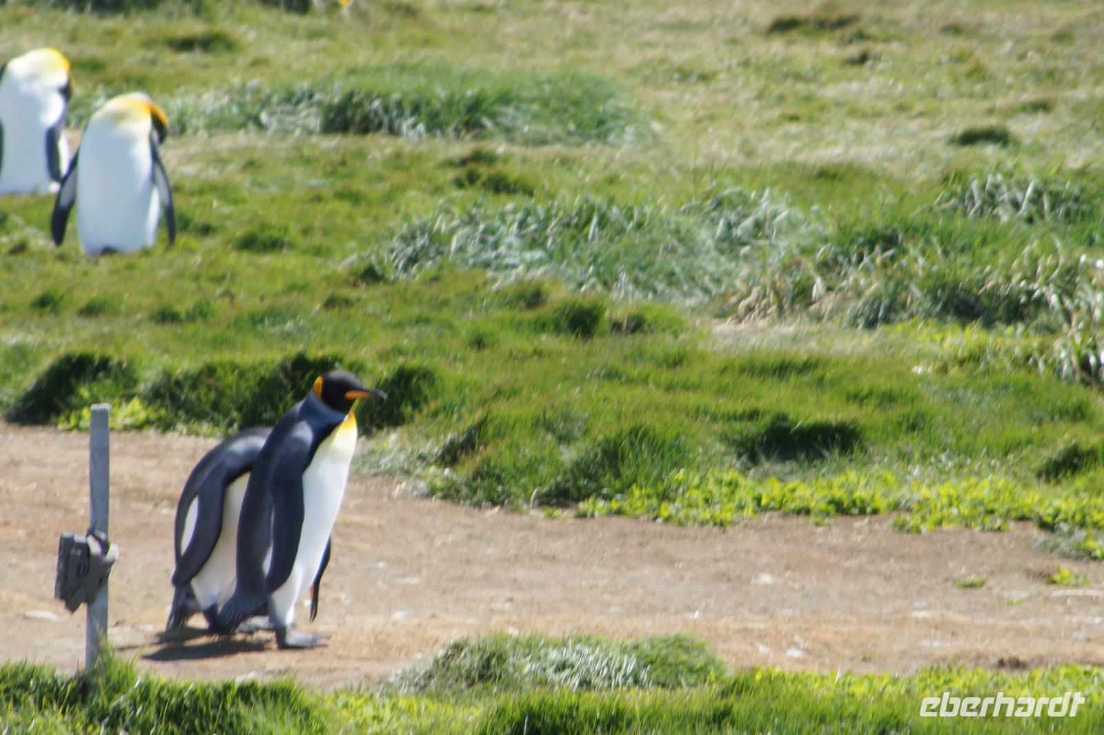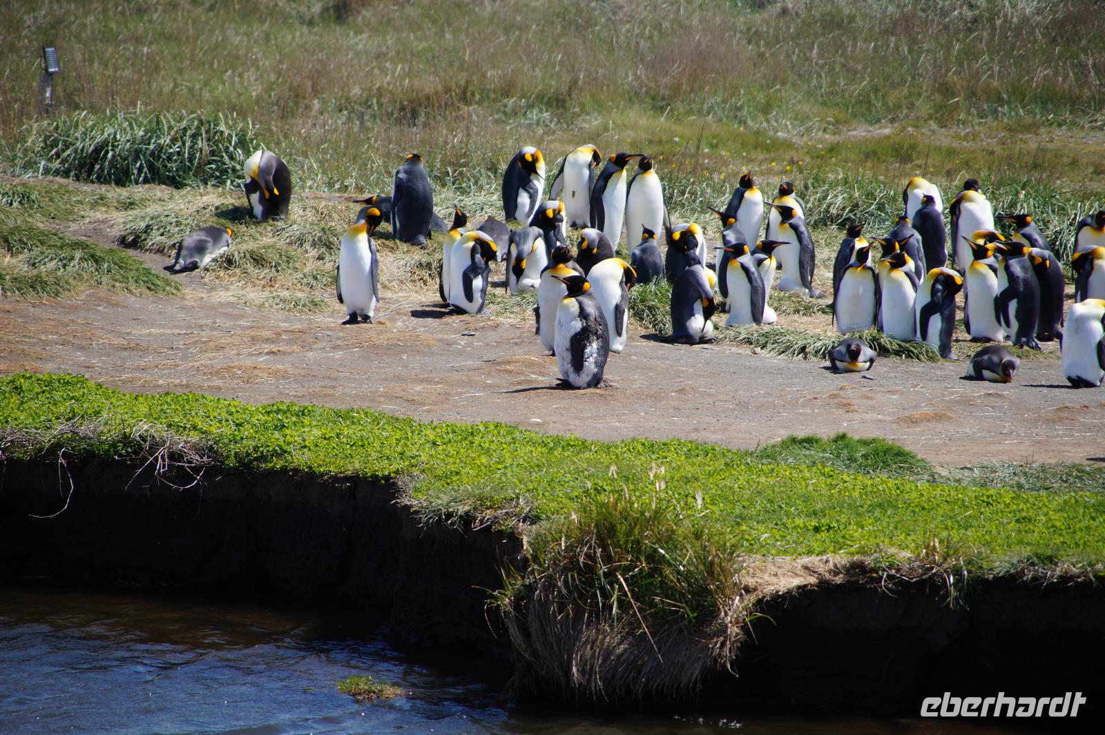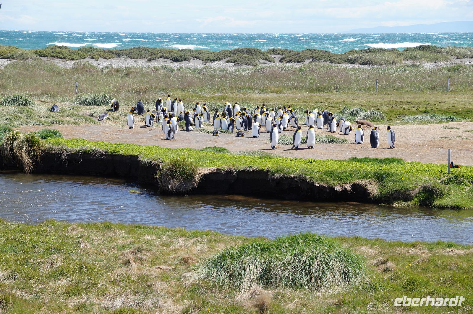 Anders, als auf Magdalena, wo die Pinguine unsere Weg kreuzten bzw. wenn sie unseren Weg kreuzten, sie Vorfahrt hatten (auch von links), ist der Abstand in der Königspinguinkolonie wesentlich strenger. Hier gibt es Unterstände, von denen aus man die Vögel besichtigen kann, denn das Ziel der Behörden hier, ist es den Pinguinen eine stressfreie Aufzucht ihrer Küken zu gewährleisten. Gleichzeitig braucht man natürlich Touristen, denn diese finanzieren die Instandhaltung und den Schutz der Kolonie. Der genannte Bach liegt noch zwischen Unterständen und Kolonie.
