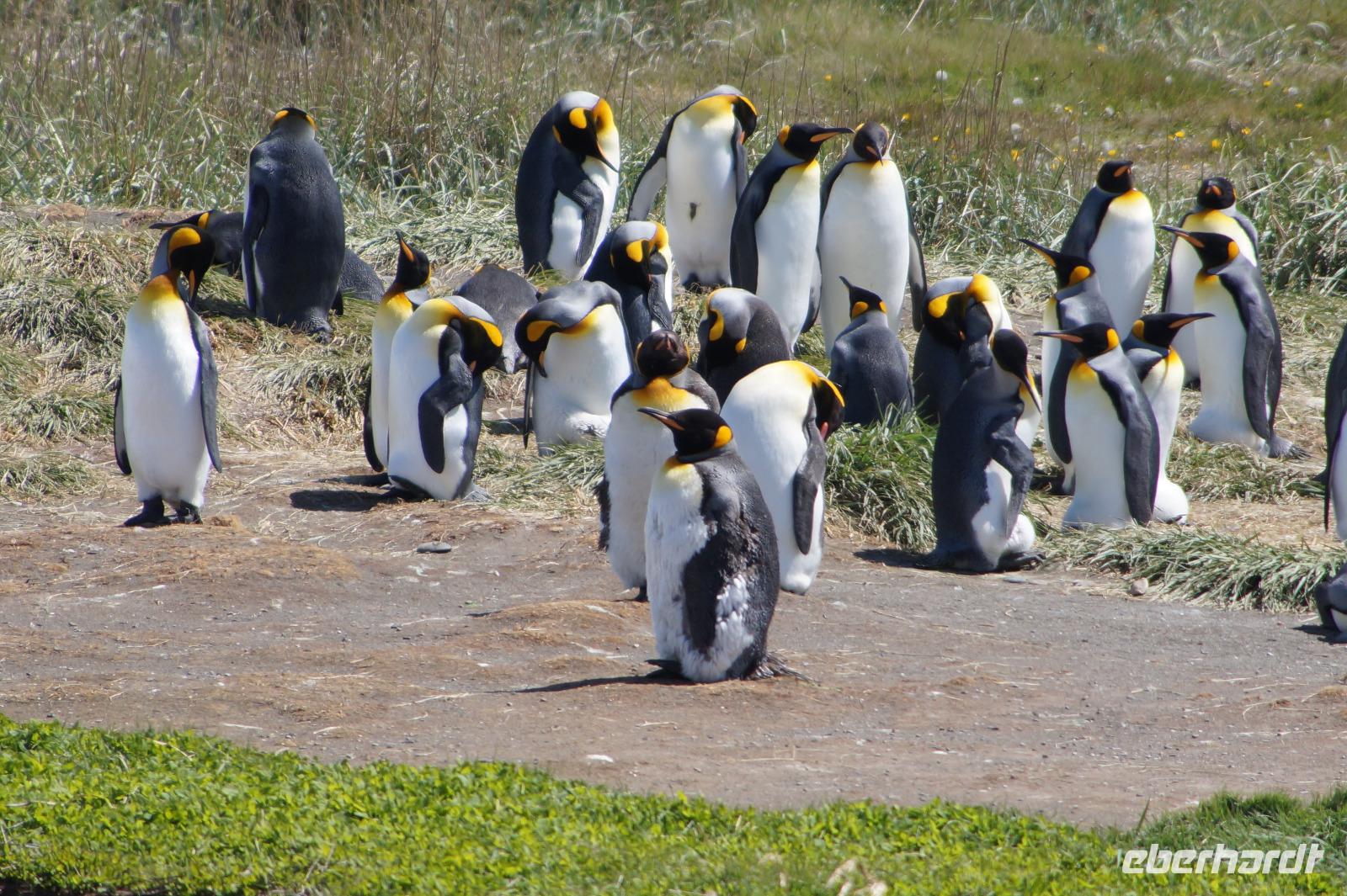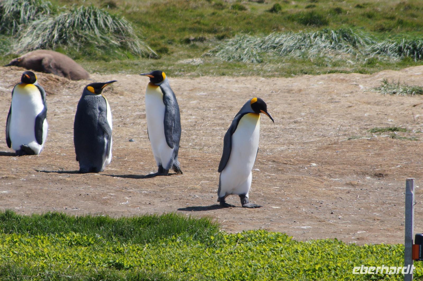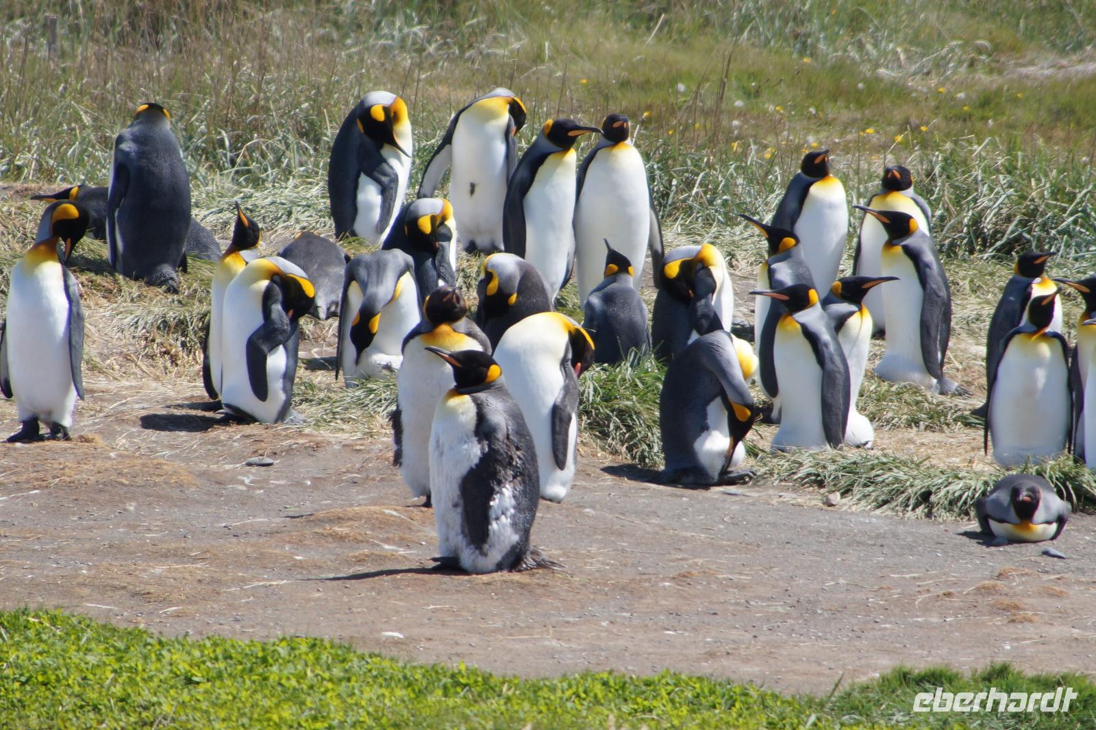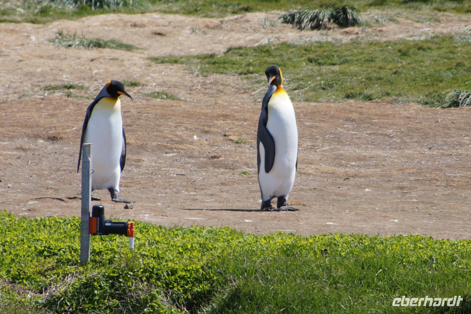Anders, als auf Magdalena, wo die Pinguine unsere Weg kreuzten bzw. wenn sie unseren Weg kreuzten, sie Vorfahrt hatten (auch von links), ist der Abstand in der Königspinguinkolonie wesentlich strenger. Hier gibt es Unterstände, von denen aus man die Vögel besichtigen kann, denn das Ziel der Behörden hier, ist es den Pinguinen eine stressfreie Aufzucht ihrer Küken zu gewährleisten. Gleichzeitig braucht man natürlich Touristen, denn diese finanzieren die Instandhaltung und den Schutz der Kolonie. Der genannte Bach liegt noch zwischen Unterständen und Kolonie.