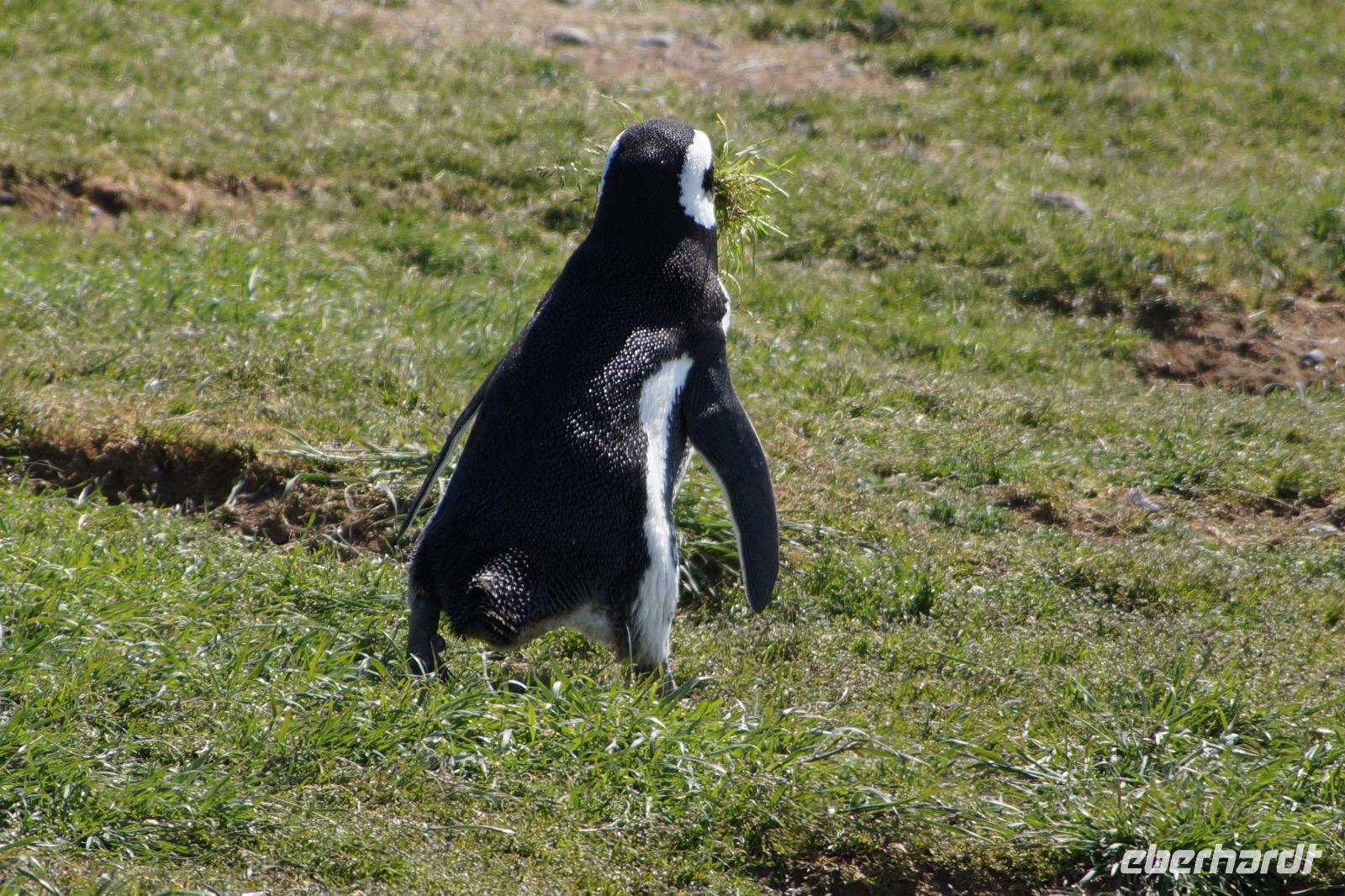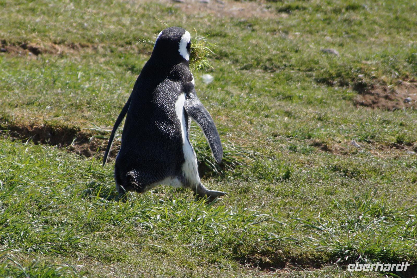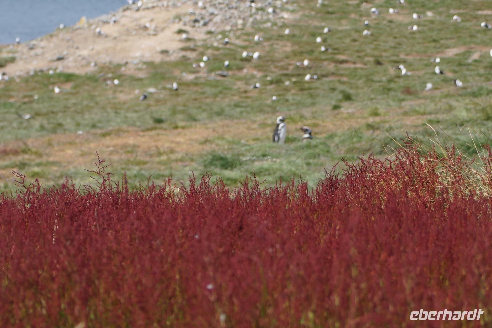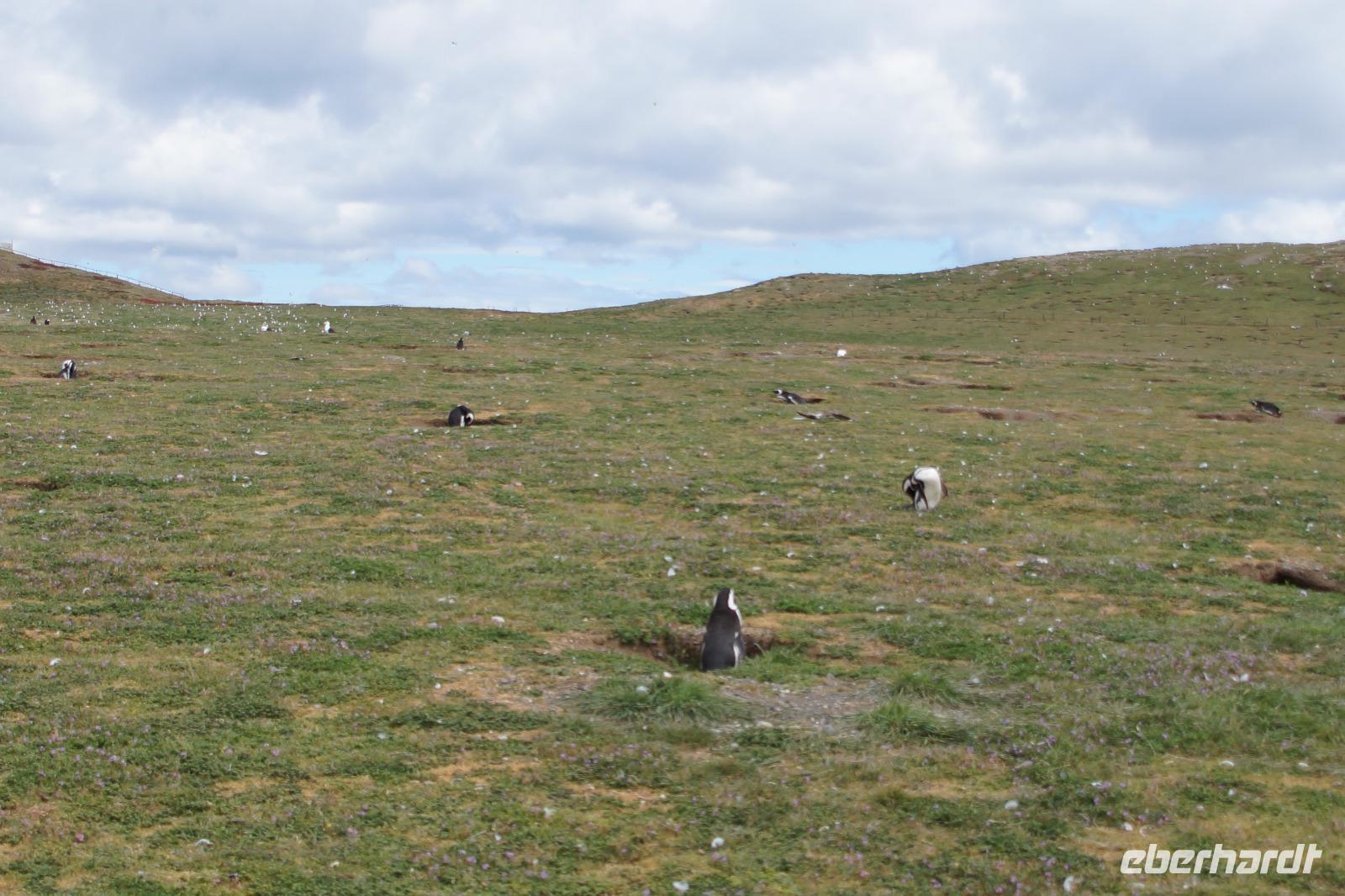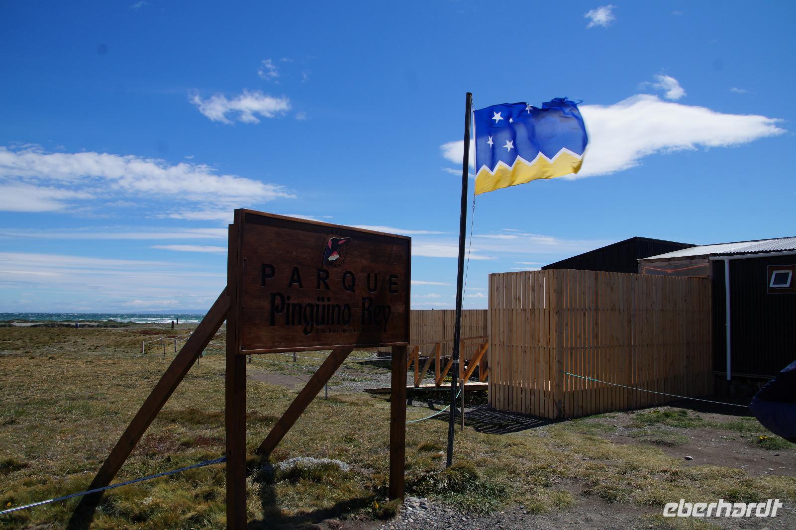 Anders, als auf Magdalena, wo die Pinguine unsere Weg kreuzten bzw. wenn sie unseren Weg kreuzten, sie Vorfahrt hatten (auch von links), ist der Abstand in der Königspinguinkolonie wesentlich strenger. Hier gibt es Unterstände, von denen aus man die Vögel besichtigen kann, denn das Ziel der Behörden hier, ist es den Pinguinen eine stressfreie Aufzucht ihrer Küken zu gewährleisten. Gleichzeitig braucht man natürlich Touristen, denn diese finanzieren die Instandhaltung und den Schutz der Kolonie. Der genannte Bach liegt noch zwischen Unterständen und Kolonie.