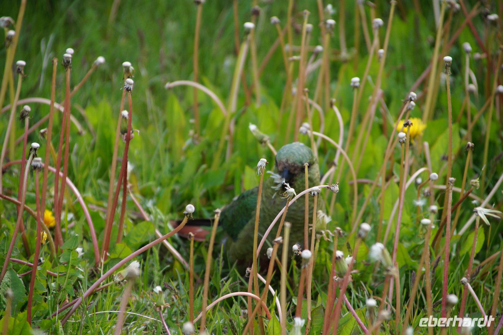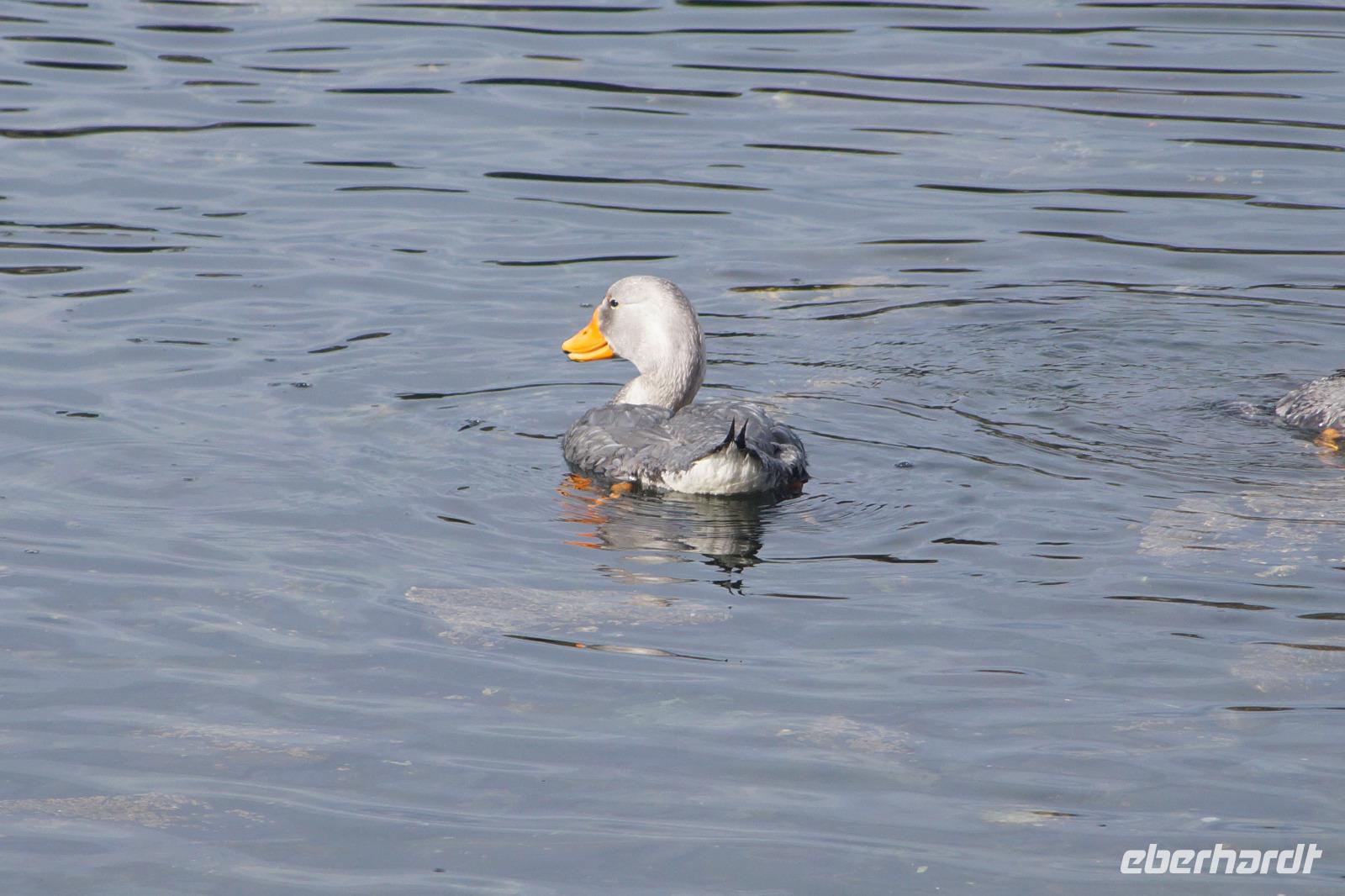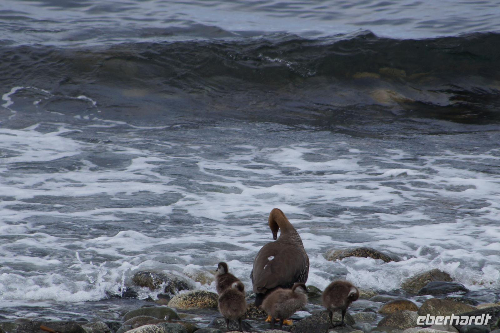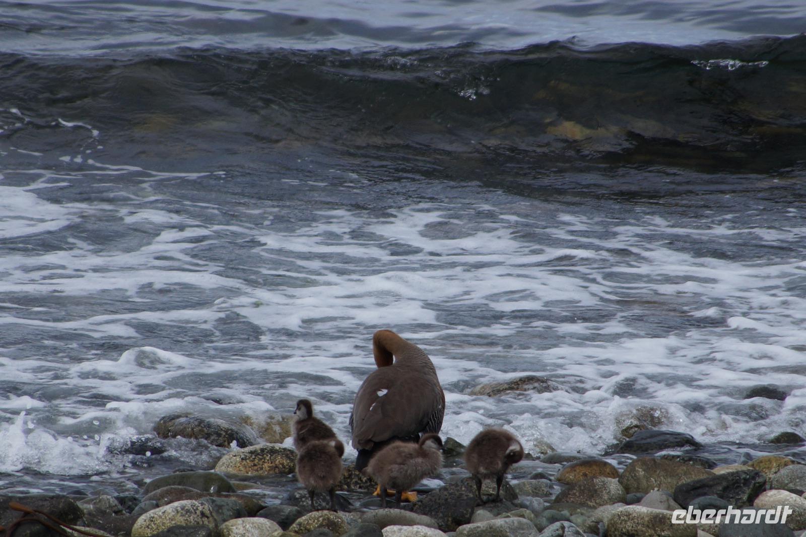 Anders, als auf Magdalena, wo die Pinguine unsere Weg kreuzten bzw. wenn sie unseren Weg kreuzten, sie Vorfahrt hatten (auch von links), ist der Abstand in der Königspinguinkolonie wesentlich strenger. Hier gibt es Unterstände, von denen aus man die Vögel besichtigen kann, denn das Ziel der Behörden hier, ist es den Pinguinen eine stressfreie Aufzucht ihrer Küken zu gewährleisten. Gleichzeitig braucht man natürlich Touristen, denn diese finanzieren die Instandhaltung und den Schutz der Kolonie. Der genannte Bach liegt noch zwischen Unterständen und Kolonie.