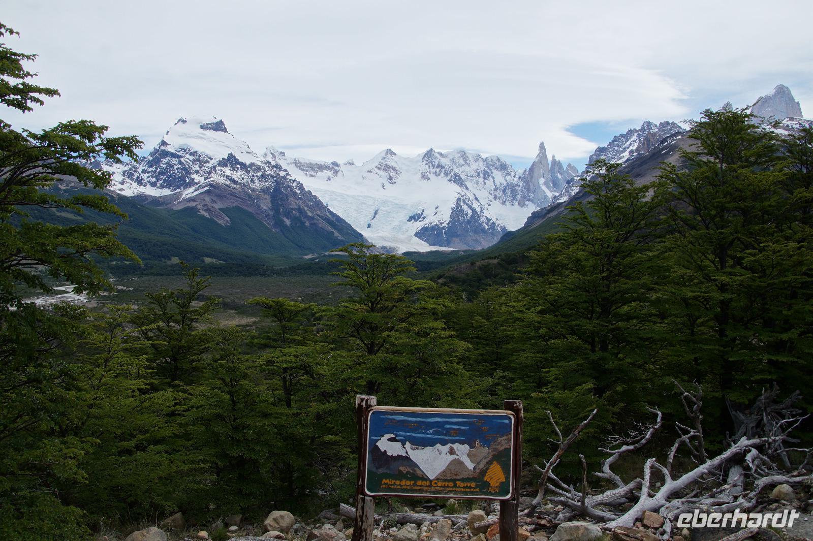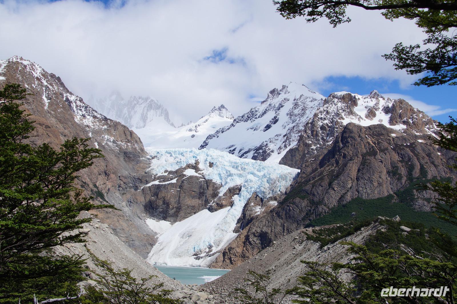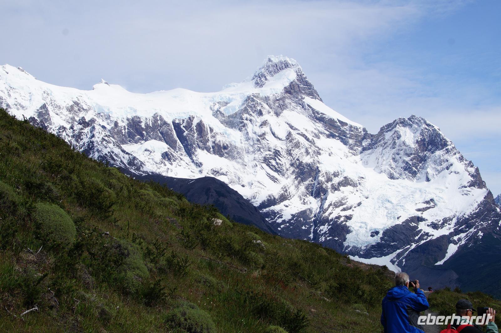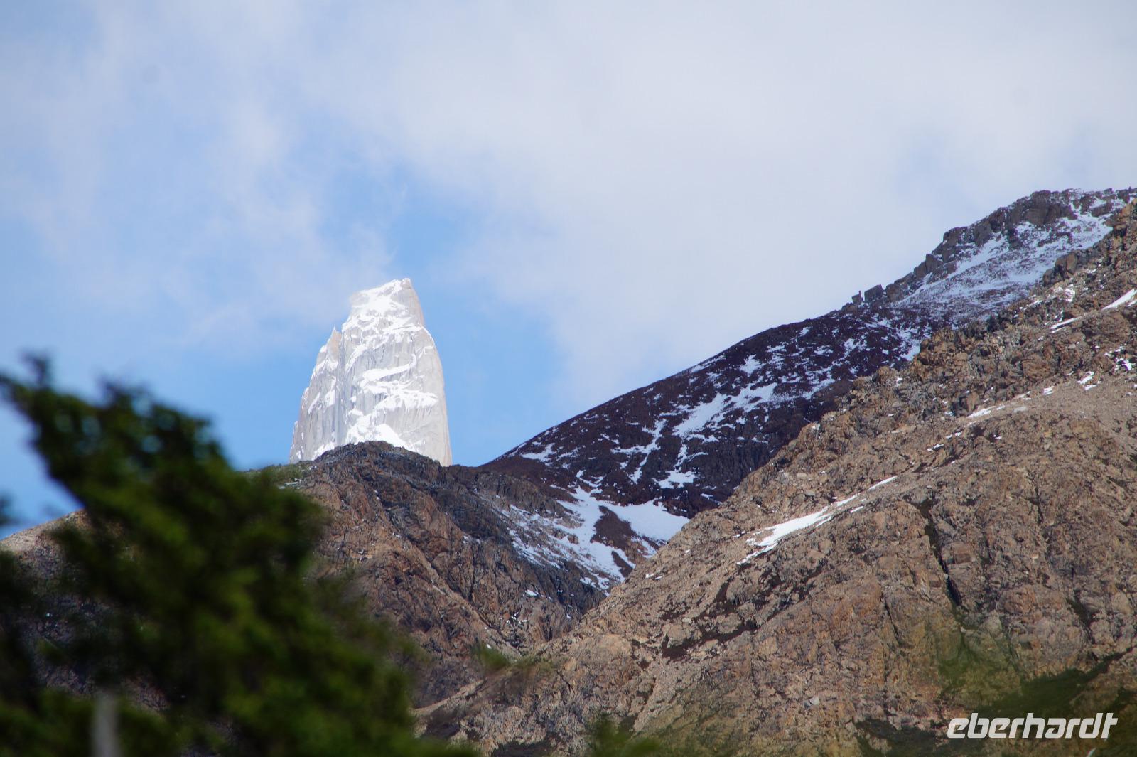 Zunächst stoppten wir auf 710 m NN am Mirador Torre (zur Erinnerung, das Dorf El Chaltén liegt auf 400 m), wo wir linkerhand auf einen Wasserfall blickten und geradeaus den Cerro Torre sehen konnten. Der hatte sich bisher unseren Blicken weitgehend entzogen, weil er eigentlich noch hinter dem Fitz Roy-Massiv liegt und er dadurch noch mehr durch kleinere Berge und auch Wolken und Nebel verdeckt wird.