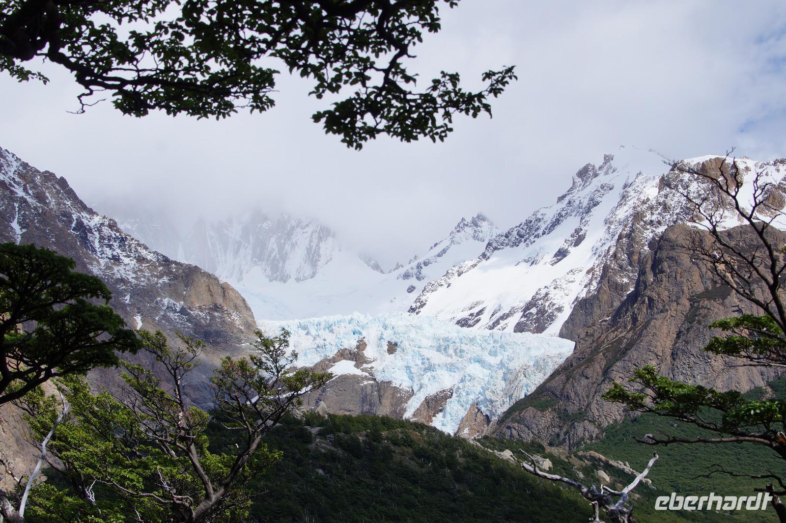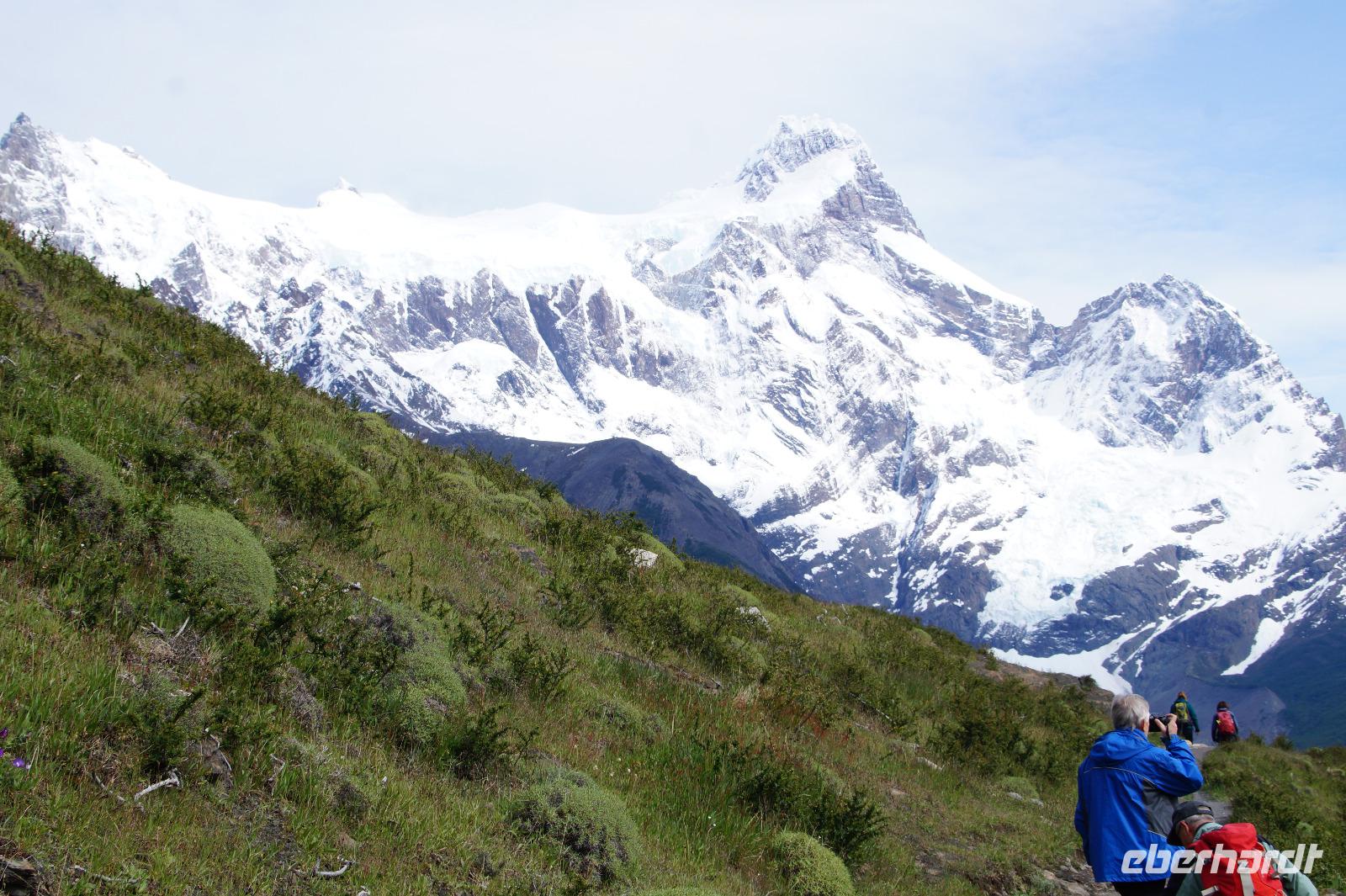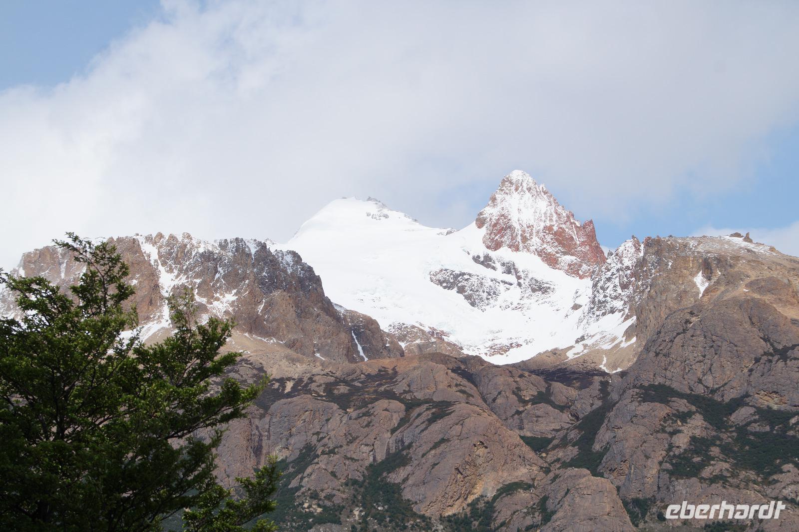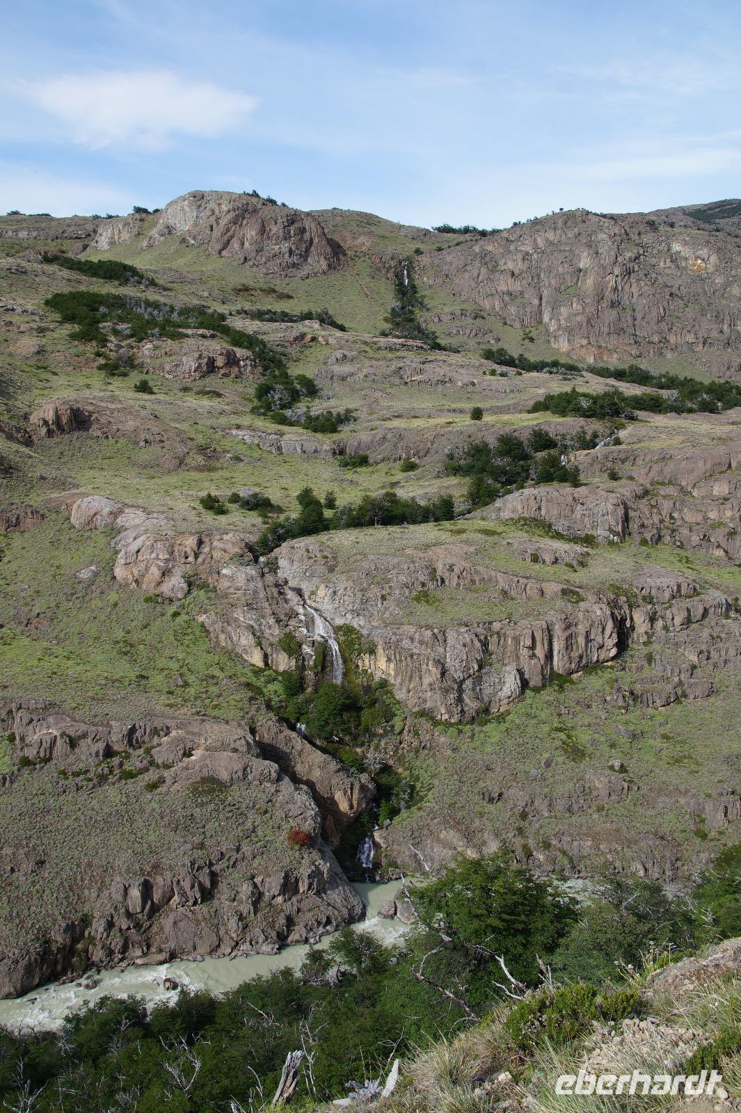 Zunächst stoppten wir auf 710 m NN am Mirador Torre (zur Erinnerung, das Dorf El Chaltén liegt auf 400 m), wo wir linkerhand auf einen Wasserfall blickten und geradeaus den Cerro Torre sehen konnten. Der hatte sich bisher unseren Blicken weitgehend entzogen, weil er eigentlich noch hinter dem Fitz Roy-Massiv liegt und er dadurch noch mehr durch kleinere Berge und auch Wolken und Nebel verdeckt wird.