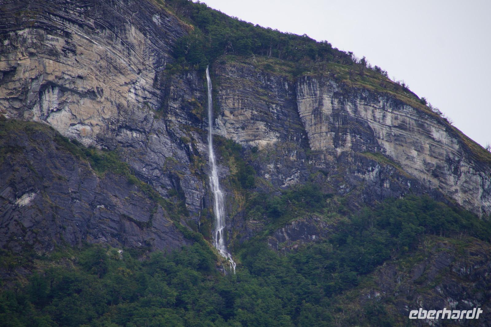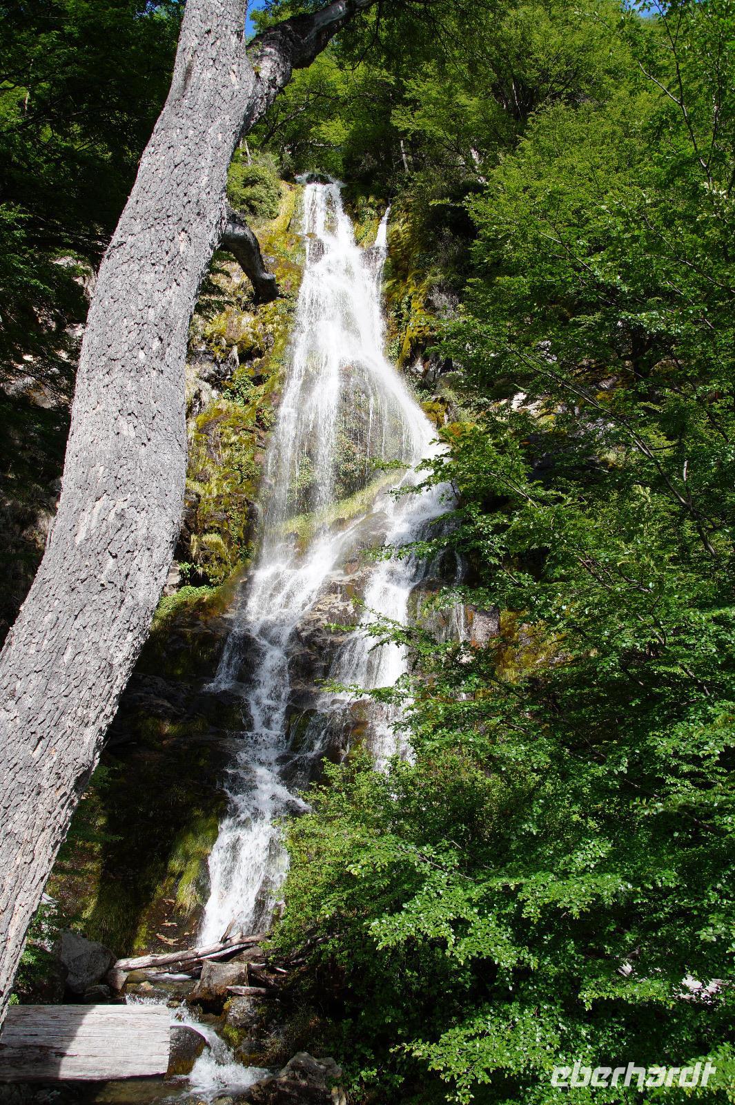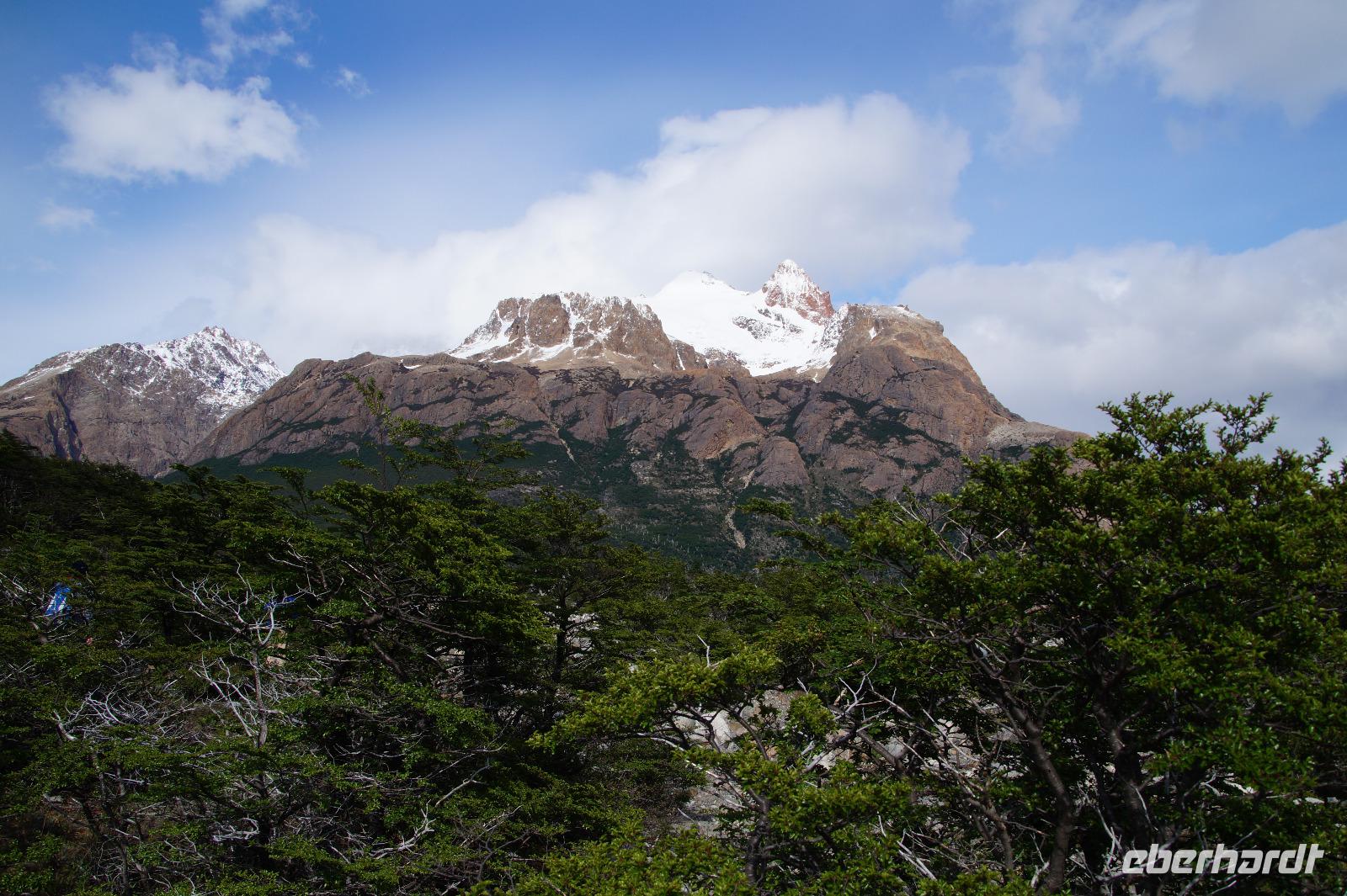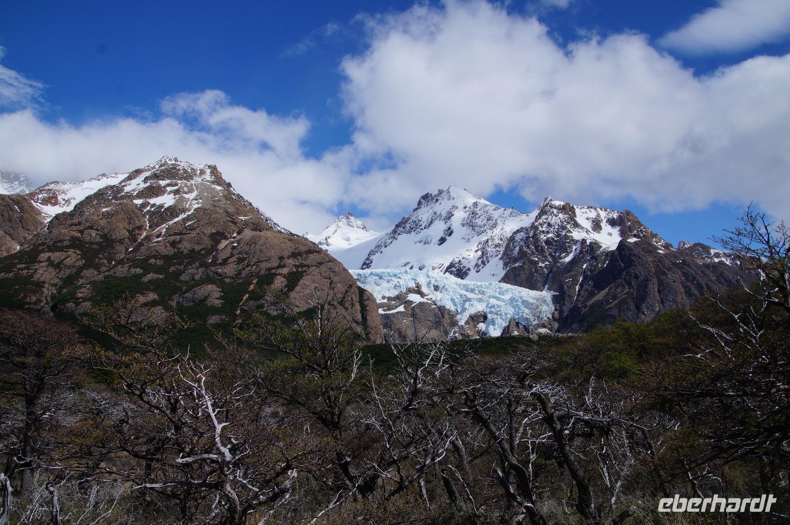 Zunächst stoppten wir auf 710 m NN am Mirador Torre (zur Erinnerung, das Dorf El Chaltén liegt auf 400 m), wo wir linkerhand auf einen Wasserfall blickten und geradeaus den Cerro Torre sehen konnten. Der hatte sich bisher unseren Blicken weitgehend entzogen, weil er eigentlich noch hinter dem Fitz Roy-Massiv liegt und er dadurch noch mehr durch kleinere Berge und auch Wolken und Nebel verdeckt wird.