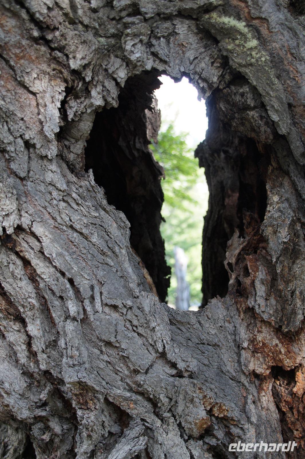 Anders die Lenga. Die Lenga ist vielleicht etwas divenhafter als die Ñirre und fühlt sich gestresst, wenn es zu trocken oder zu feucht ist, sie mag gleichbleibende Feuchte. Aus diesem Grund wächst sie eher an Hängen, sie wird gut 30 Meter hoch, die Ñirre vielleicht 15.