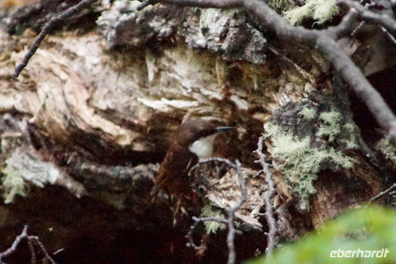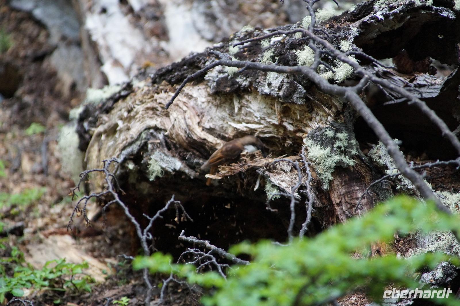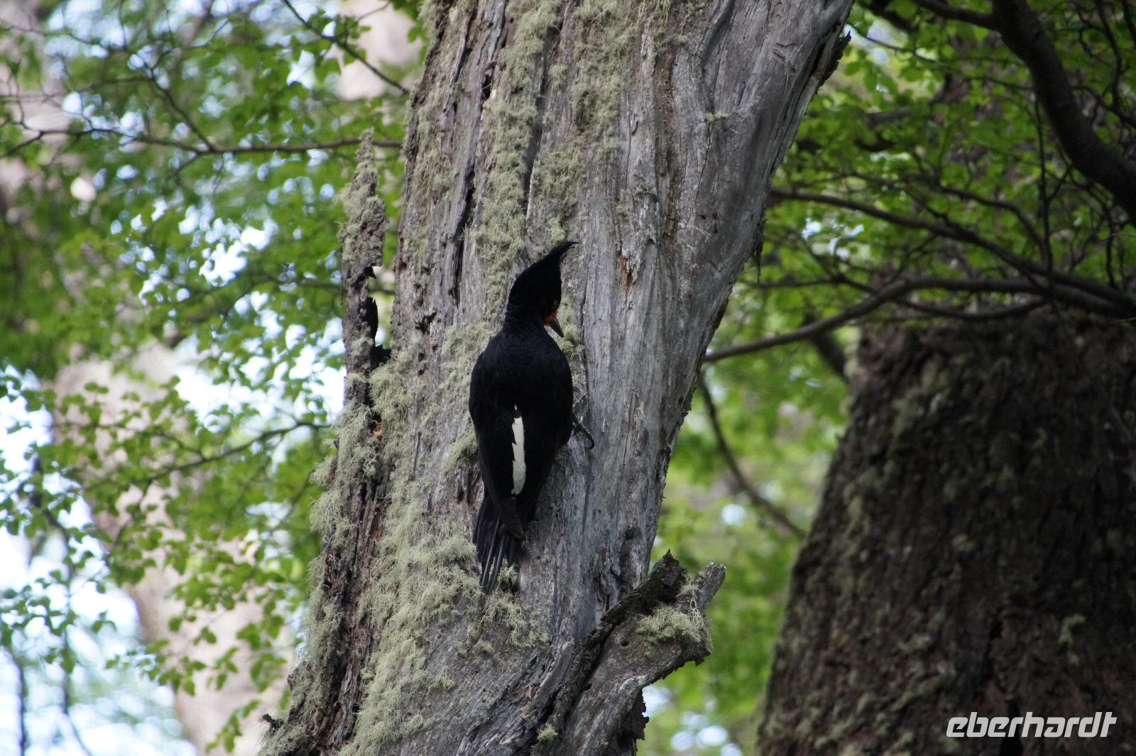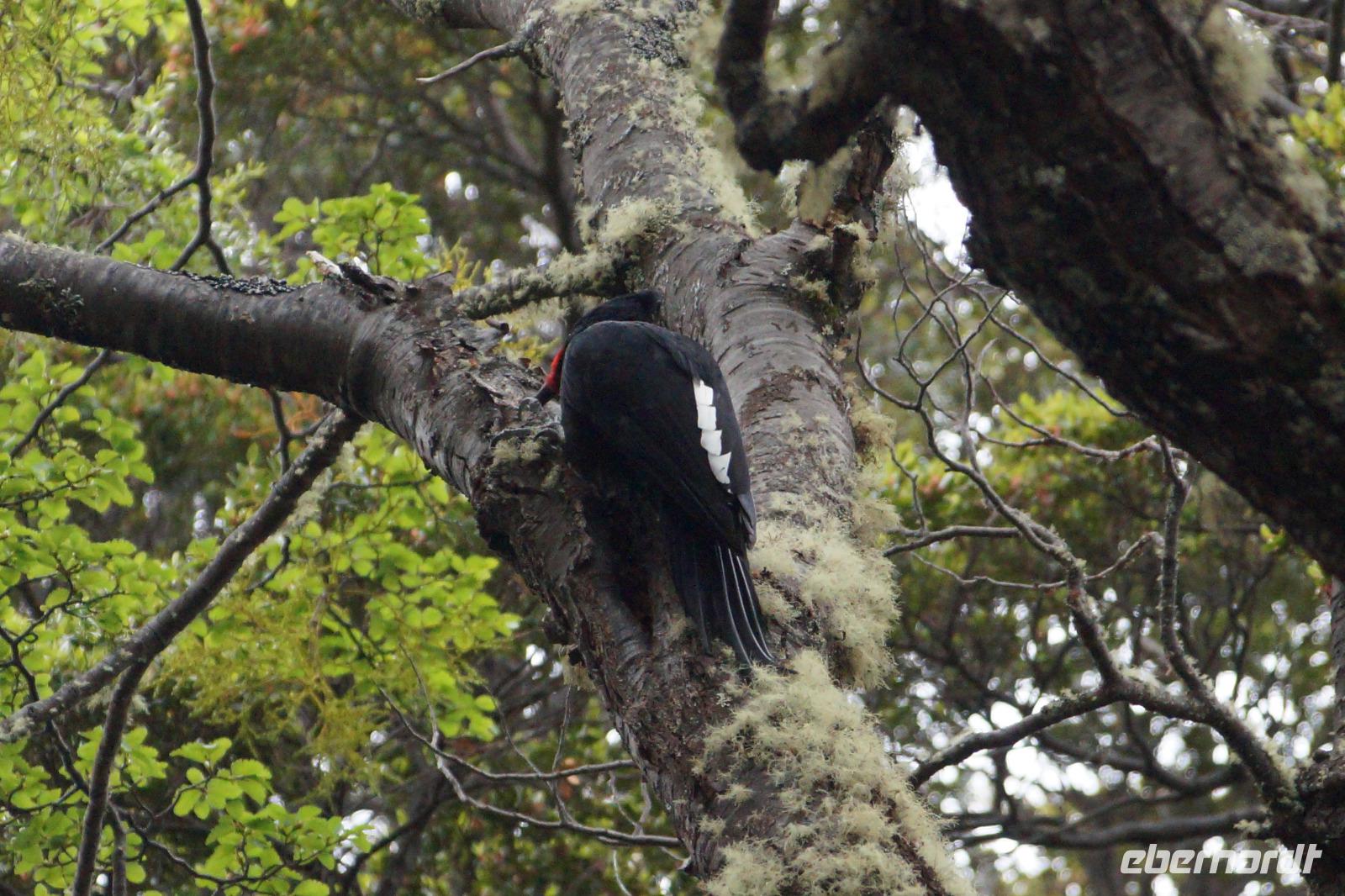 Entlang des Río de la Vueltas fuhren wir zur Hostería del Pilar, wo unsere erste richtige Wanderung (auf 450 m NN) startete. Entlang des Río Blanco, den wir aber nur zu Anfang zu Gesicht bekamen, wanderten wir, das Fitz Roy-Massiv vor Augen, los. Neben Finken und kleineren Vögeln sahen wir auch ein Spechtweibchen, welches sich bei seiner Nahrungssuche überhaupt nicht von uns stören ließ. Auch eine Gruppe von drei Männchen wurde gesehen, aber dieses Glück hatte nicht jeder. Kurze Zeit später räumte ein Baumläufer die Ritzen einer umgestürzten Südbuche aus, um zwischen den Splittern des verrottenden Baumes, den in die Ritzen gefallenen Ästchen und Blättchen seine proteinreiche Nahrung zu finden.