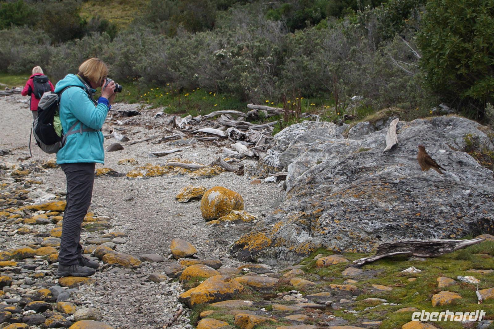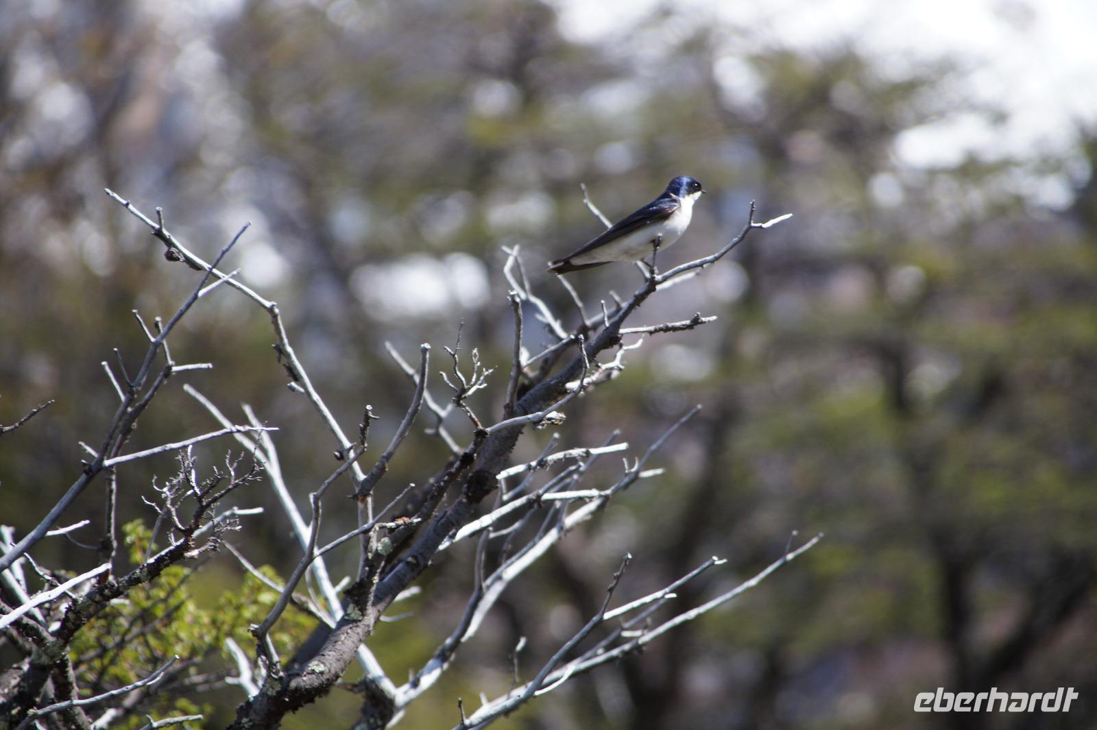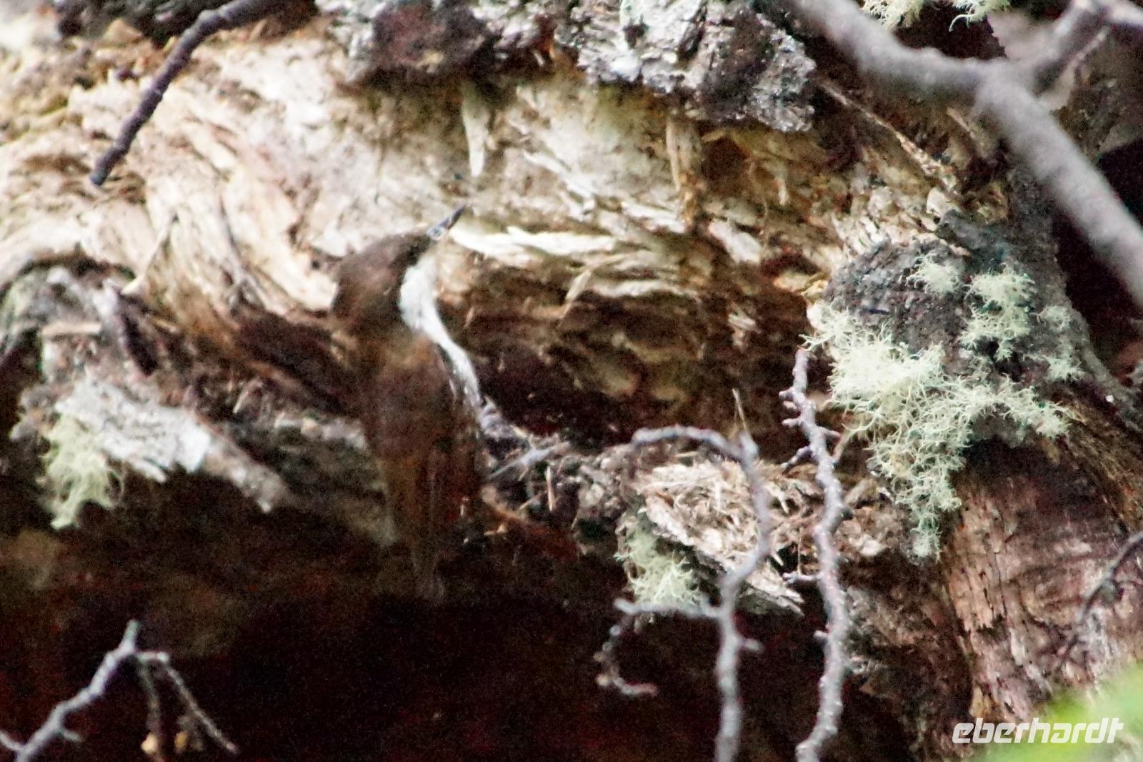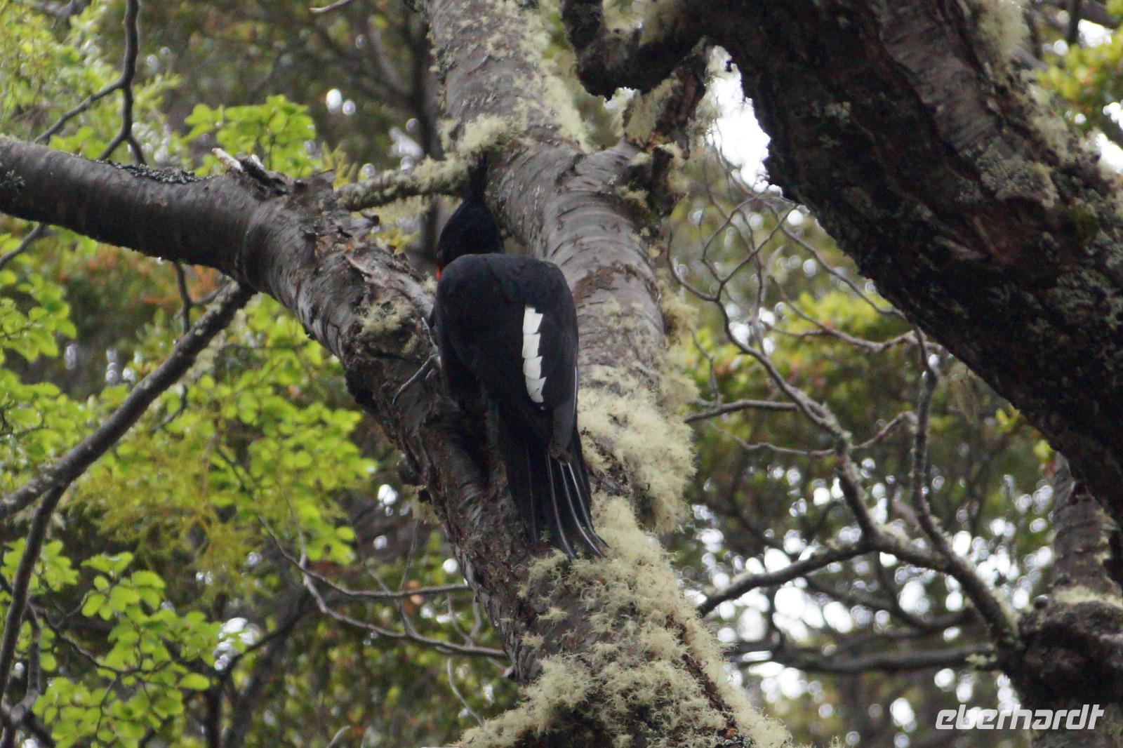 Entlang des Río de la Vueltas fuhren wir zur Hostería del Pilar, wo unsere erste richtige Wanderung (auf 450 m NN) startete. Entlang des Río Blanco, den wir aber nur zu Anfang zu Gesicht bekamen, wanderten wir, das Fitz Roy-Massiv vor Augen, los. Neben Finken und kleineren Vögeln sahen wir auch ein Spechtweibchen, welches sich bei seiner Nahrungssuche überhaupt nicht von uns stören ließ. Auch eine Gruppe von drei Männchen wurde gesehen, aber dieses Glück hatte nicht jeder. Kurze Zeit später räumte ein Baumläufer die Ritzen einer umgestürzten Südbuche aus, um zwischen den Splittern des verrottenden Baumes, den in die Ritzen gefallenen Ästchen und Blättchen seine proteinreiche Nahrung zu finden.