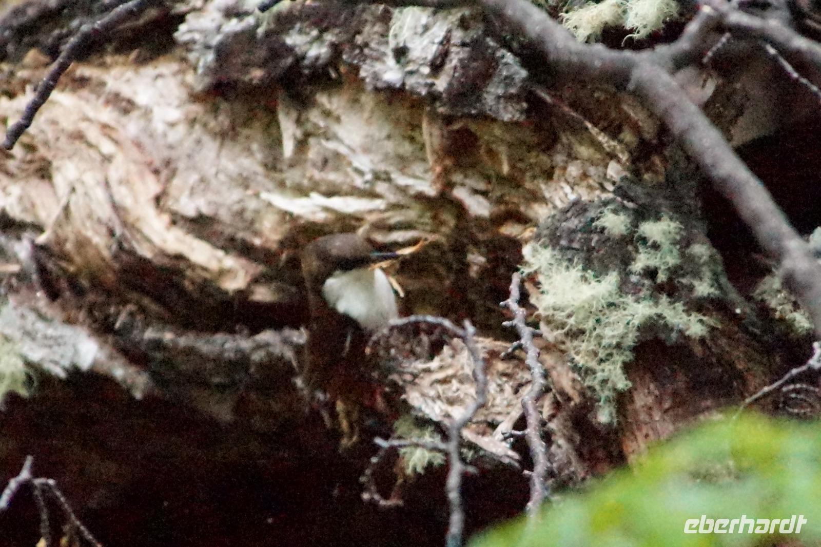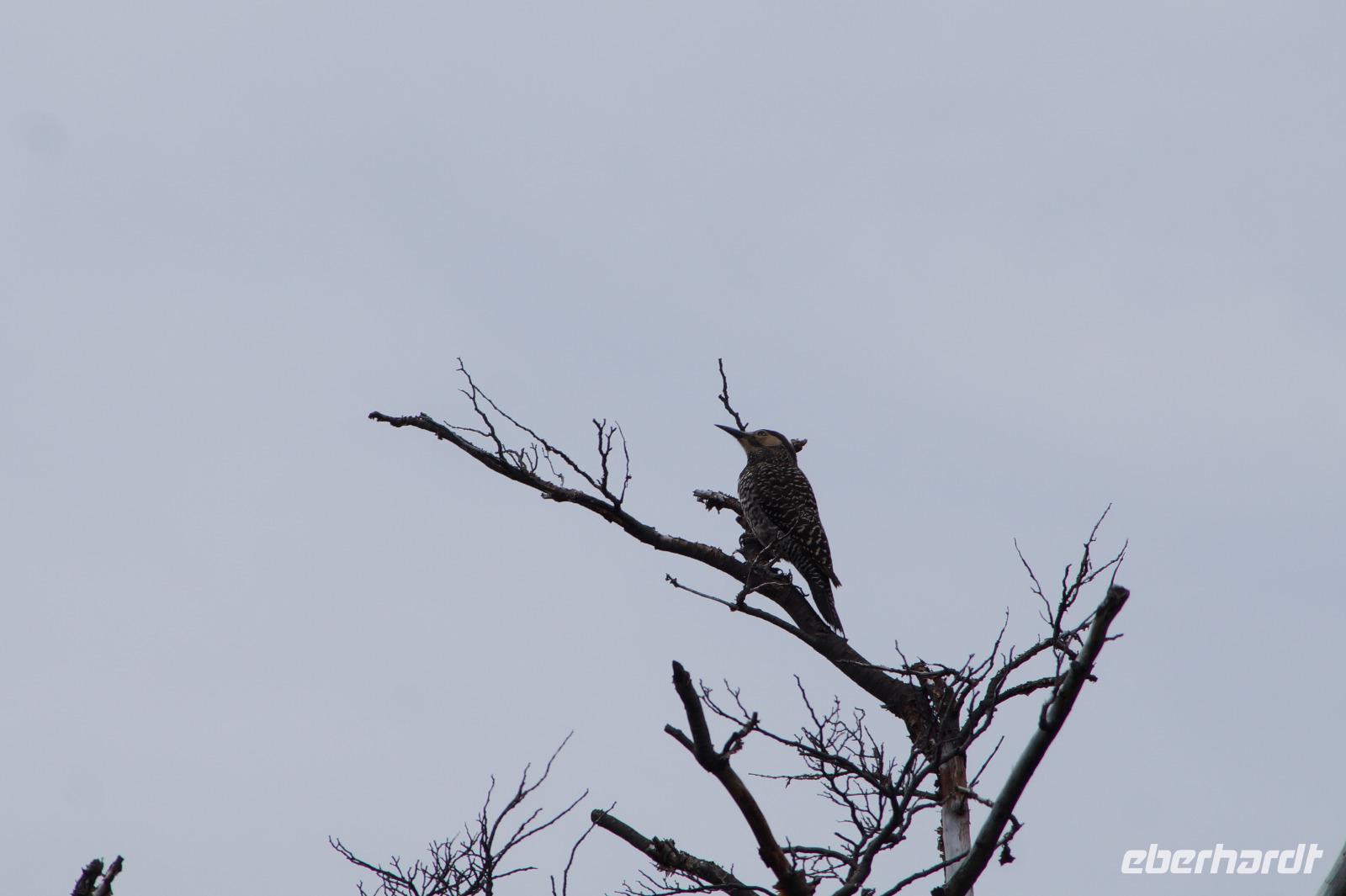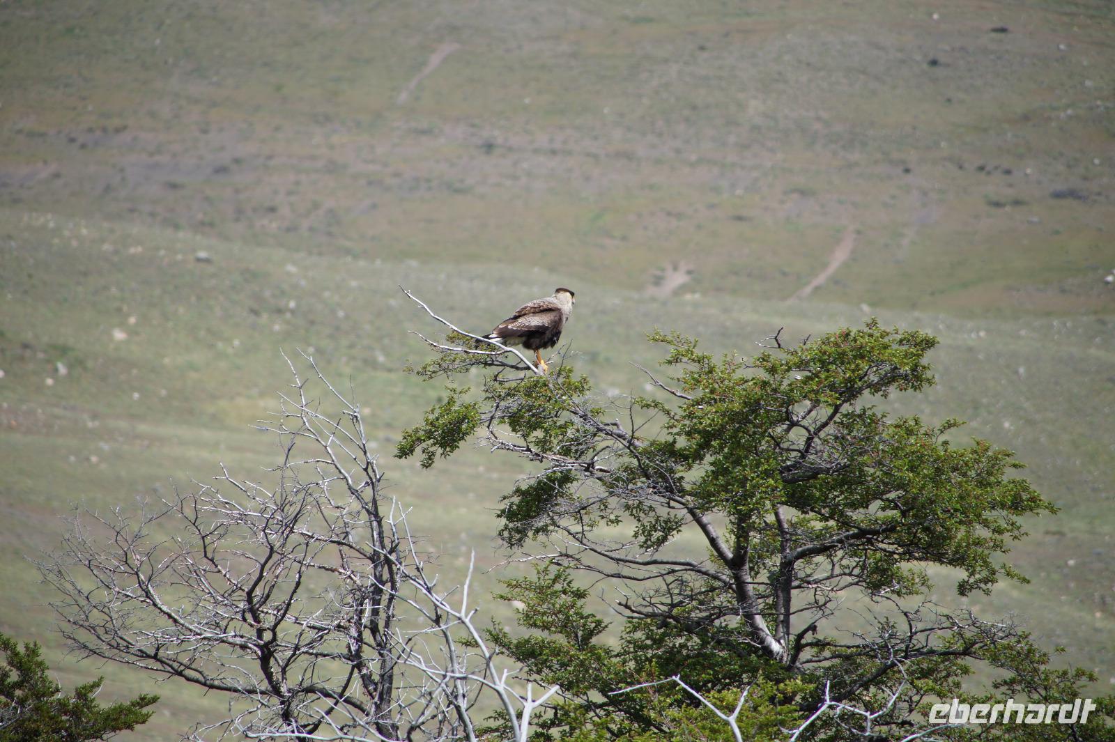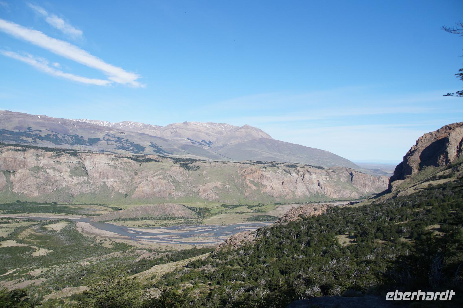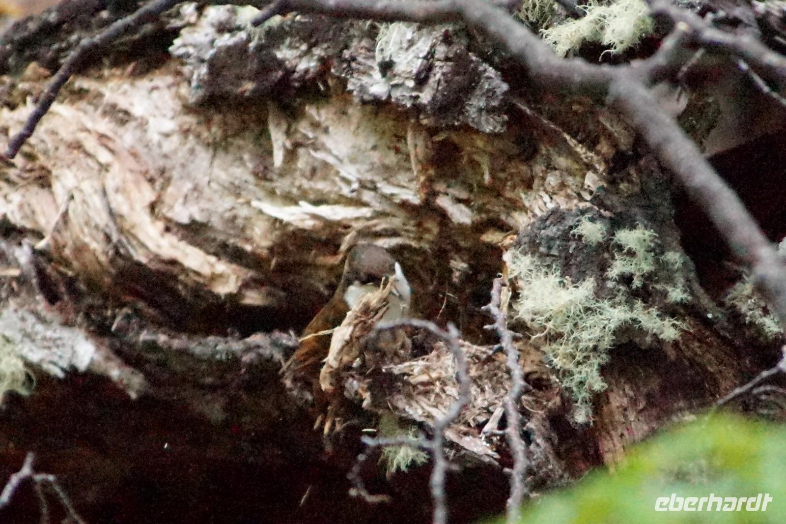 Entlang des Río de la Vueltas fuhren wir zur Hostería del Pilar, wo unsere erste richtige Wanderung (auf 450 m NN) startete. Entlang des Río Blanco, den wir aber nur zu Anfang zu Gesicht bekamen, wanderten wir, das Fitz Roy-Massiv vor Augen, los. Neben Finken und kleineren Vögeln sahen wir auch ein Spechtweibchen, welches sich bei seiner Nahrungssuche überhaupt nicht von uns stören ließ. Auch eine Gruppe von drei Männchen wurde gesehen, aber dieses Glück hatte nicht jeder. Kurze Zeit später räumte ein Baumläufer die Ritzen einer umgestürzten Südbuche aus, um zwischen den Splittern des verrottenden Baumes, den in die Ritzen gefallenen Ästchen und Blättchen seine proteinreiche Nahrung zu finden.