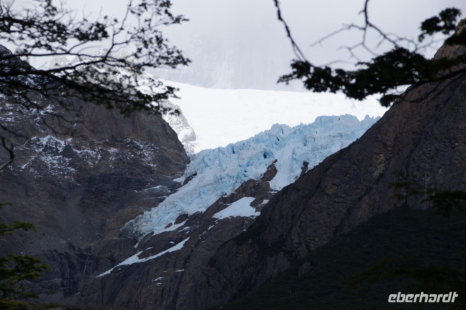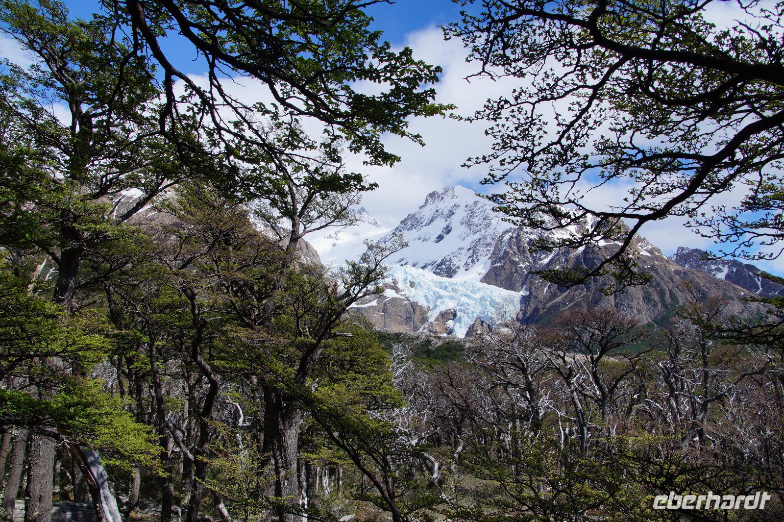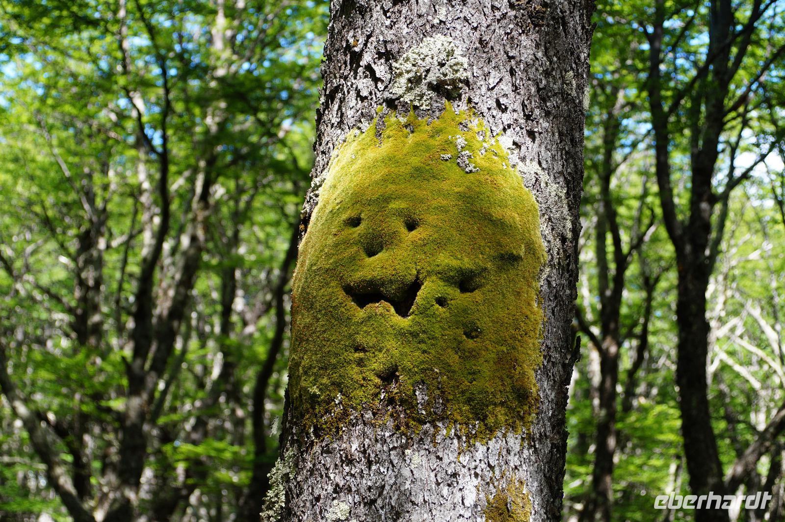 Entgegen seines Namens liegt der „Wüstensee" mitten im Wald. Durch diesen Wald, in dessen moosbewachsene Bäume lustige Zeitgenossen Moosfratzen gestochen hatten, führte entlang eines Gletscherbachs, der hinter einer Felsbarriere versteckt lag, unser Aufstieg zur türkis leuchtenden Gletscherlagune Laguna Huemul. Von hier oben konnten wir auch Blicke aud den Lago del Desiero erhaschen. Auf dem gleichen Weg, den wir gekommen waren, wanderten wir zurück.