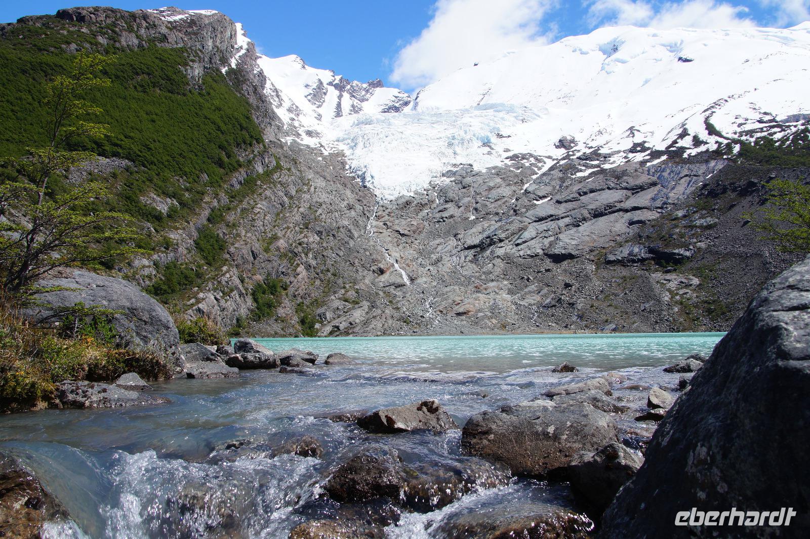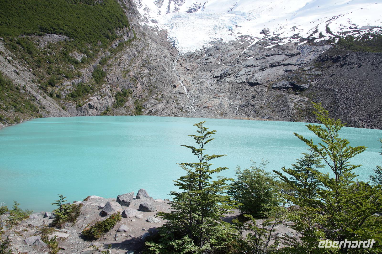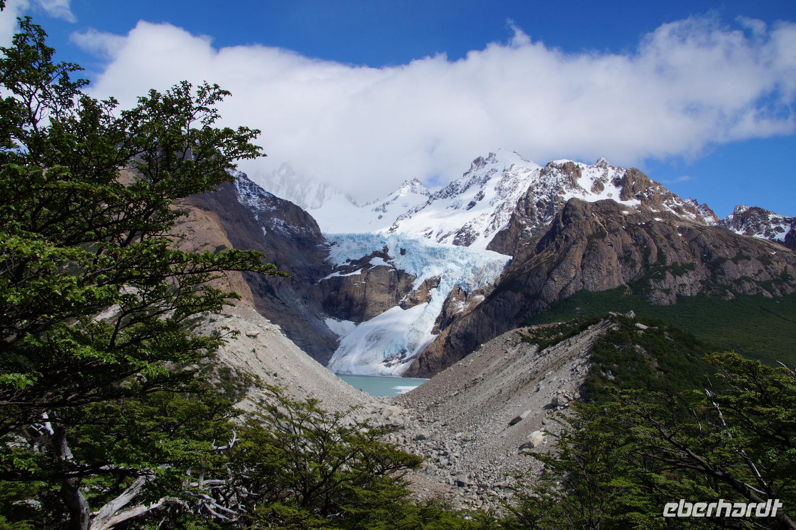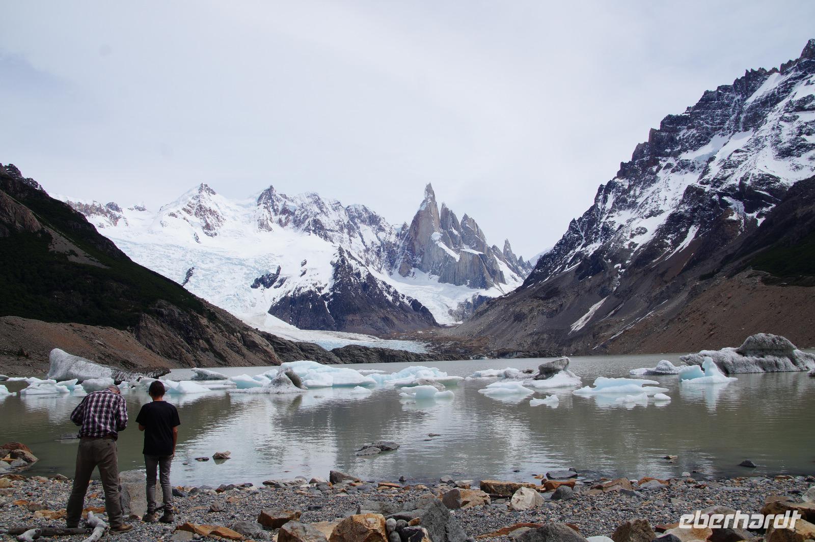 Inzwischen sind wir weitergewandert, haben so manchen Tümpel oder Bach überwunden (Pedro: „Die ganze letzte Woche hat es hier so heftig geregnet, wie ich es hier noch nie erlebt habe" - Glück gehabt, würde ich sagen, wir sehen den blauen Himmel, alles richtig gemacht) und überwinden nun auch die letzte der Moränen, die zwischen uns und dem Gletschersee Laguna Torre liegt.