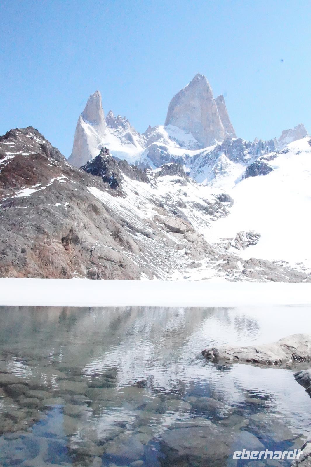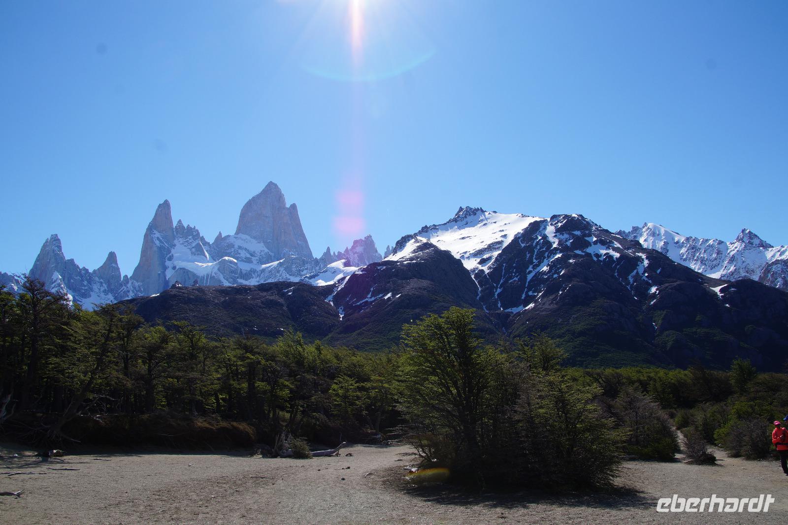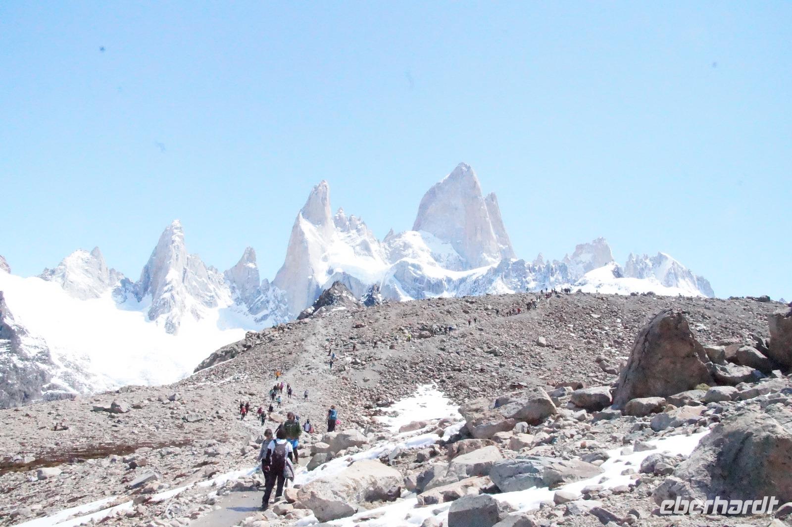 Dennoch: Es war zwar anstrengend, aber wir hatten ein riesiges Glück mit dem Wetter und einen klaren Blick auf den Fitz Roy, der seinem indianischen Namen Chaltén (~ ‚der Rauchende') zu unserer Freude heute mal keine Ehre machte.