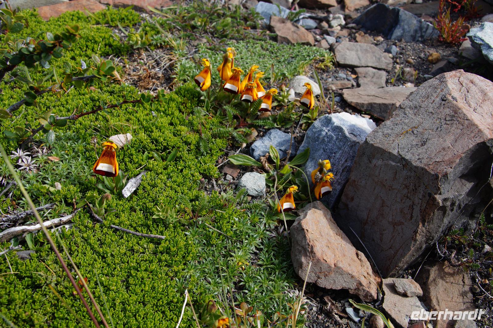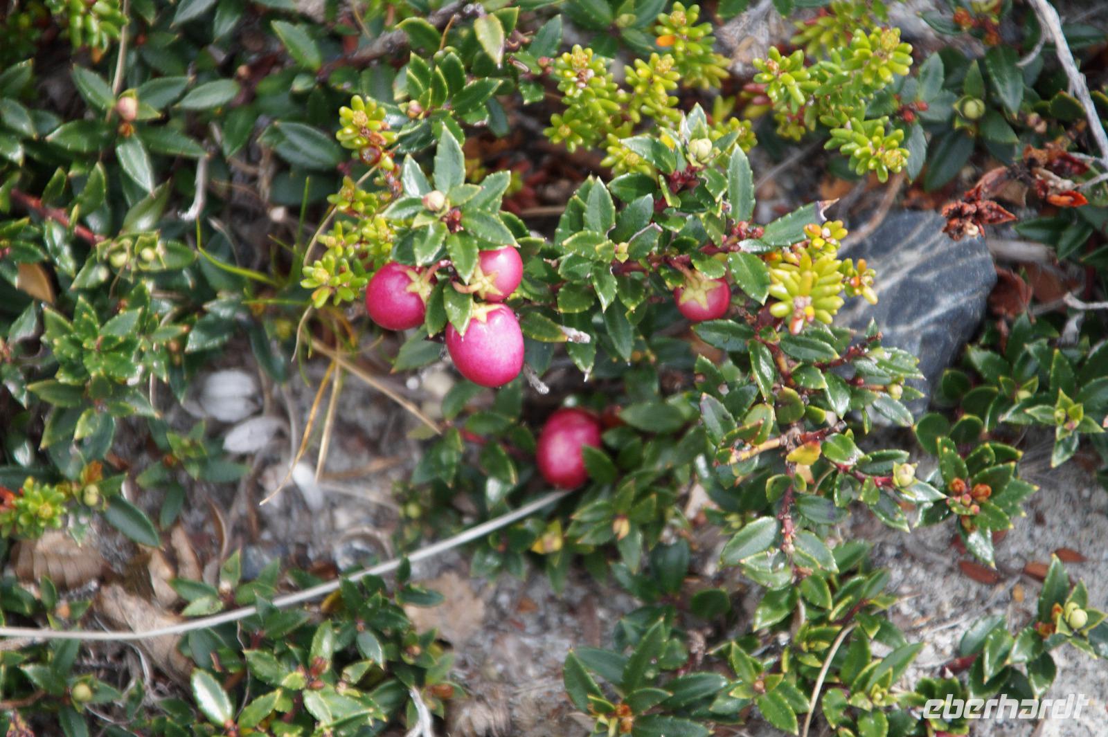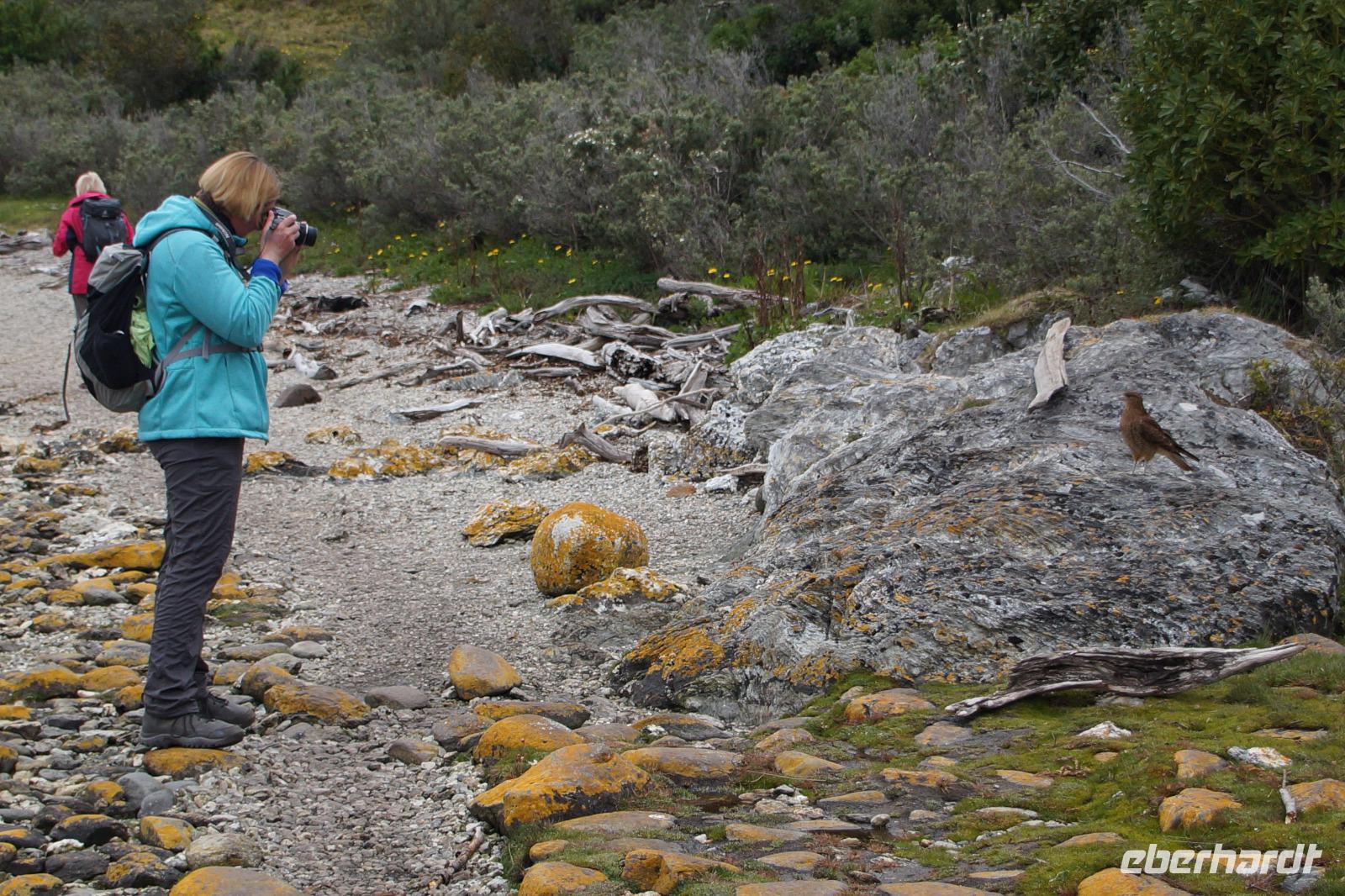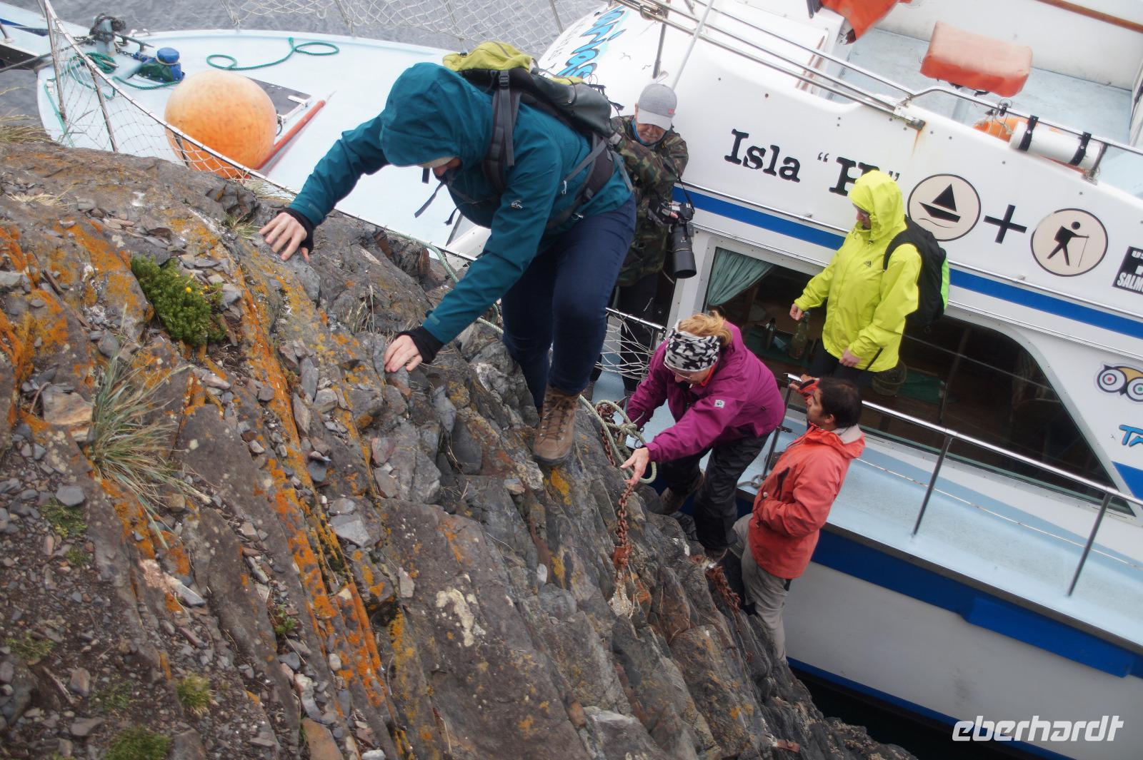 Uns war der Ausstieg auf "H" von der Morgengruppe als "speziell" angekündigt worden, er hatte tatsächlich einen Hauch von Abenteuer. Das Boot machte an dem Felsen fest und wir mussten vom Boot den Felsen hinaufklettern, da das Boot allenfalls leicht schwankte, war das nicht so schwer, wie wir Landratten zum Teil nervös waren. Zunächst begaben wir uns zum höchsten Punkt der Insel, in ihrem Südteil gelegen, dann marschierten wir zu dem Querbalken des H und von dort wieder zurück zum Boot, den Nordteil der Insel betraten wir gar nicht. Wer mochte konnte unterwegs ein paar Steife Scheinbeeren (Chauras) pflücken, aber viel Ausbeute war nicht zu machen, dazu hätte man wohl den Trampelpfad verlassen müssen, was natürlich - und zu Recht! - verboten war.