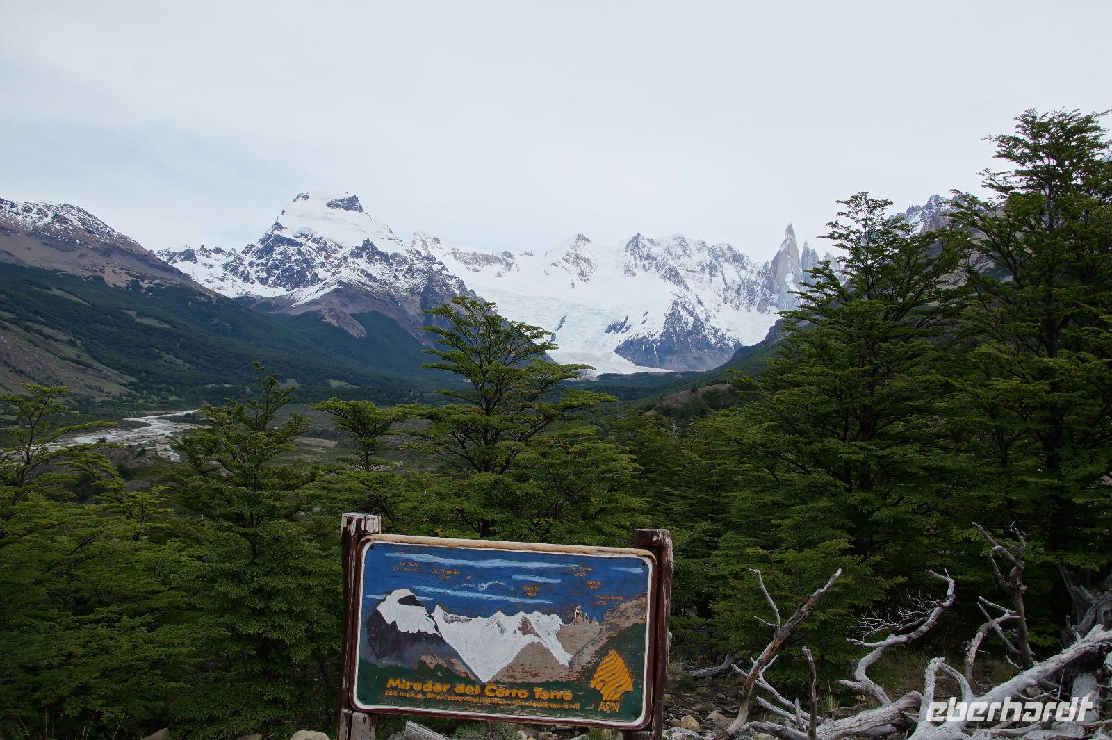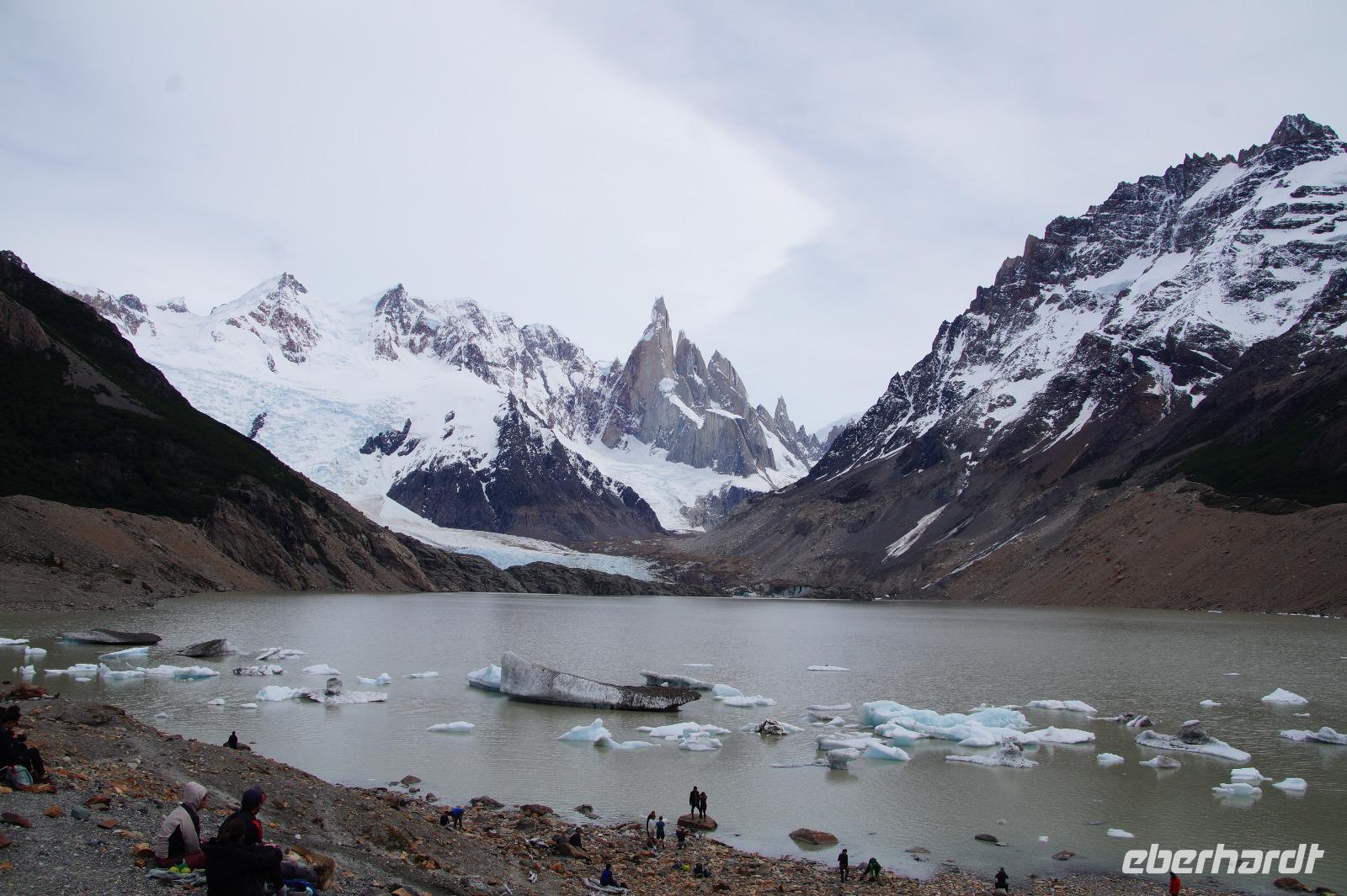 Gegenüber der Laguna Blanca, die von einer der Gletscherzungen des Fitz Roy-Gletschers gespeist wird, machten wir am entsprechenden Mirador (auf 674 m NN) Halt, um ein wenig zu snacken (snacken, nicht schnacken!).