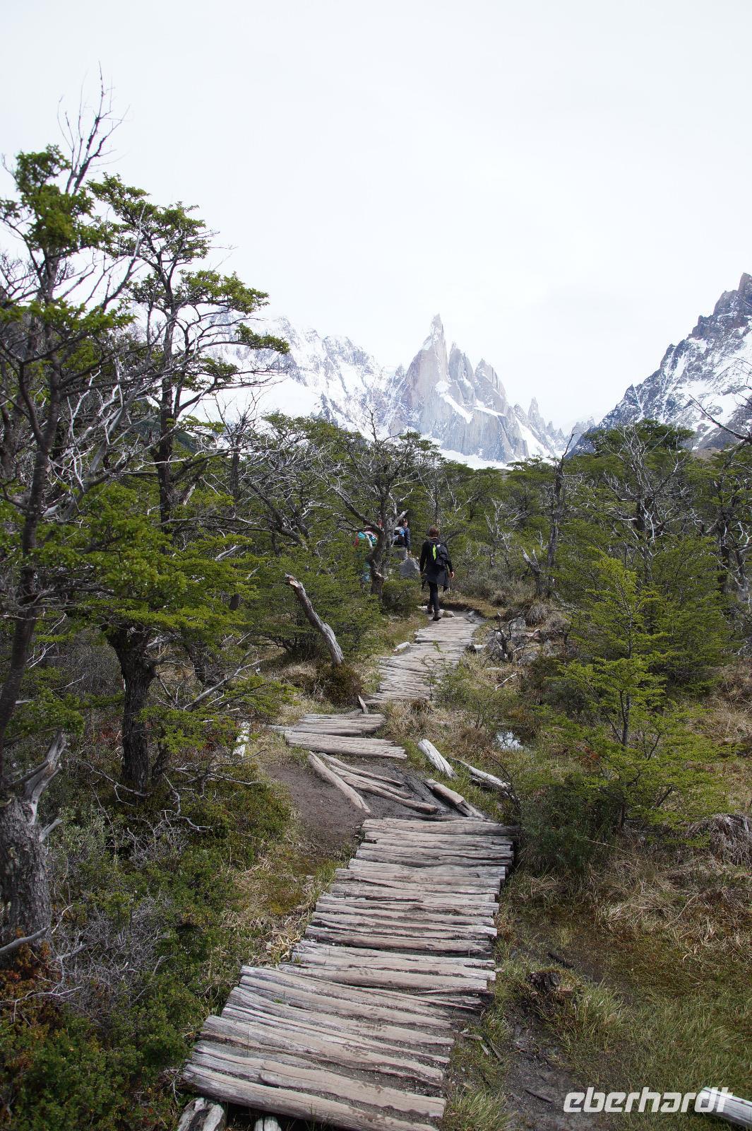 Wir verließen und Wald und erreichten über eine teils Heide, teils Sümpfe bildenden Moränenlandschaft das wiederum im Wald gelegene Basiscamp Poincenot auf 750 m NN. Hier aßen wir zunächst zu Mittag, dann teilte sich die Gruppe. Eric ging mit dreien gemächlich wieder zurück zum Hotel, der Rest wagte den weiteren Aufstieg zur Laguna de los Tres.