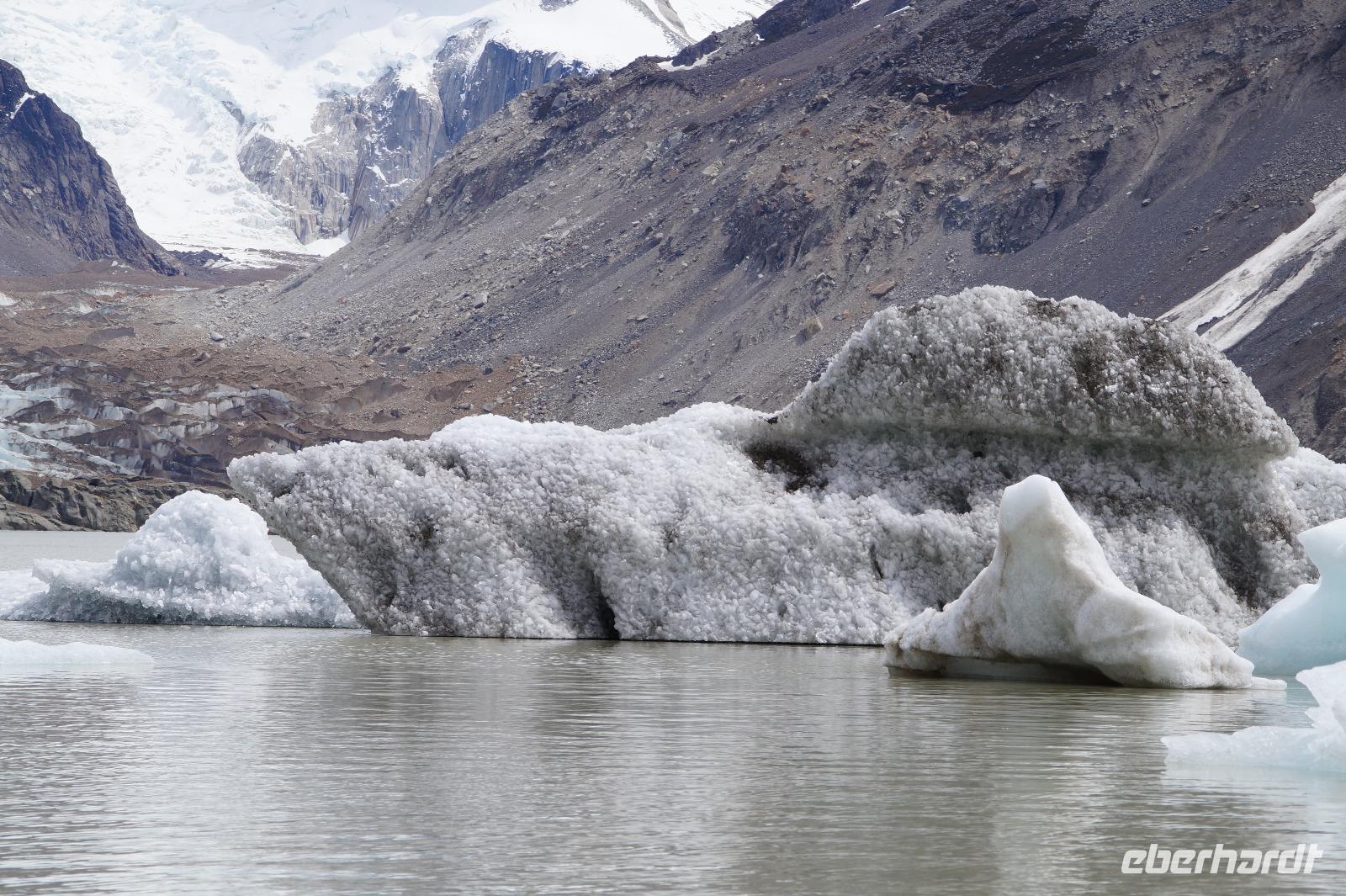 Das liegt daran, dass das untere Ende des Viedmagletschers schwimmt (und somit 2/3 seiner Masse in diesem Bereich „verborgen“ sind, während der Perito Moreno auf Fels liegt. Und genau das ist der Grund, warum der Viedma viel stärker als der Perito Moreno vom Klimawandel betroffen ist. Beide Gletscher werden durch den eigenen Druck nach unten geschoben (beim Perito Moreno sind es anderthalb bis zwei Meter am Tag). Unten bricht immer wieder Eis ab. An warmen oder regnerischen Tagen etwas mehr, an kalten Tagen etwas weniger. Beim aufliegenden Perito Moreno bricht das Eis stückchenweise herunter, bei schwimmenden Viedma aber haben die Abbrüche einen Dominoeffekt zufolge. Wenn der Gletscher kalbt, dann bricht gleich eine ganze Front von fast zwei Kilometern ab und der Gletscher verliert seinen Ankerpunkt. Da das innerpatagonische Eisfeld eine der wichtigsten Trinkwasserreserven ist, ist das durchaus problematisch.