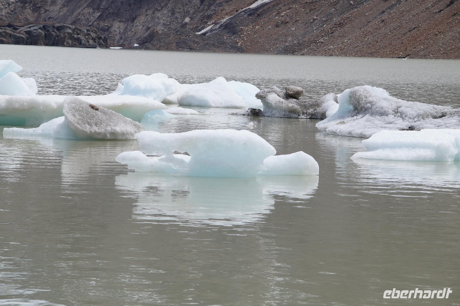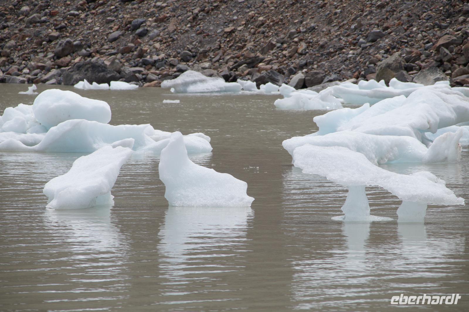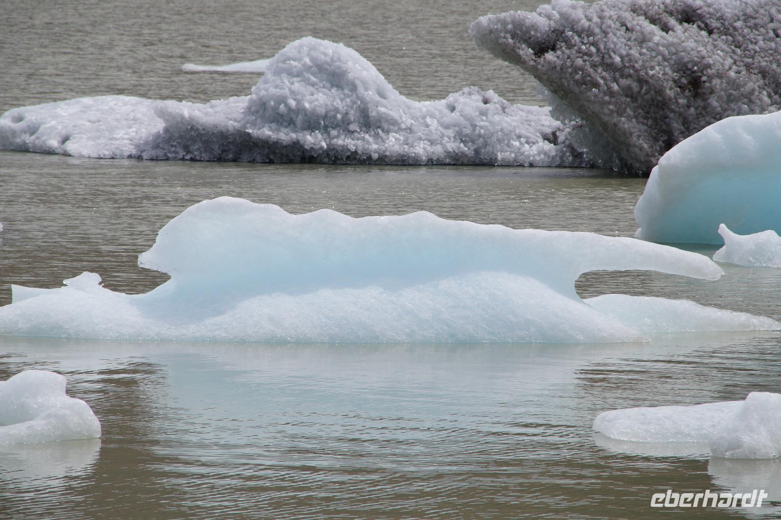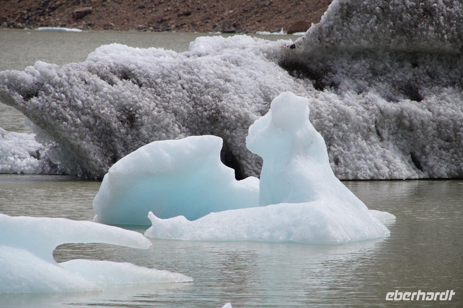 Vor uns liegt nun die Lagune und auf ihr schwimmen Kälber, hm, also... der Gletscher hat gekalbt und nun schwimmen hier eben kleine Eisberge herum. Manche sehen aus wie Boote oder Schiffe, andere erinnern an Tiere oder an ein menschliches Gesicht und manche sind einfach nicht jugendfrei!