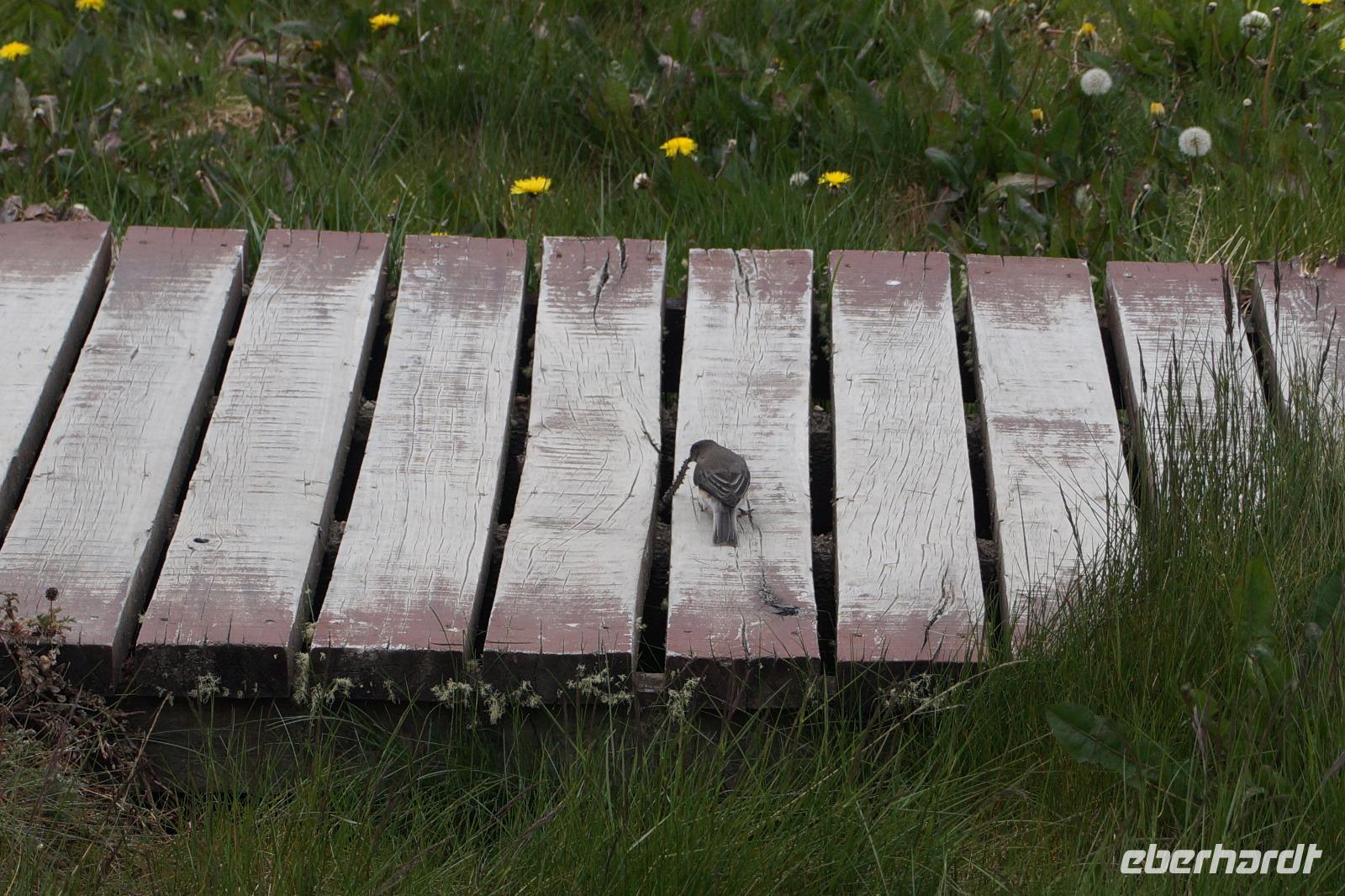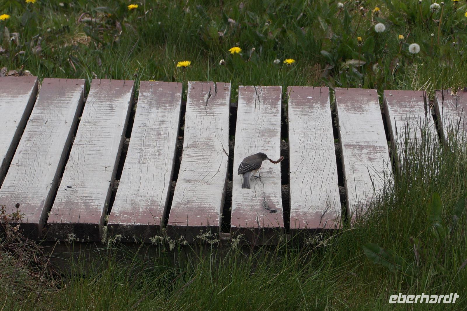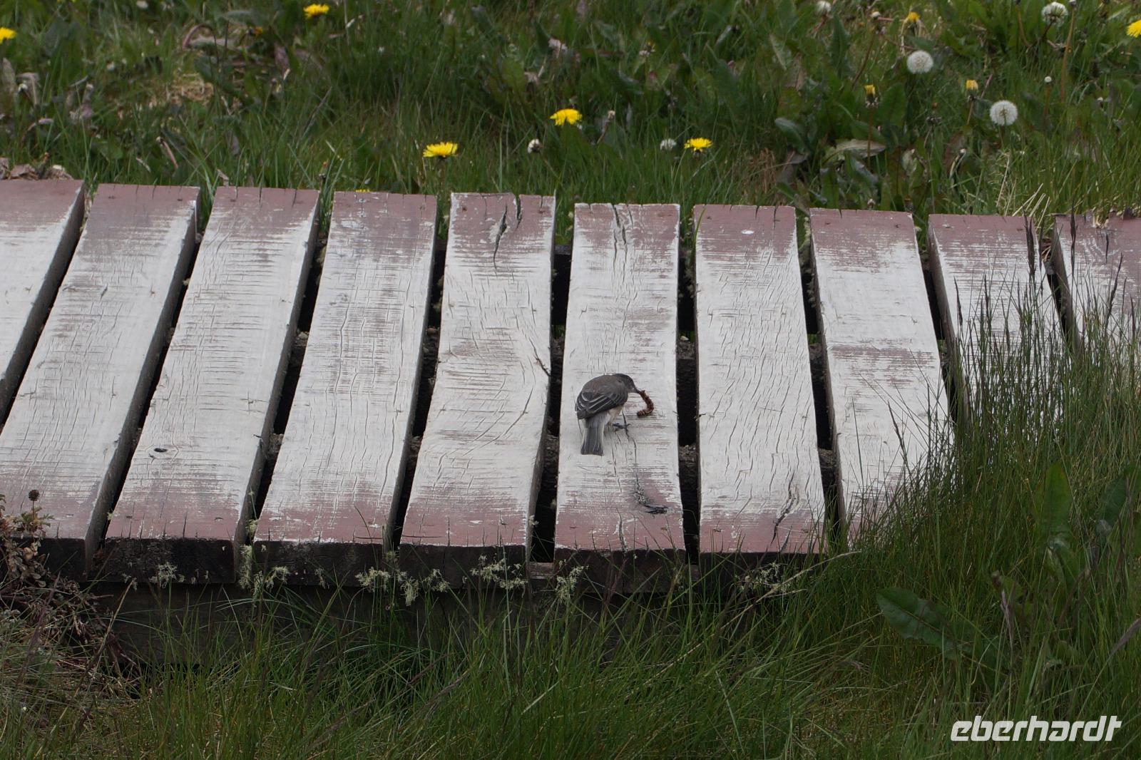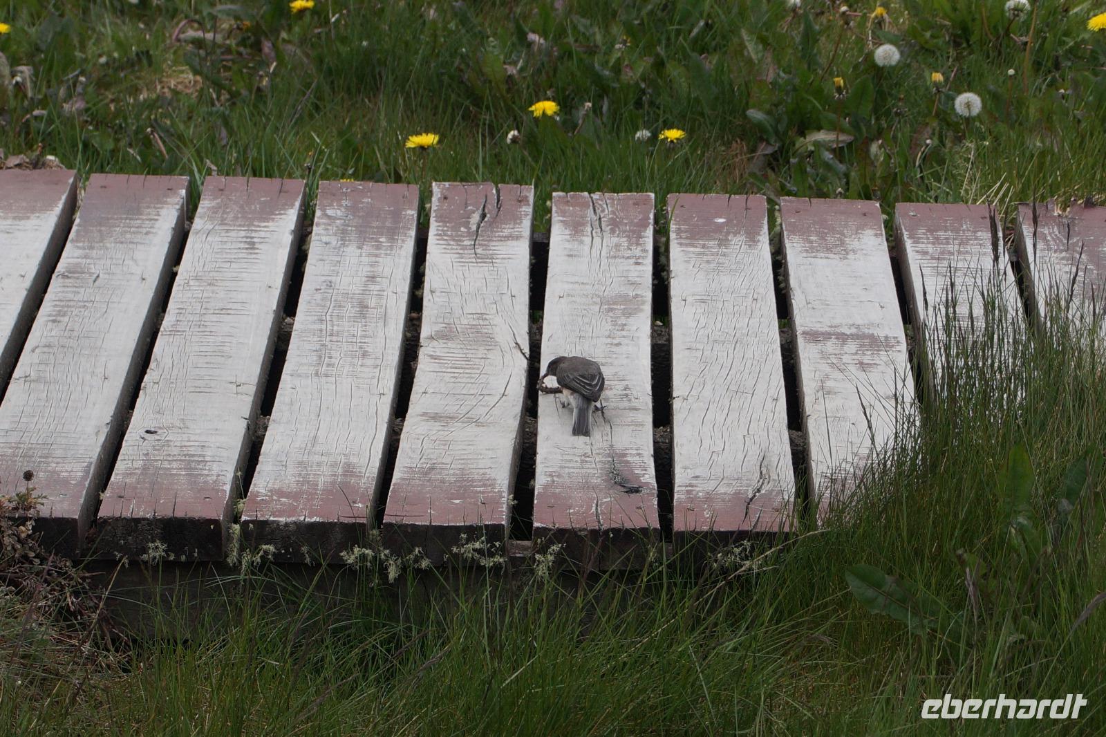 Auf dem Rückweg zum Bus sahen wir noch einen Vogel mit einem Wurm oder eine Raupe im Schnabel, der seine Beute durch hin- und herbewegen gegen den Holzsteg totzuschlagen schien.