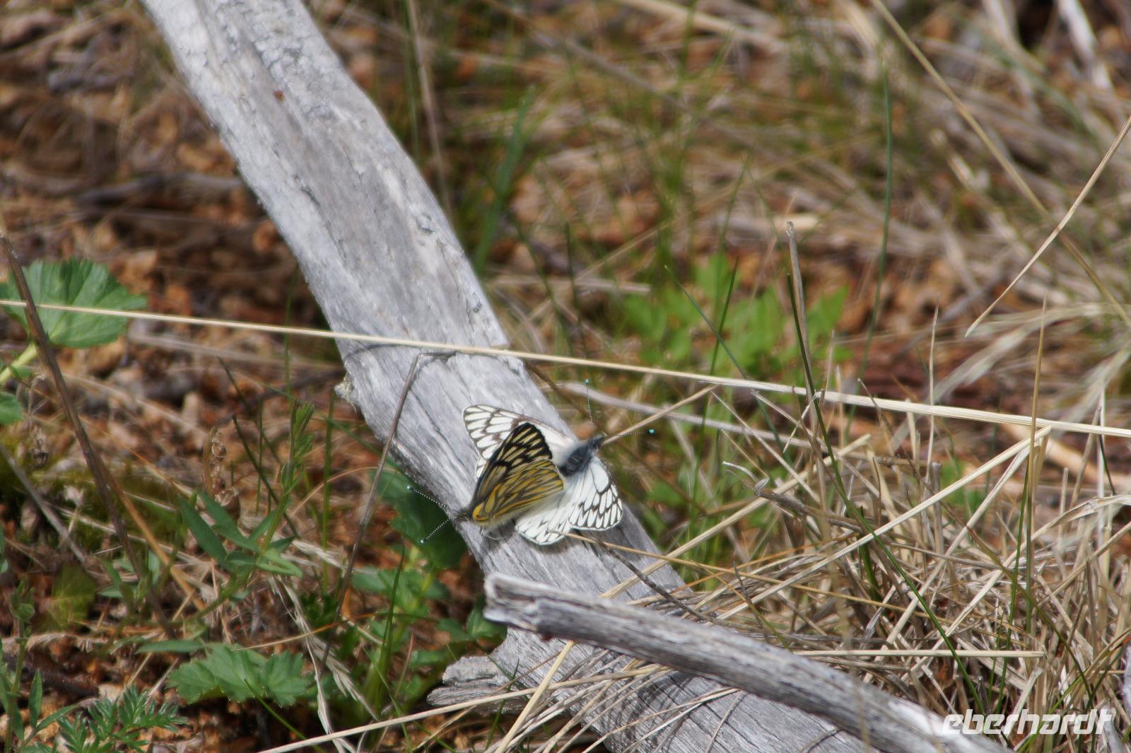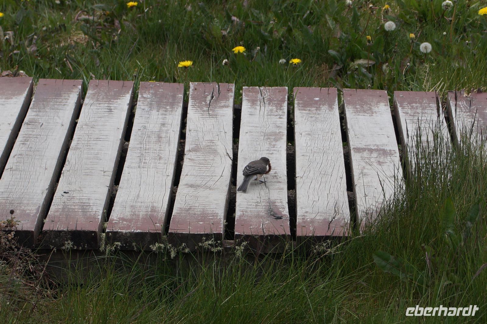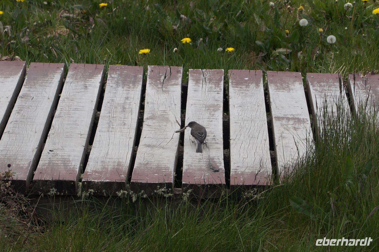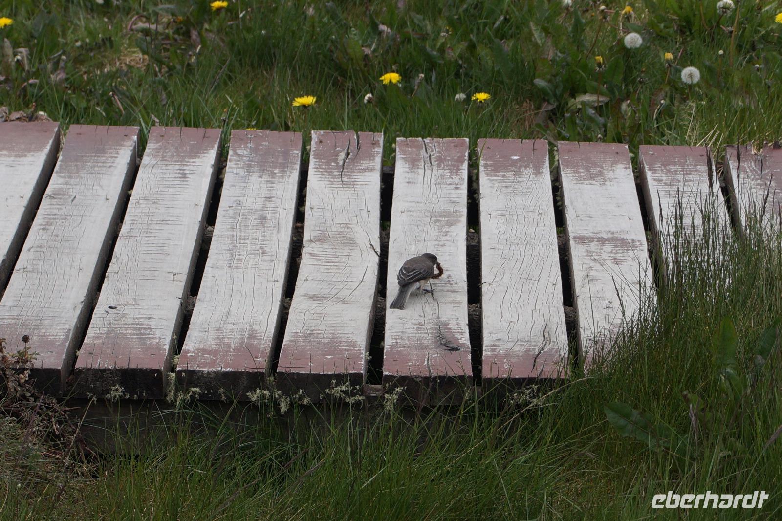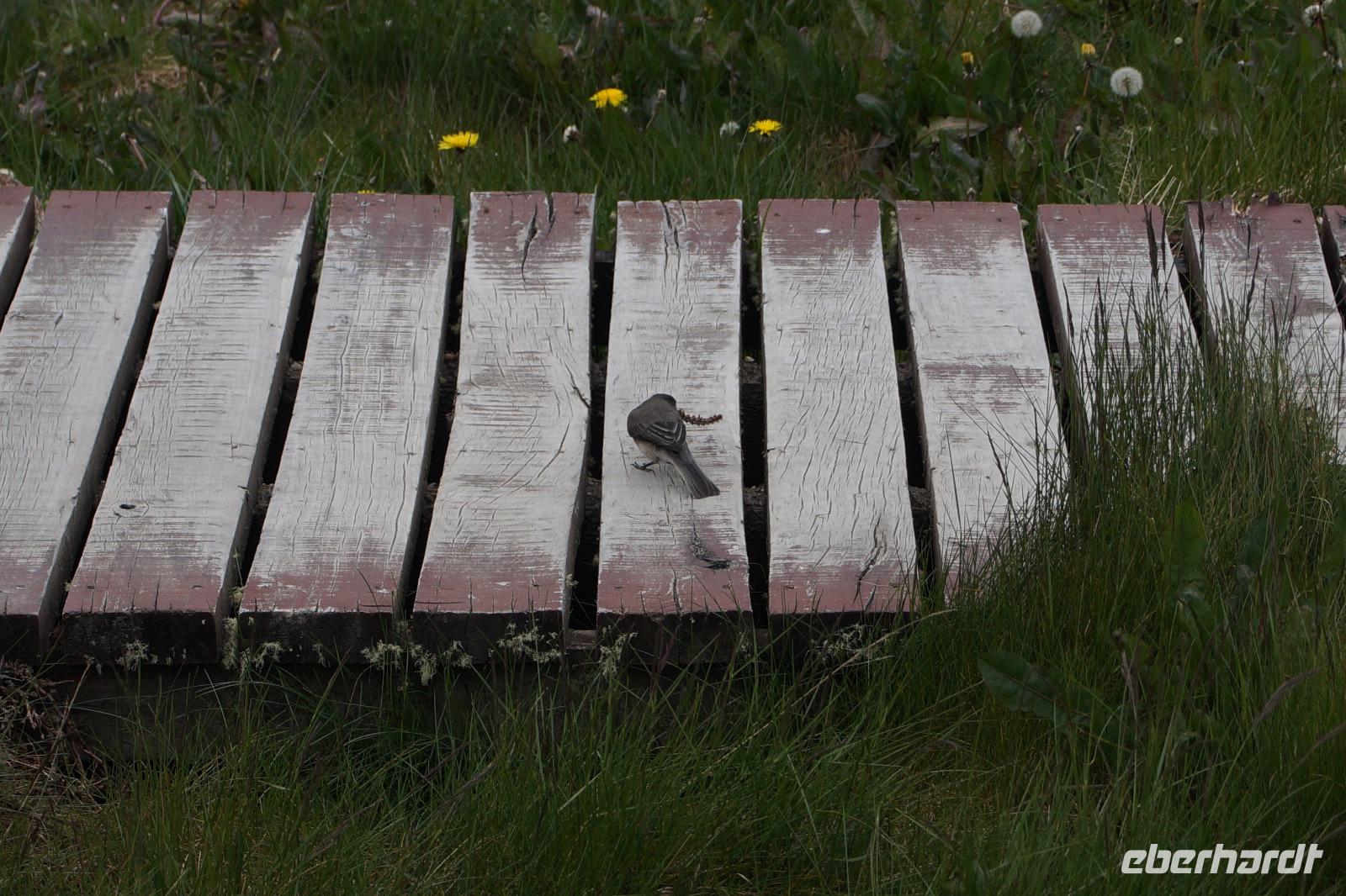 Auf dem Rückweg zum Bus sahen wir noch einen Vogel mit einem Wurm oder eine Raupe im Schnabel, der seine Beute durch hin- und herbewegen gegen den Holzsteg totzuschlagen schien.