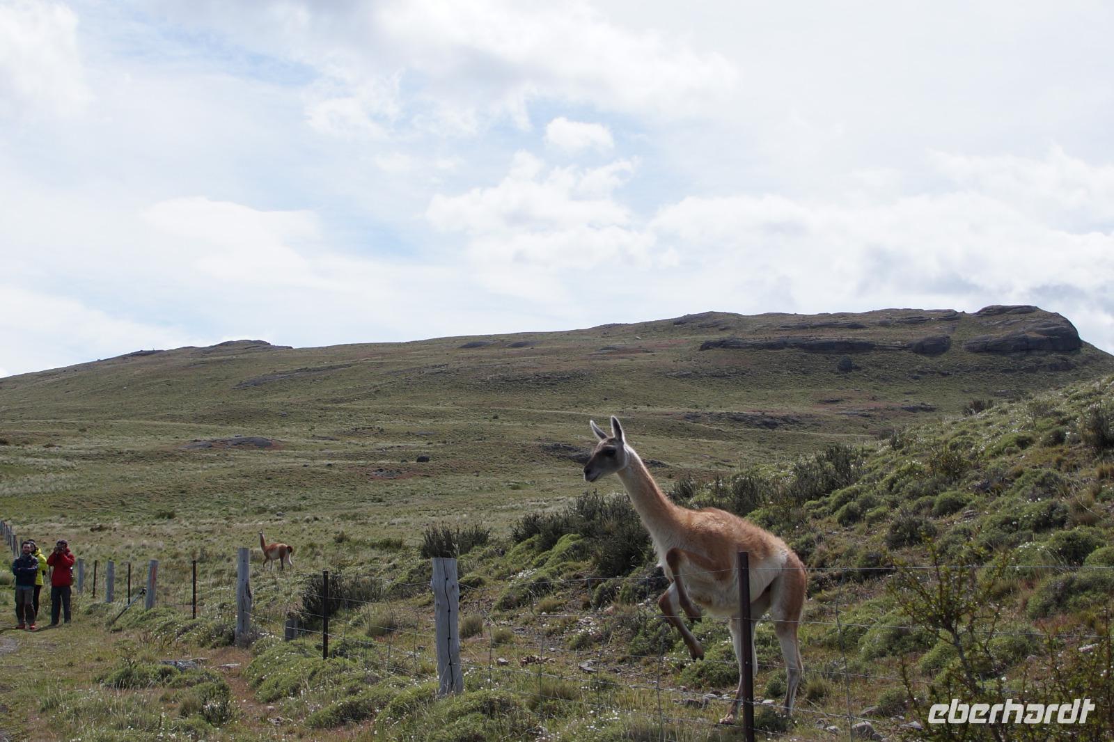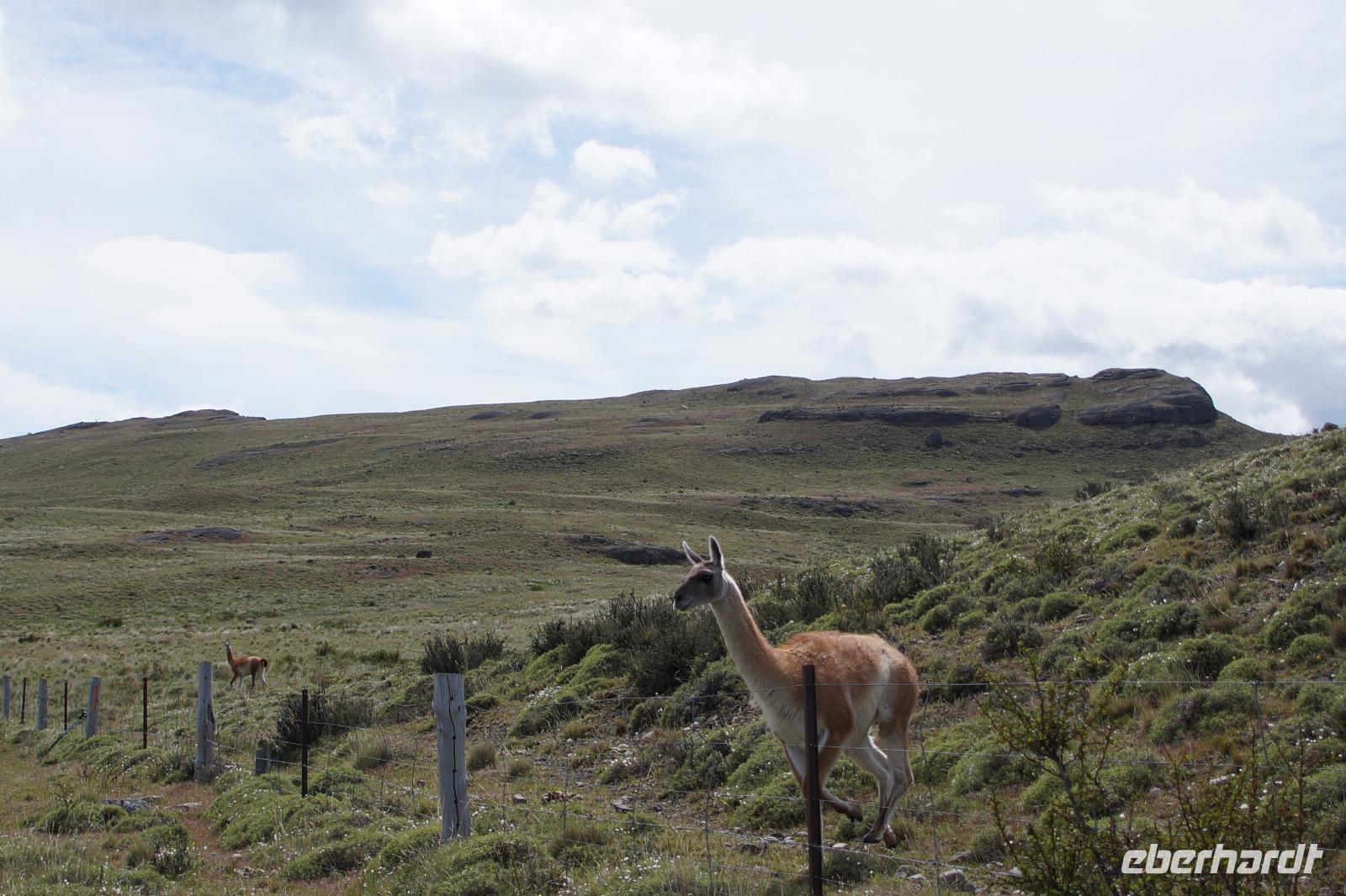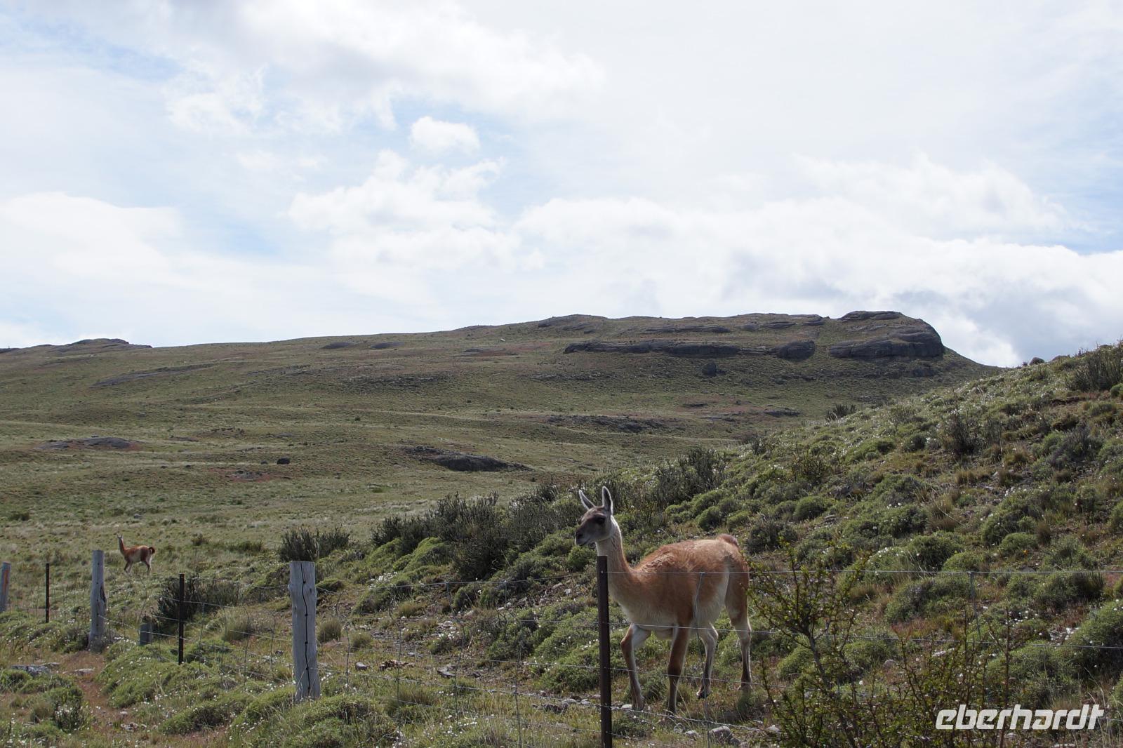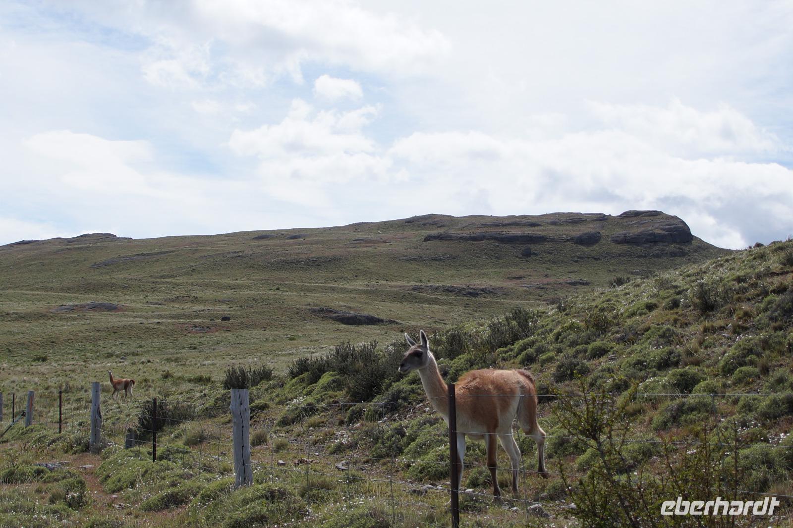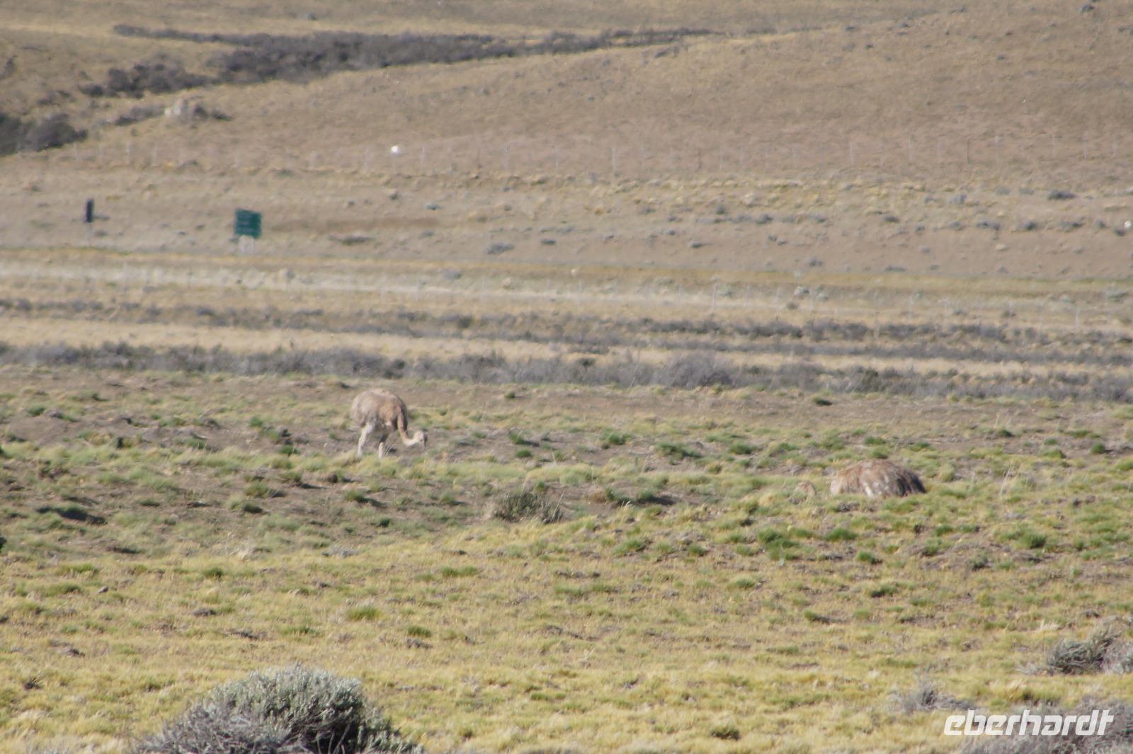 Am Zaun kreuzen die Guanacos zwischen Estancia und Park und genau das erlebten wir, als einige Guanacos, anstatt vor uns zu flüchten uns nur kurz sondierten, als Menschen wohl für harmlos erachteten und in unserer Anwesenheit den Zaun überquerten.