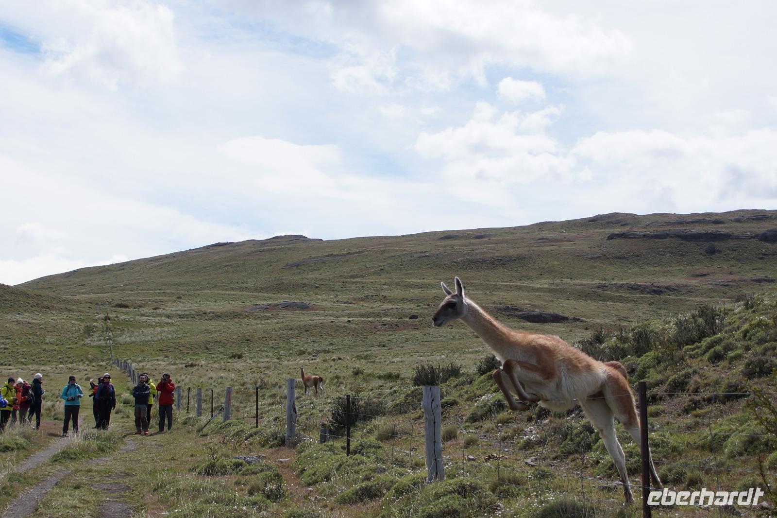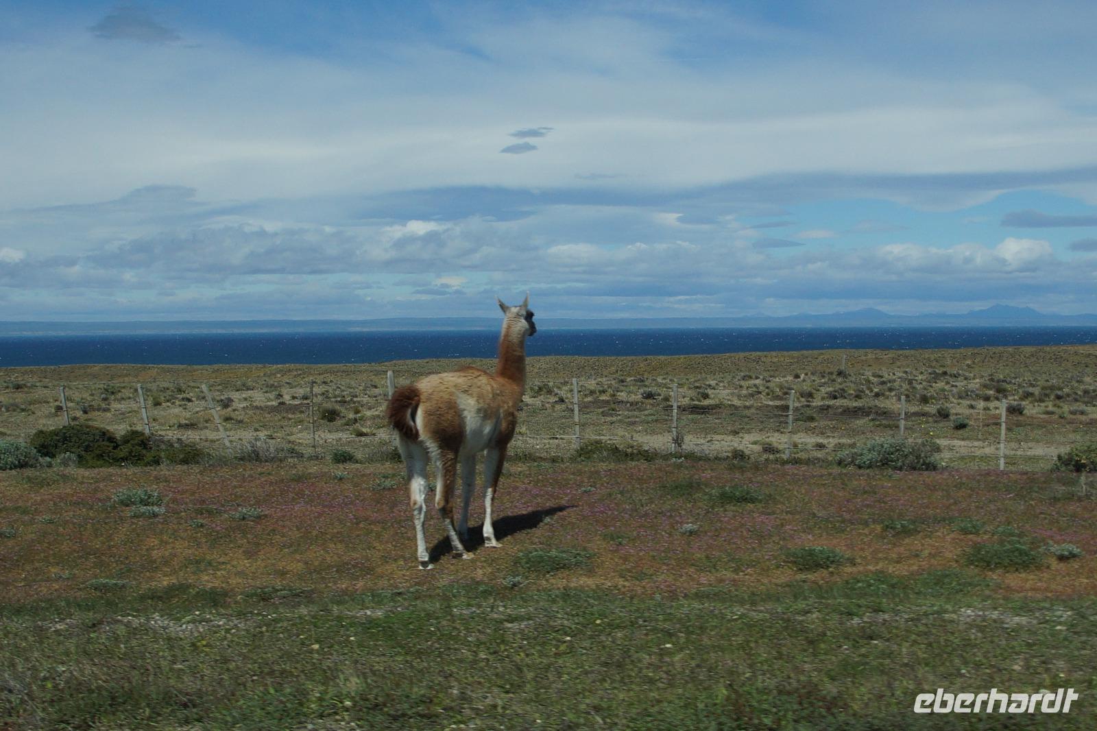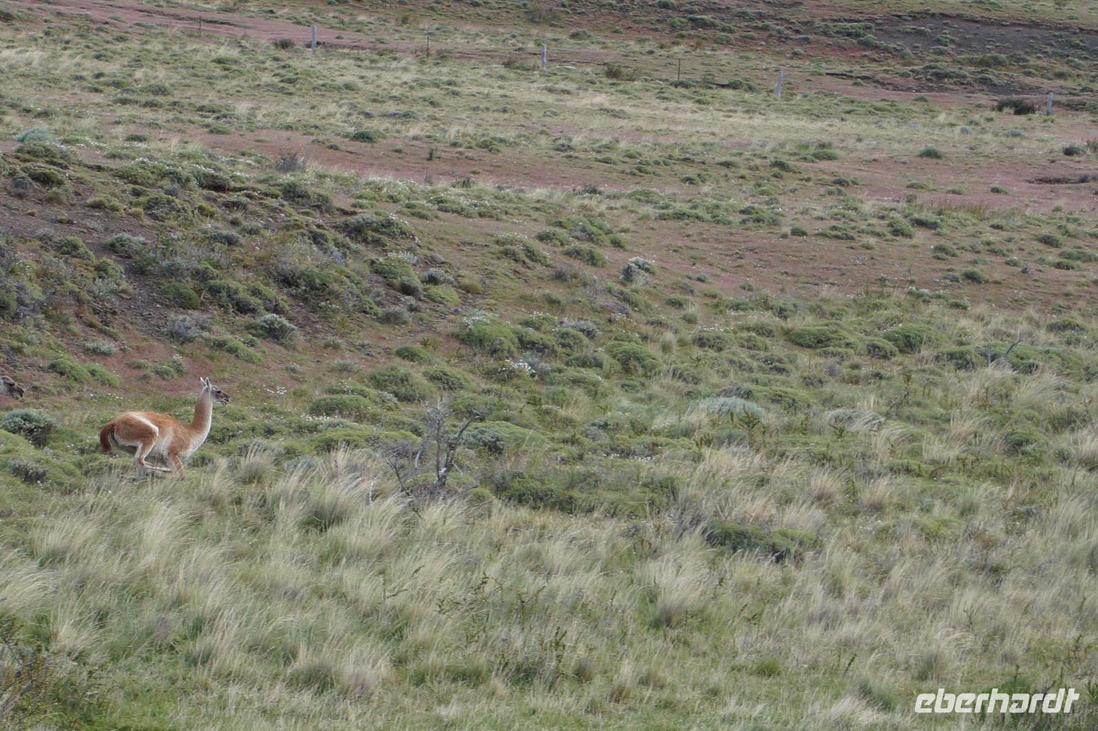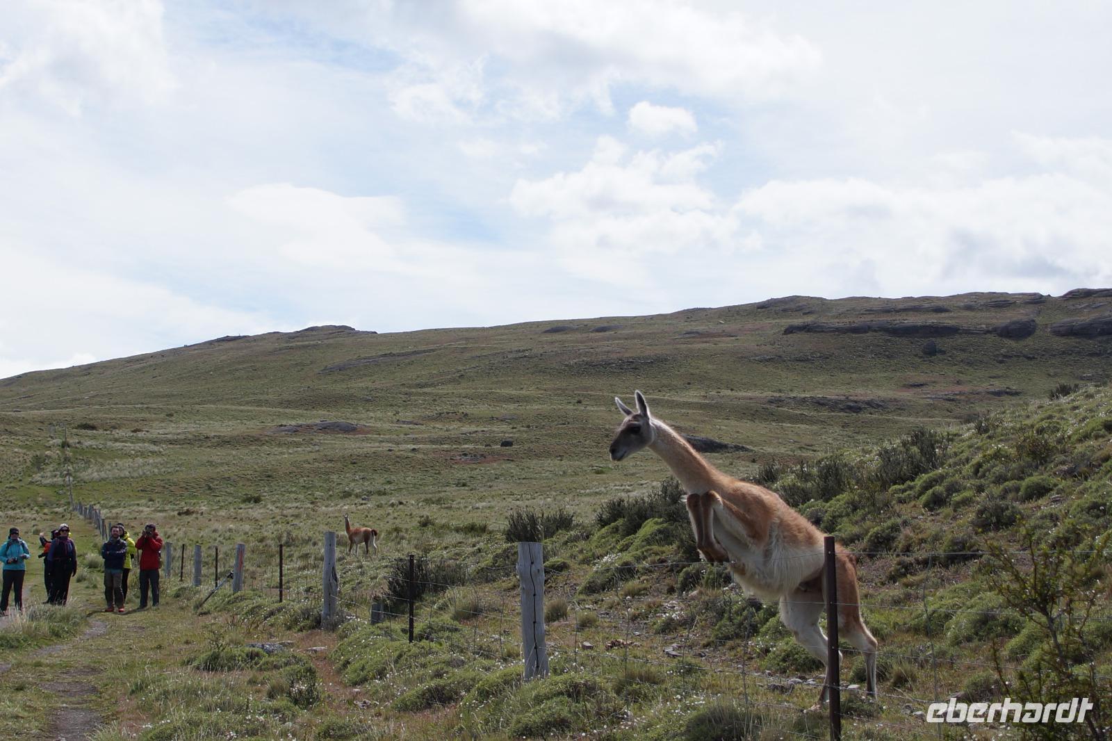 Am Zaun kreuzen die Guanacos zwischen Estancia und Park und genau das erlebten wir, als einige Guanacos, anstatt vor uns zu flüchten uns nur kurz sondierten, als Menschen wohl für harmlos erachteten und in unserer Anwesenheit den Zaun überquerten.